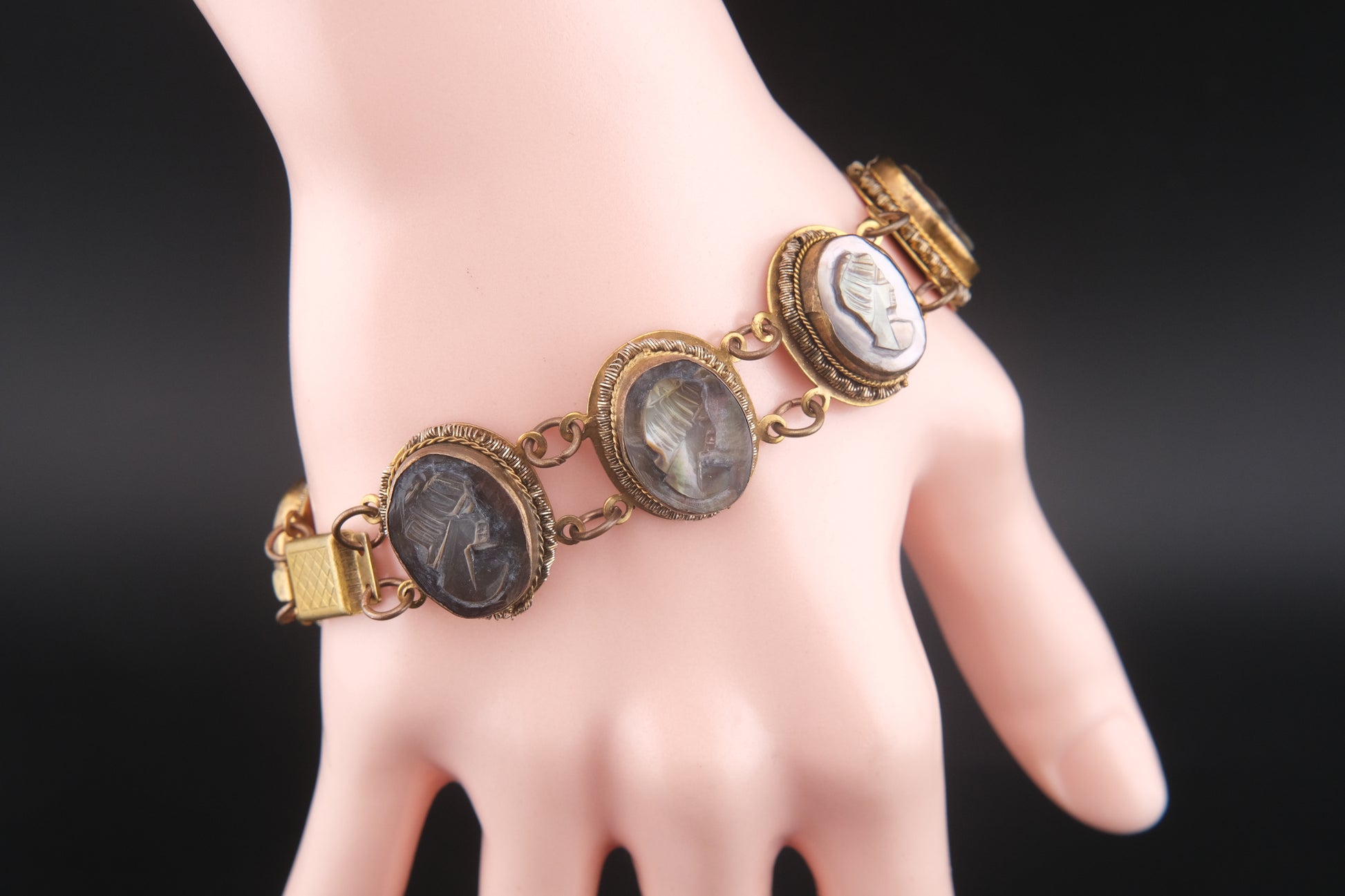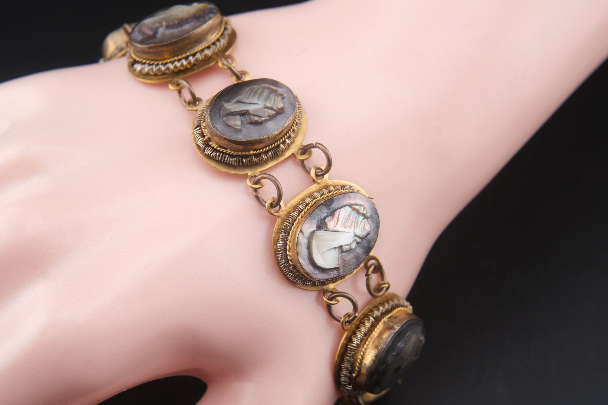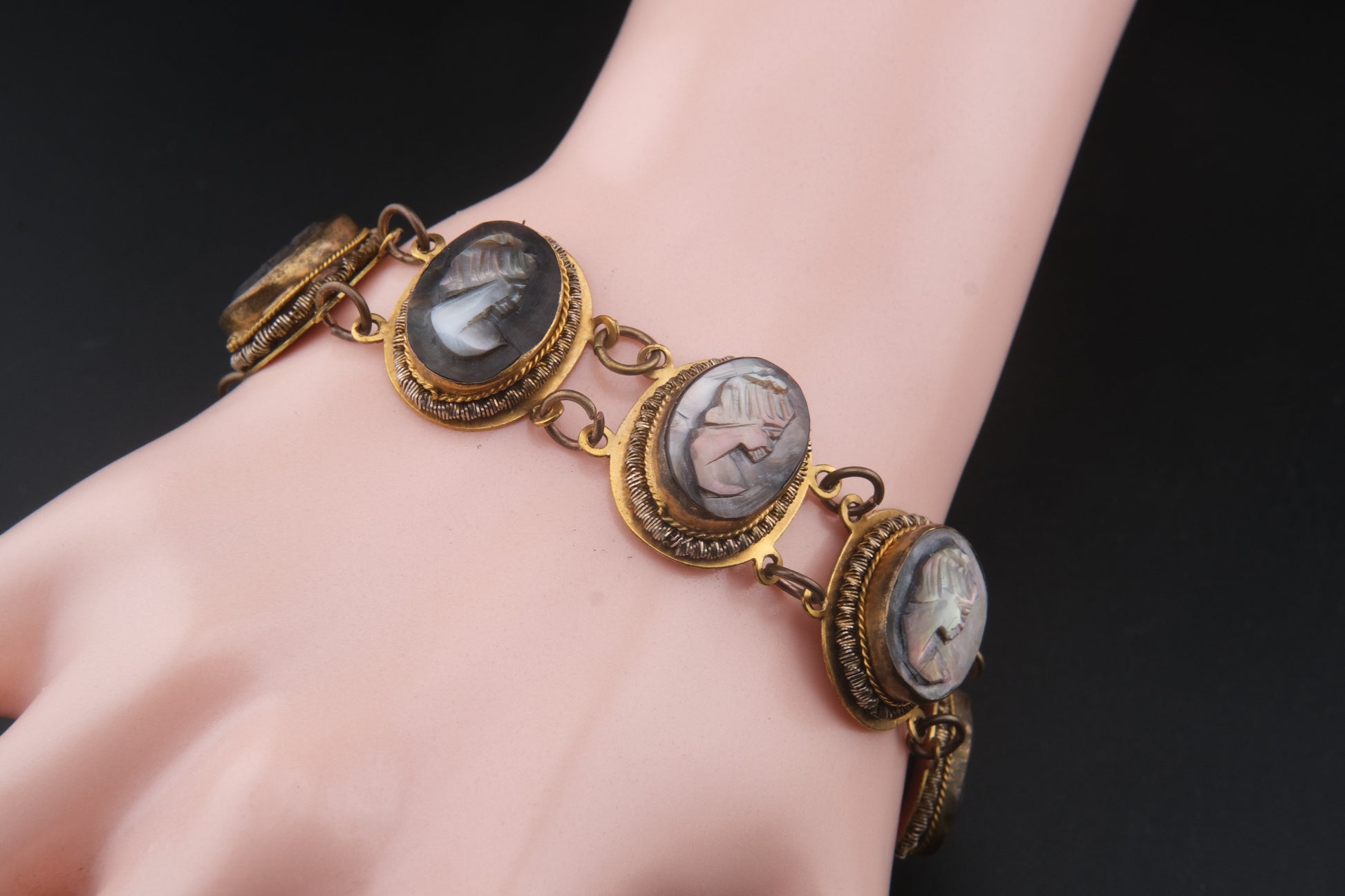 Vintage Mother of Pearl Cameo Bracelet – 7" Hand-Carved Profile Medallions