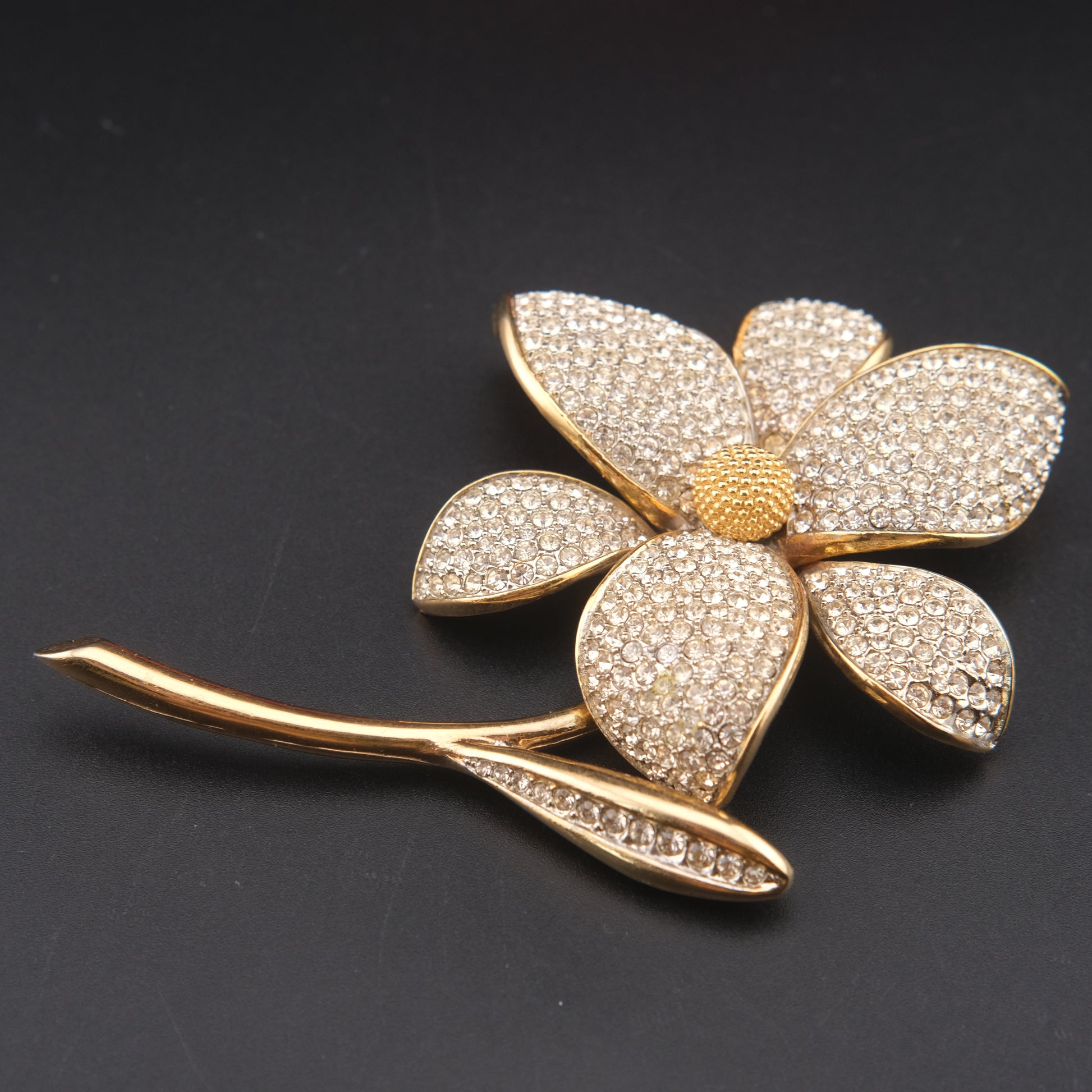 Elevate your collection with this stunning vintage brooch by iconic American designer Nettie Rosenstein. Crafted in rich gold-tone metal, the brooch is designed as a five-petal flower accented with a crystal-encrusted stem and textured gold center. Each petal sparkles with dozens of handset clear rhinestones, creating a timeless, glamorous look.