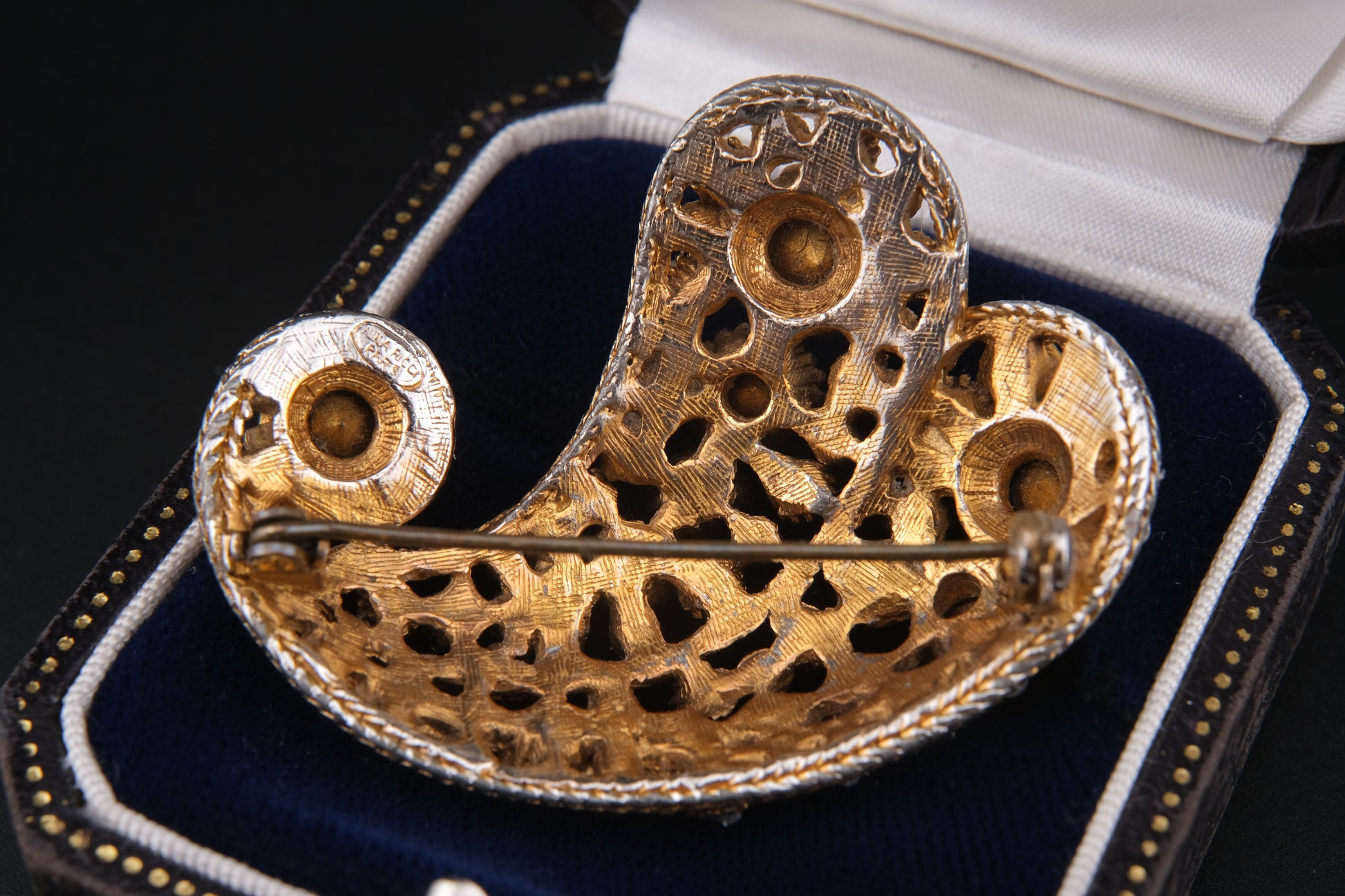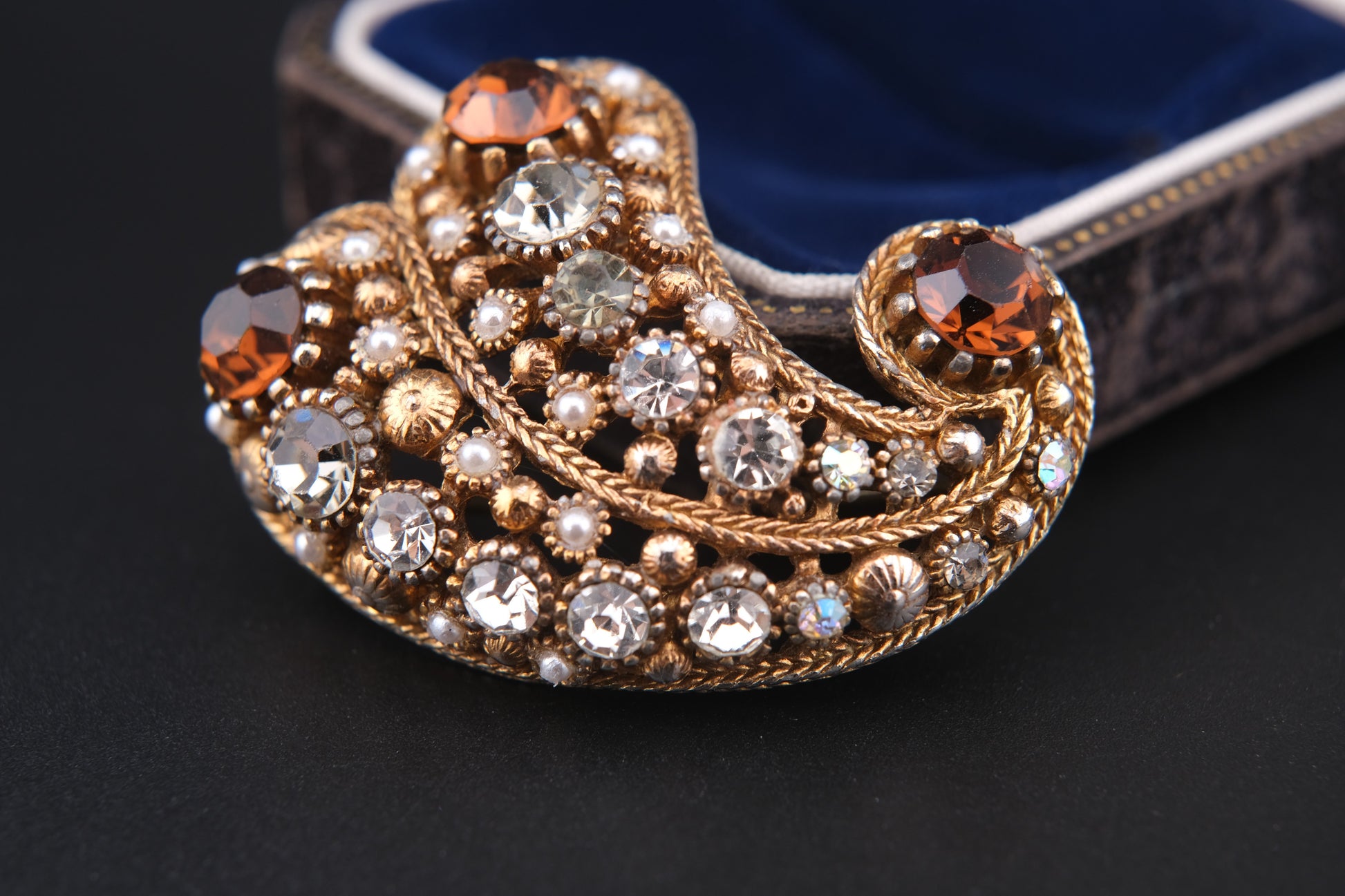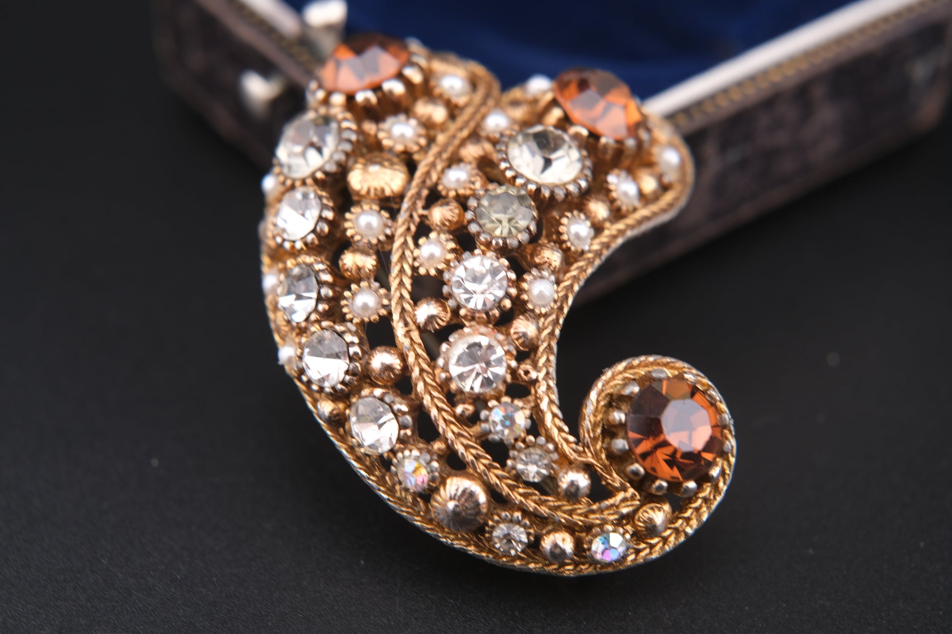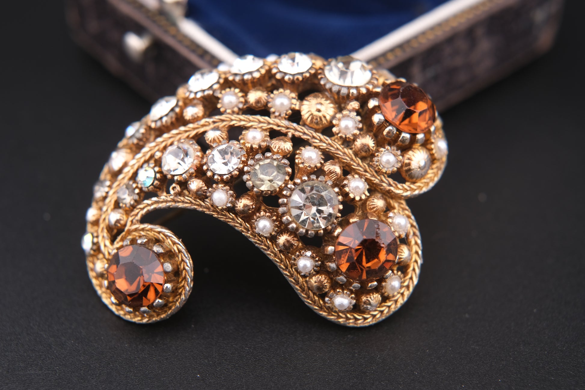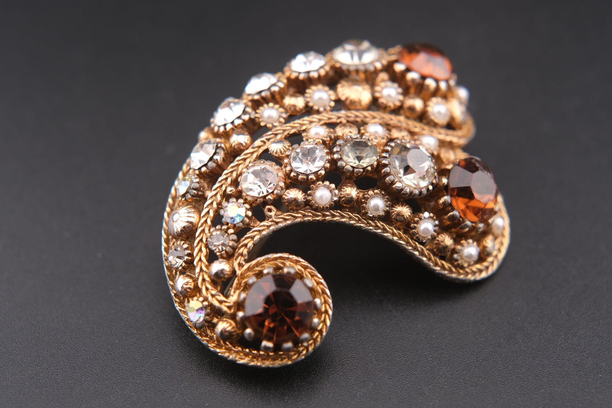 This exquisite vintage brooch by Nina Ricci features a swirling Paisley motif, masterfully crafted in intricate gold-tone filigree. Embellished with clear rhinestones, topaz-colored stones, and delicate faux pearls, it captures both luxury and timeless design. A rare collector’s piece, it adds instant sophistication to any outfit—whether worn on a coat lapel or an elegant evening dress. Despite minor signs of age on the metal surface, especially on the back, this brooch still looks stunning when worn and remains structurally sound.