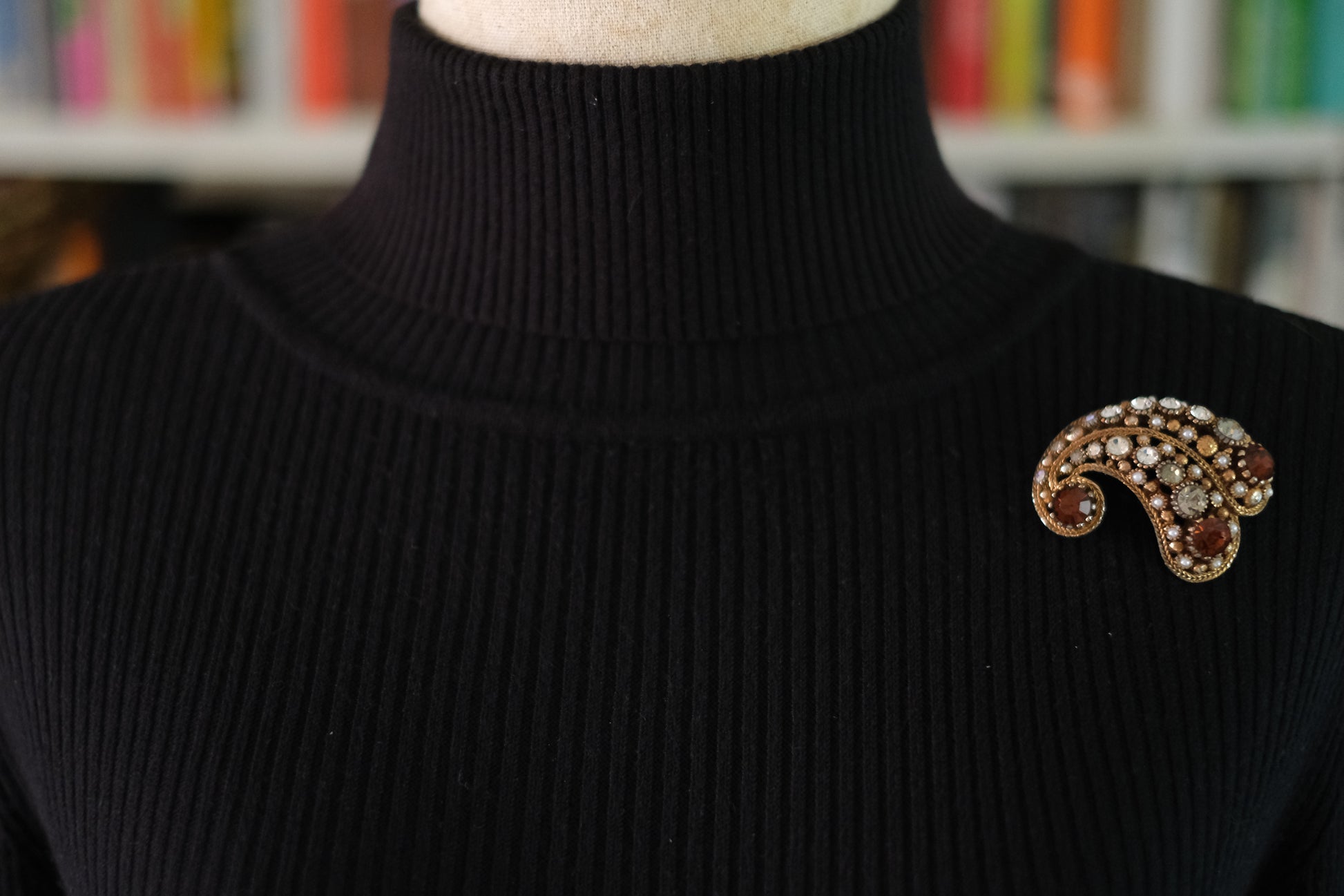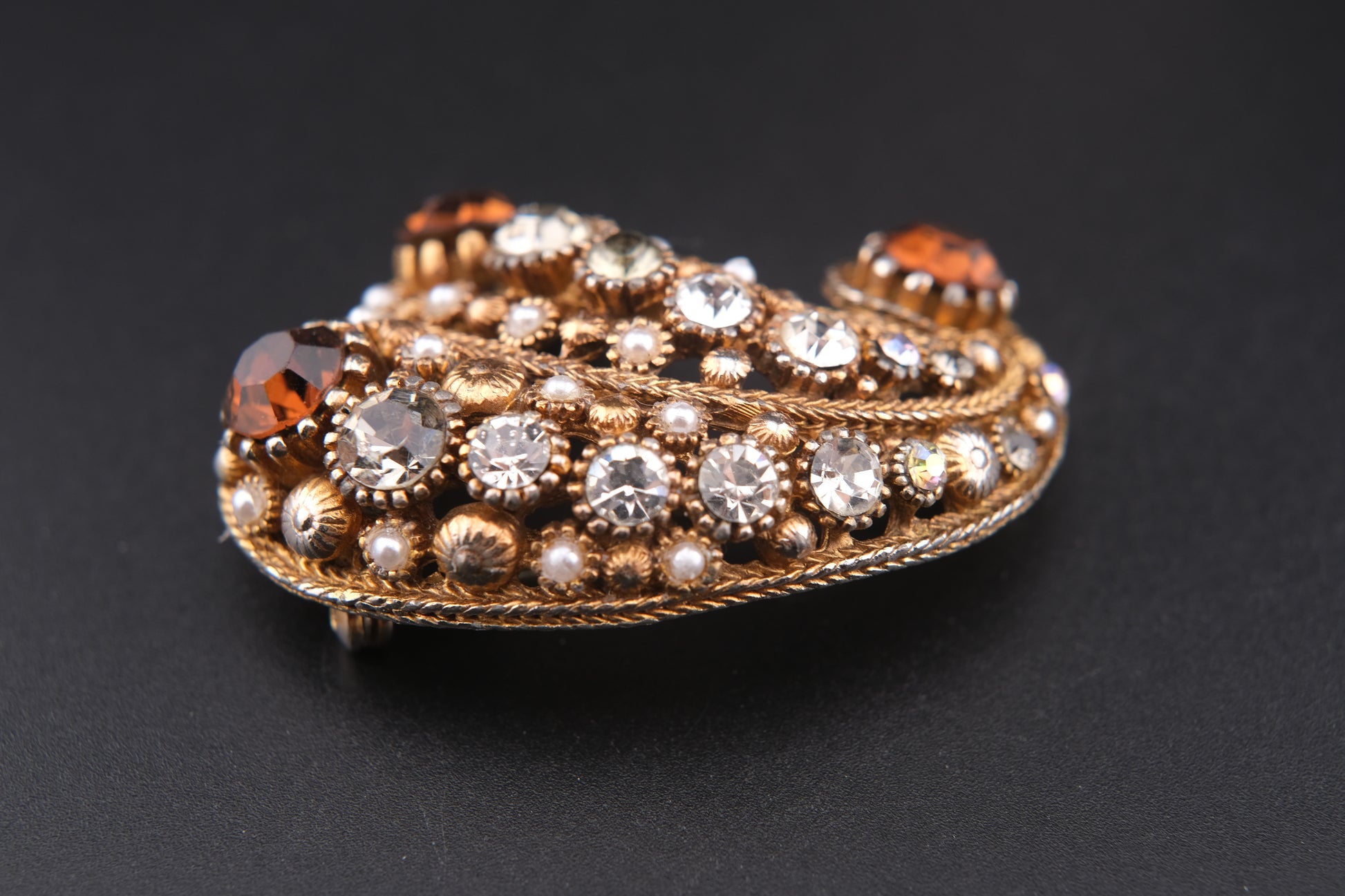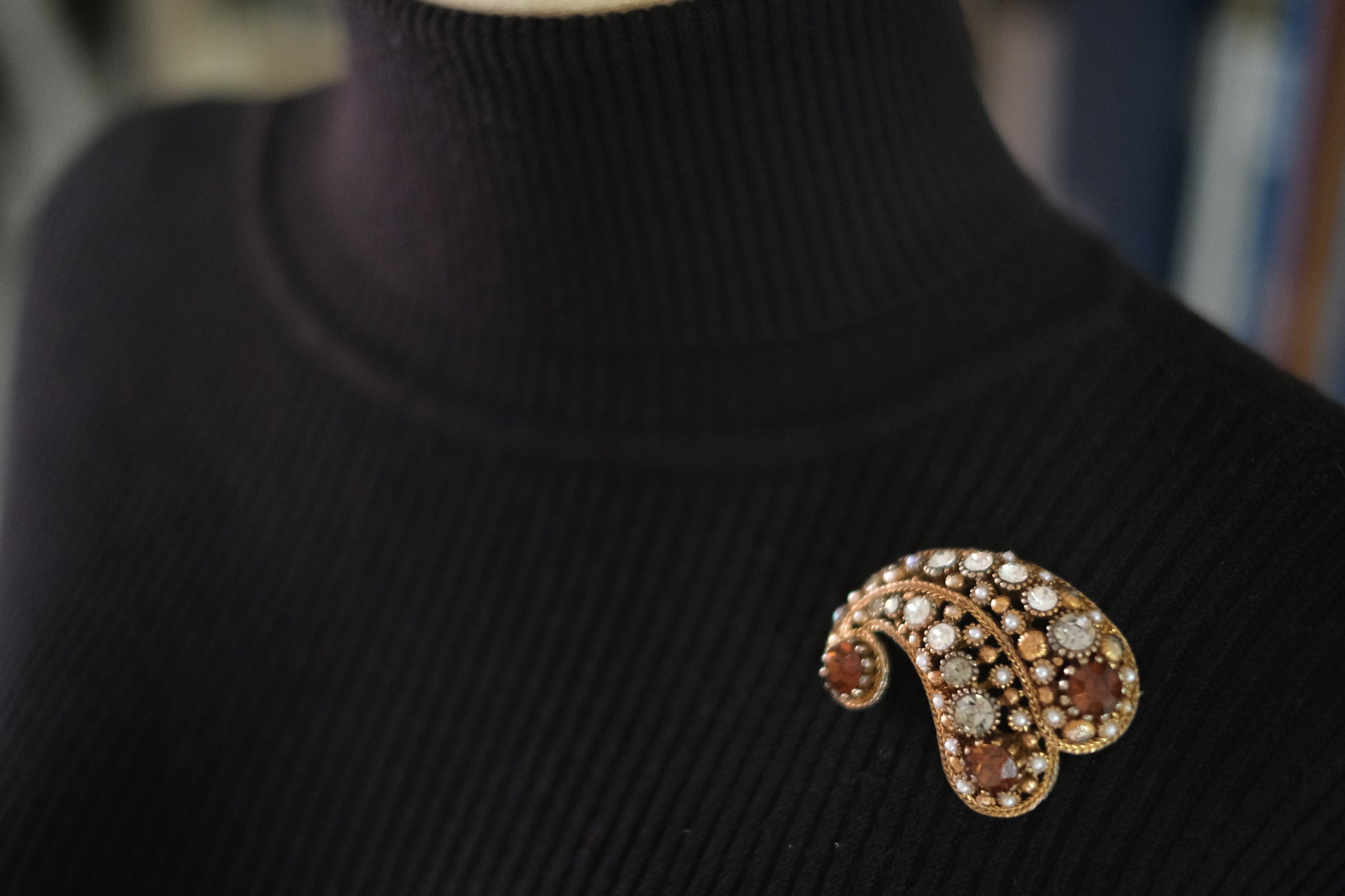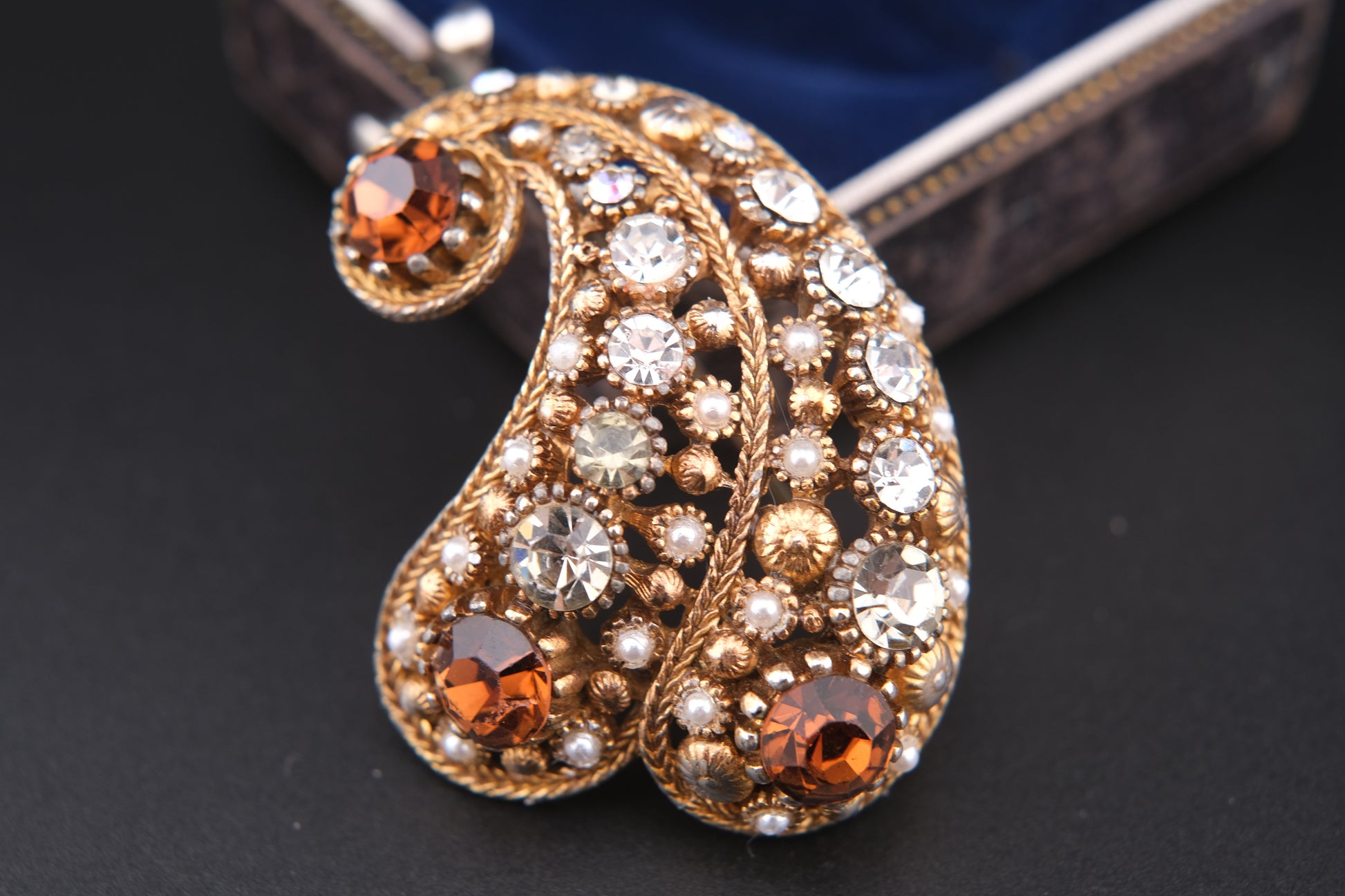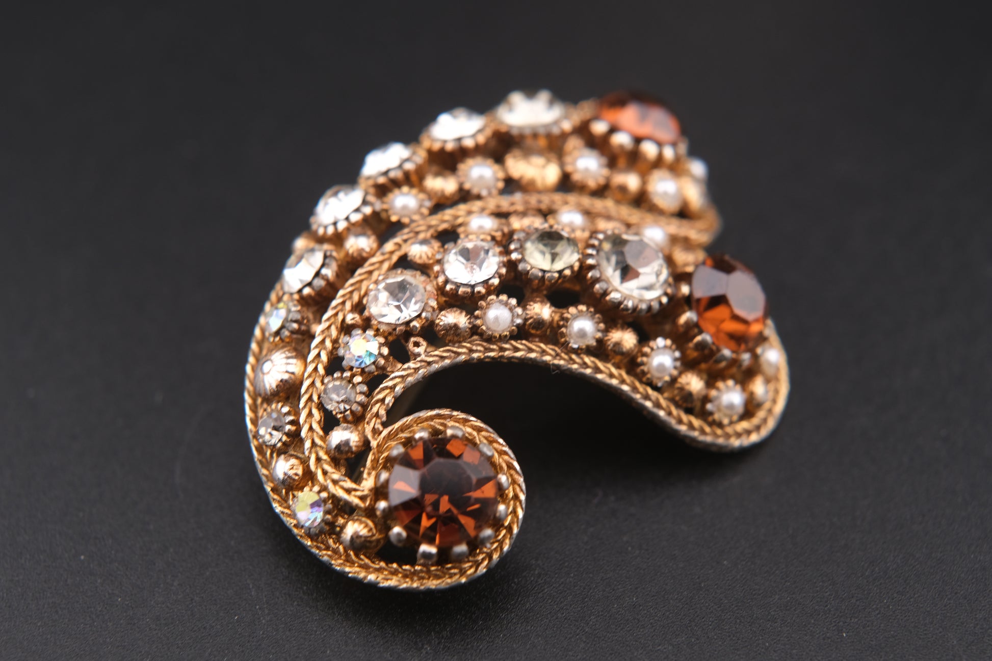 Vintage Nina Ricci Paisley Brooch – Gold-Tone with Rhinestones & Faux Pearls