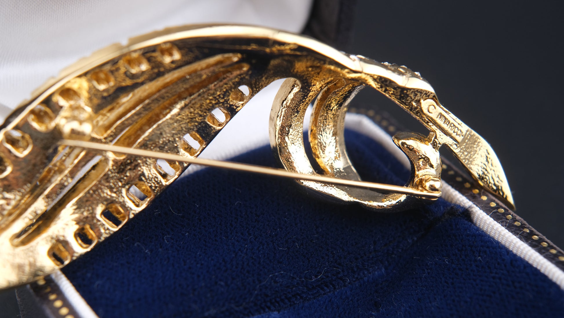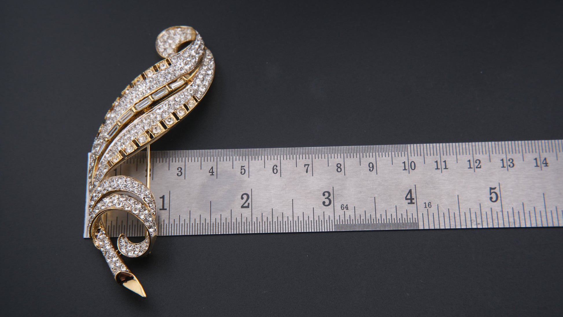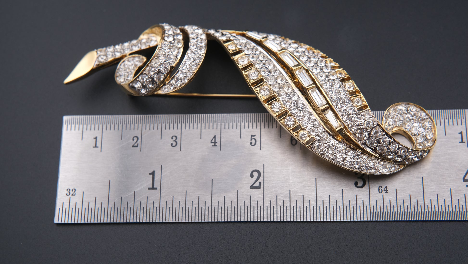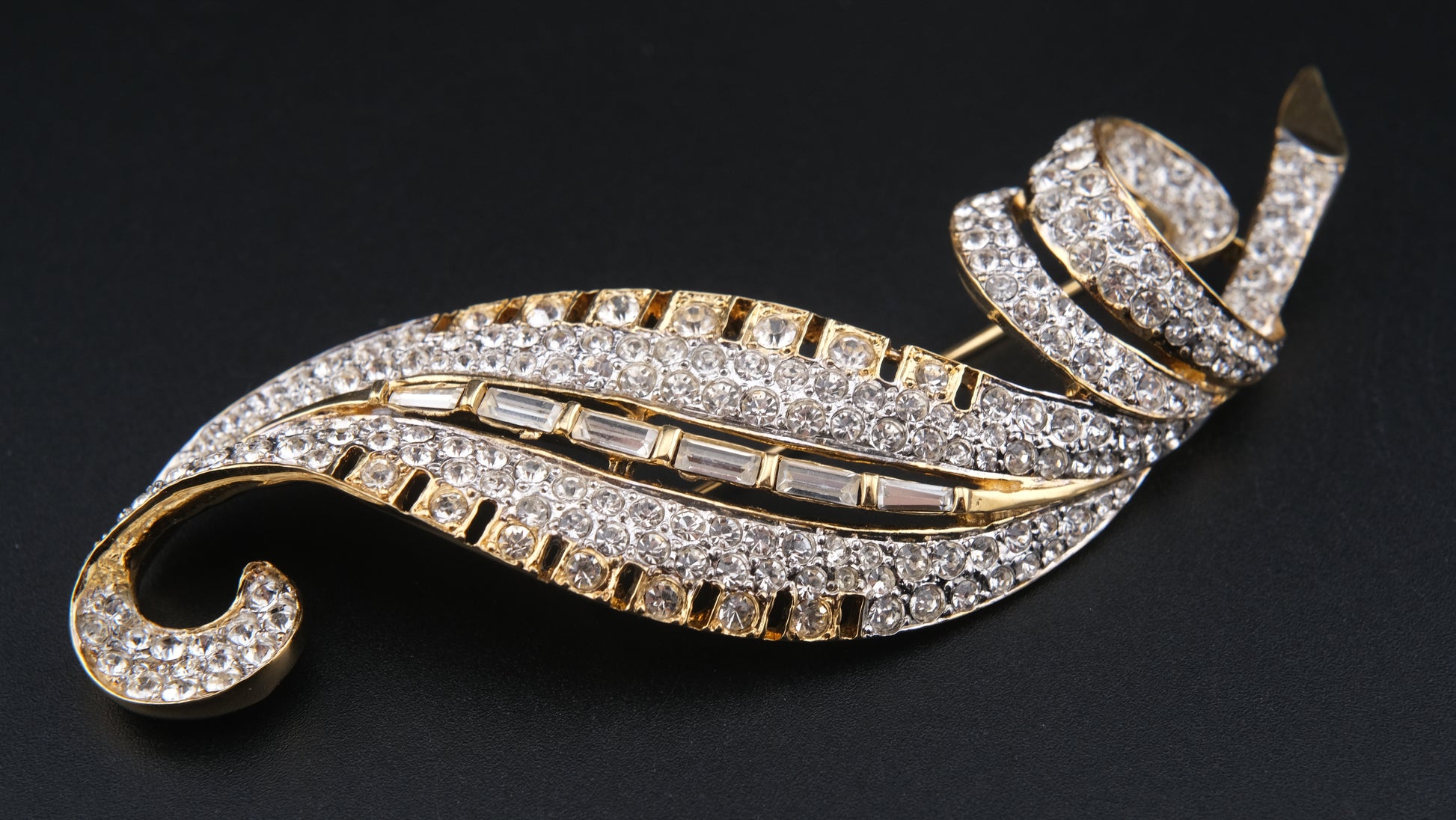 Add a touch of timeless French elegance to your collection with this exquisite vintage Nina Ricci brooch. Crafted in a lustrous gold-tone finish, the design features a graceful, stylized leaf silhouette adorned with rows of brilliant round rhinestones and baguette-cut accents. The combination of sparkling stones and flowing contours captures the perfect balance of glamour and sophistication, making it an ideal statement piece for any occasion.