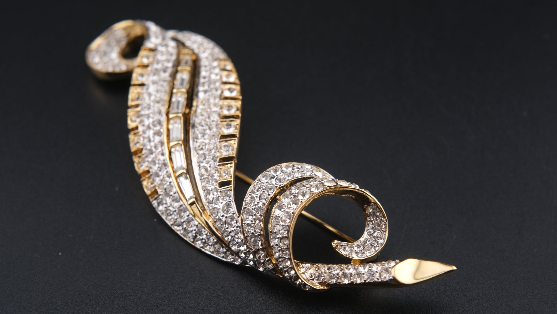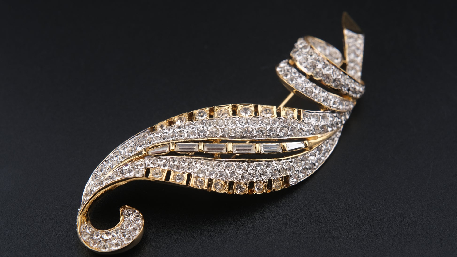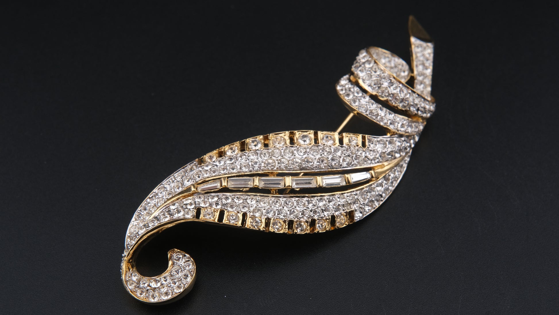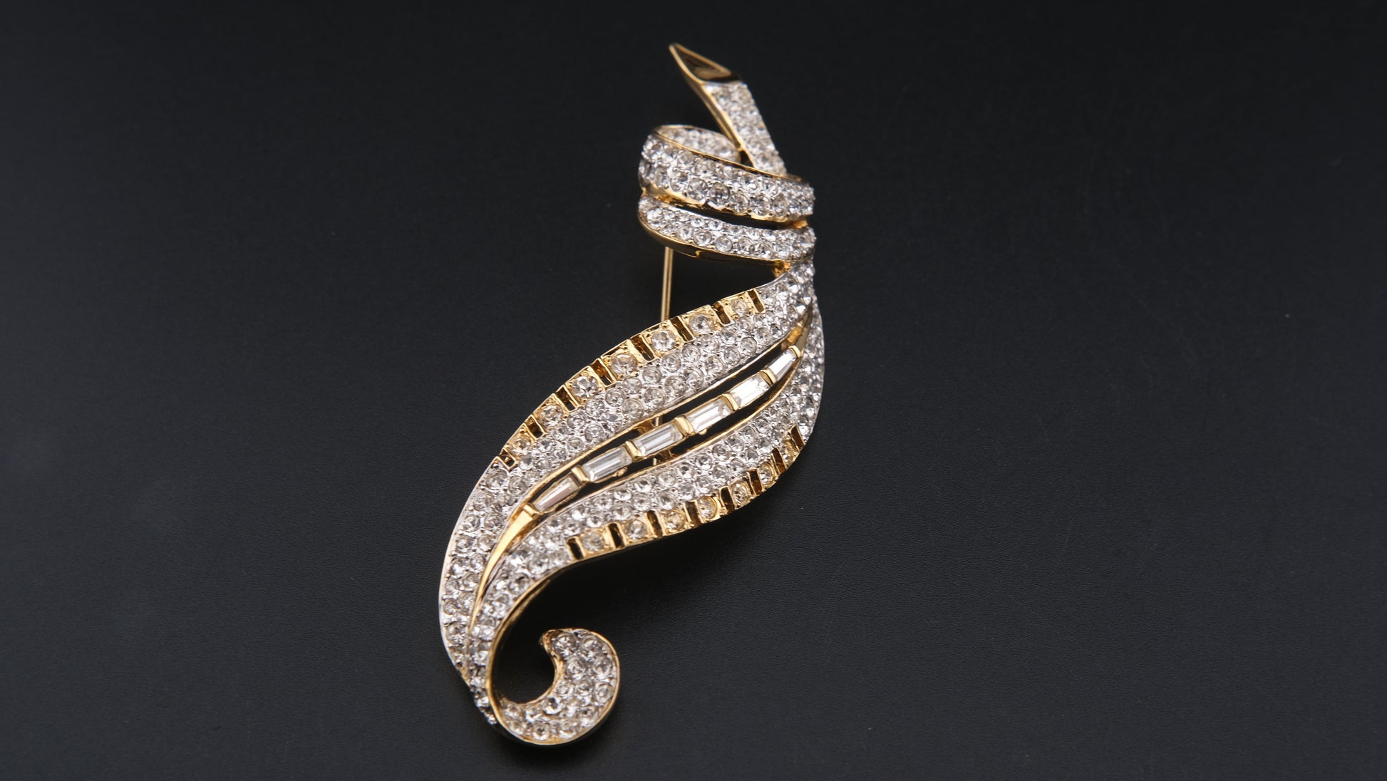 Vintage Nina Ricci Paris Leaf Brooch – Gold-Tone with Clear Round & Baguette Rhinestones