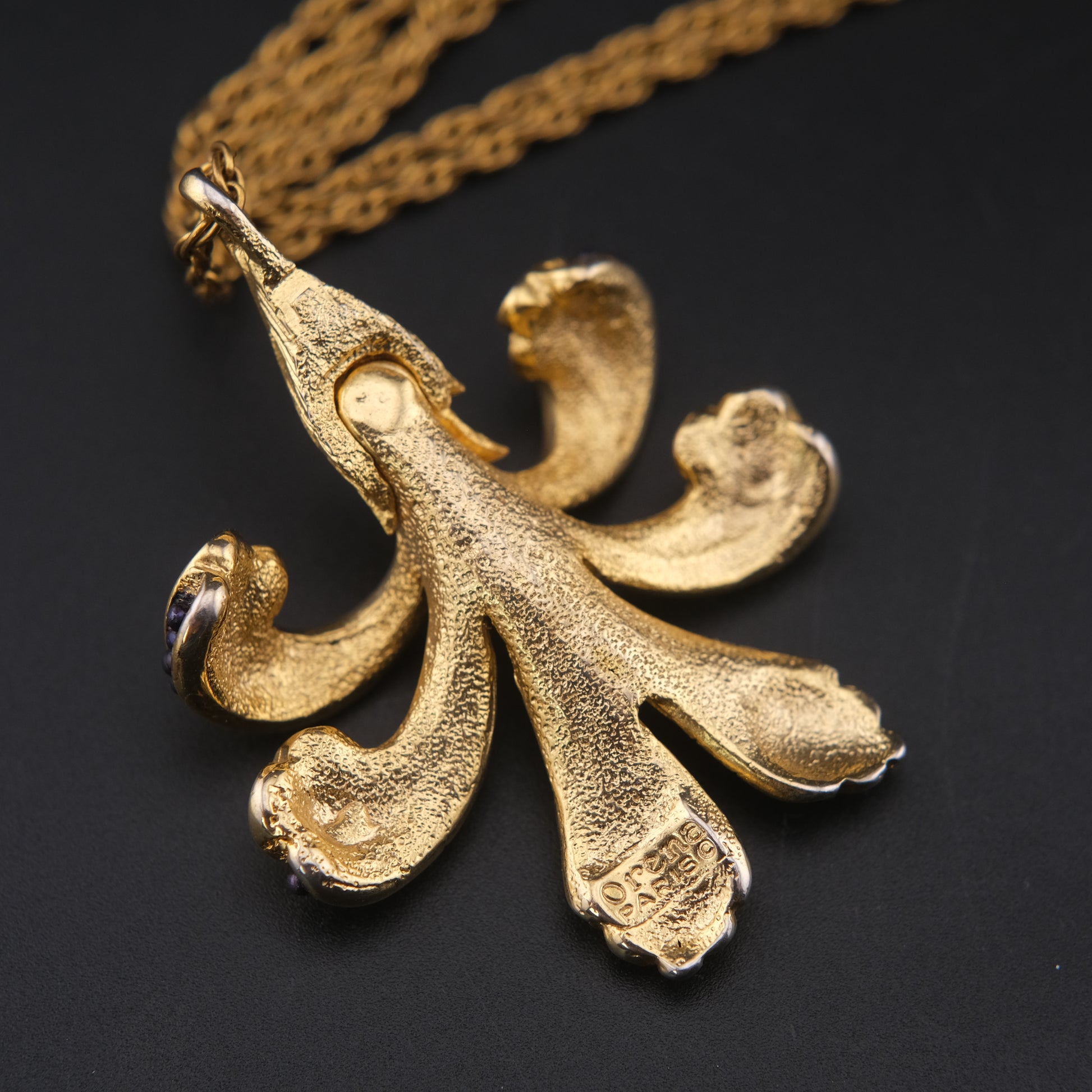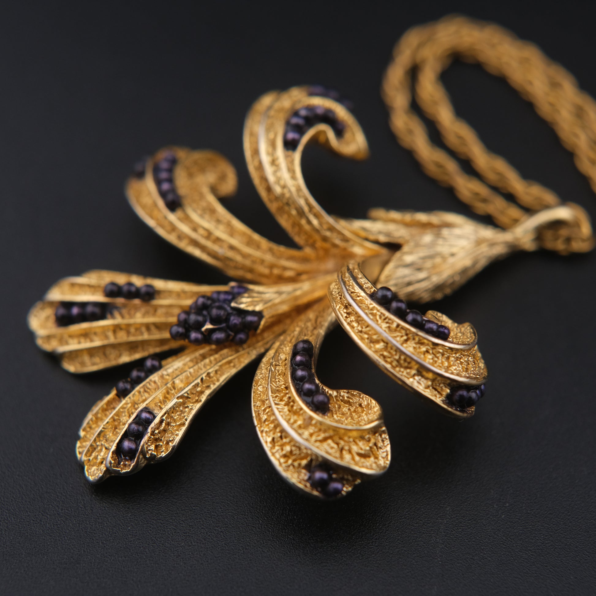 Make a bold statement with this vintage pendant necklace by Orena Paris, renowned for their artistic and dramatic costume jewelry designs. The pendant features a dynamic, stylized floral motif crafted in textured gold-tone metal, embellished with clusters of purple bead accents for a regal and elegant contrast. Its sweeping lines and dimensional form capture the signature Orena Paris aesthetic of opulence and French sophistication.