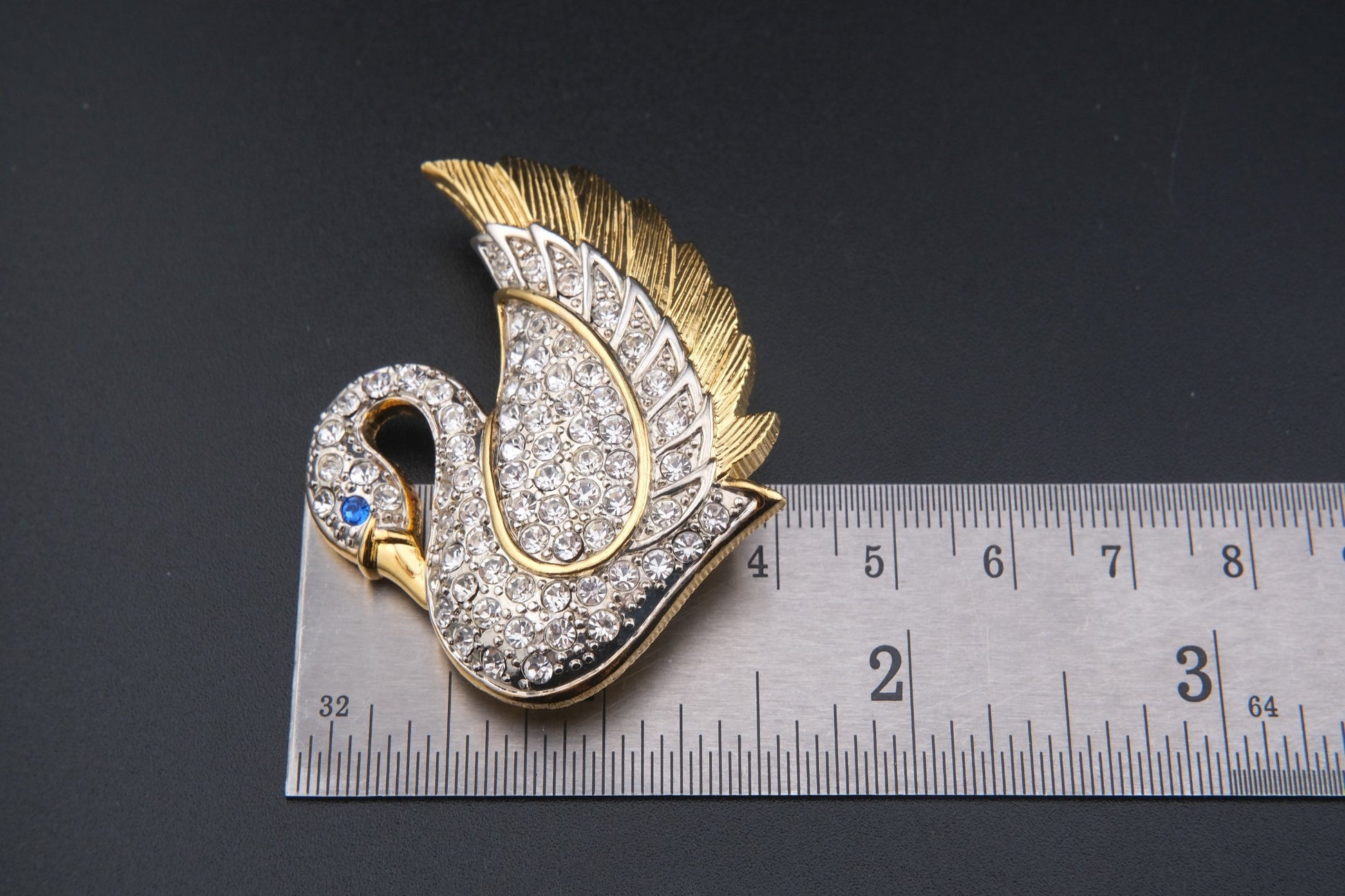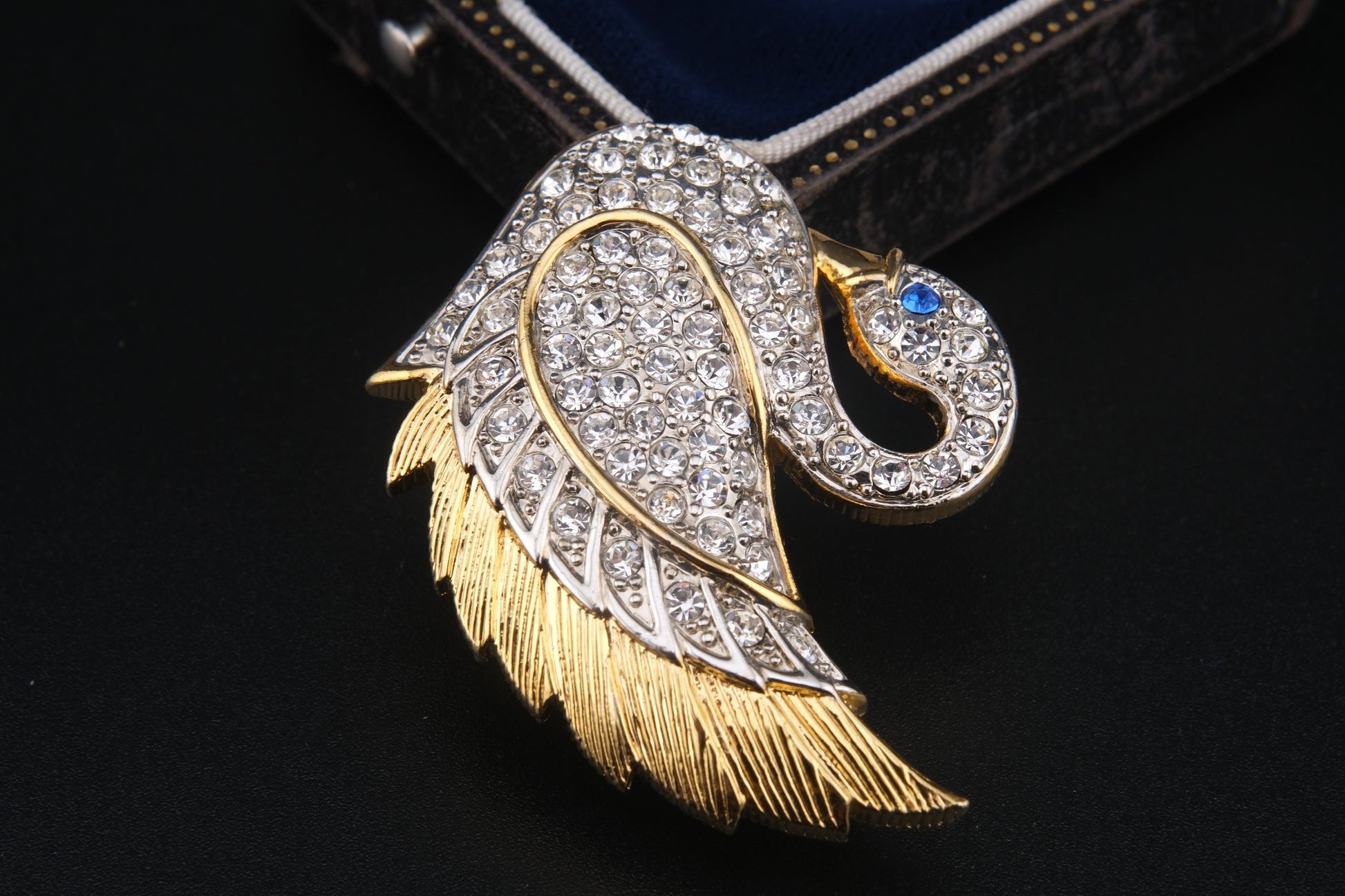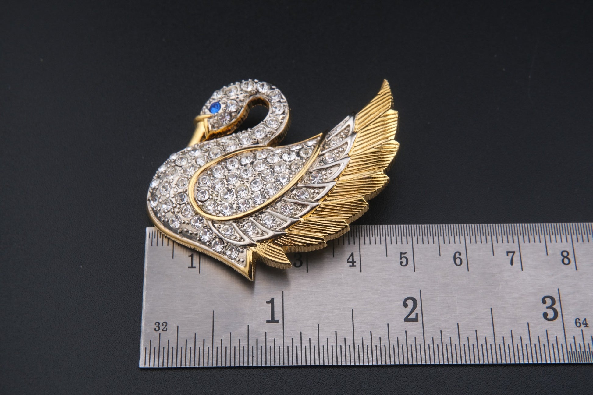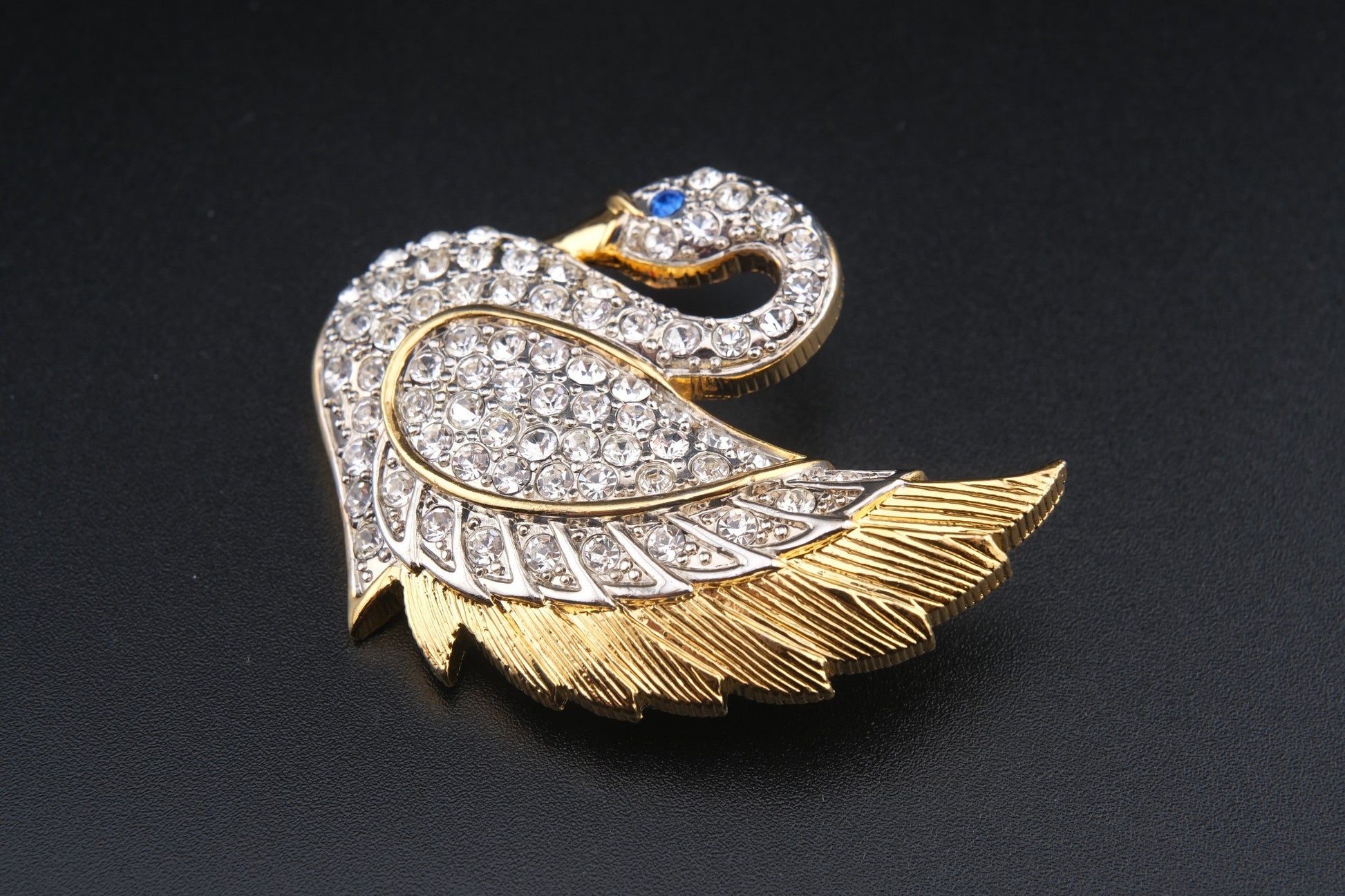 - Design: Stylized swan brooch with full pavé rhinestone body and textured wing