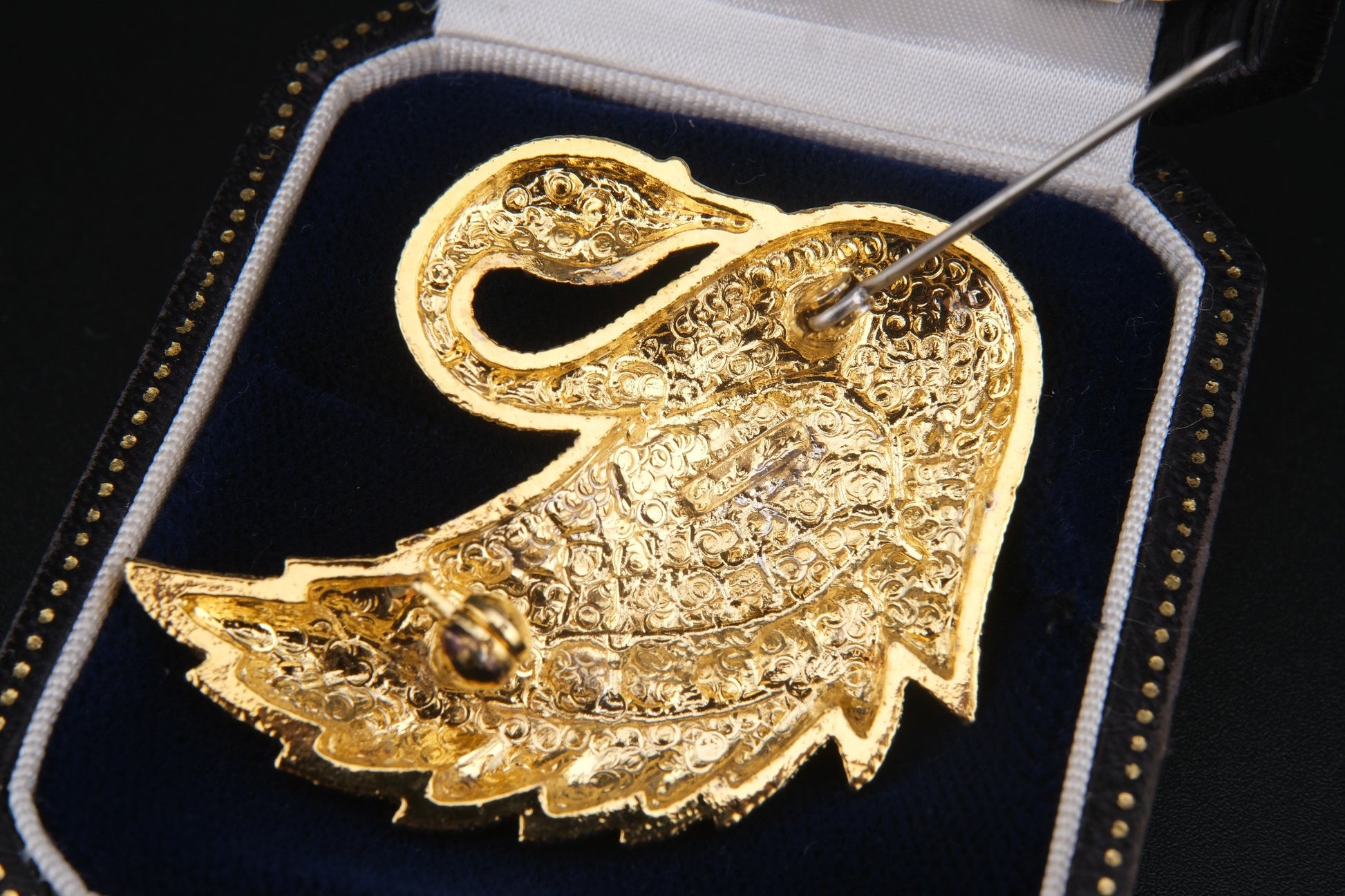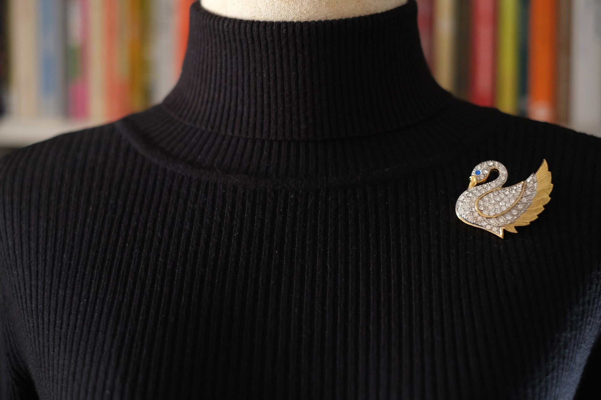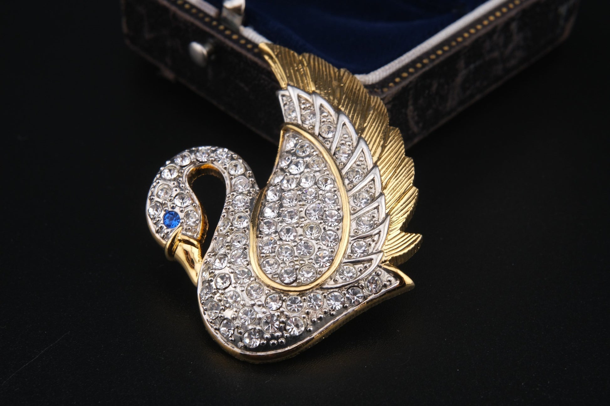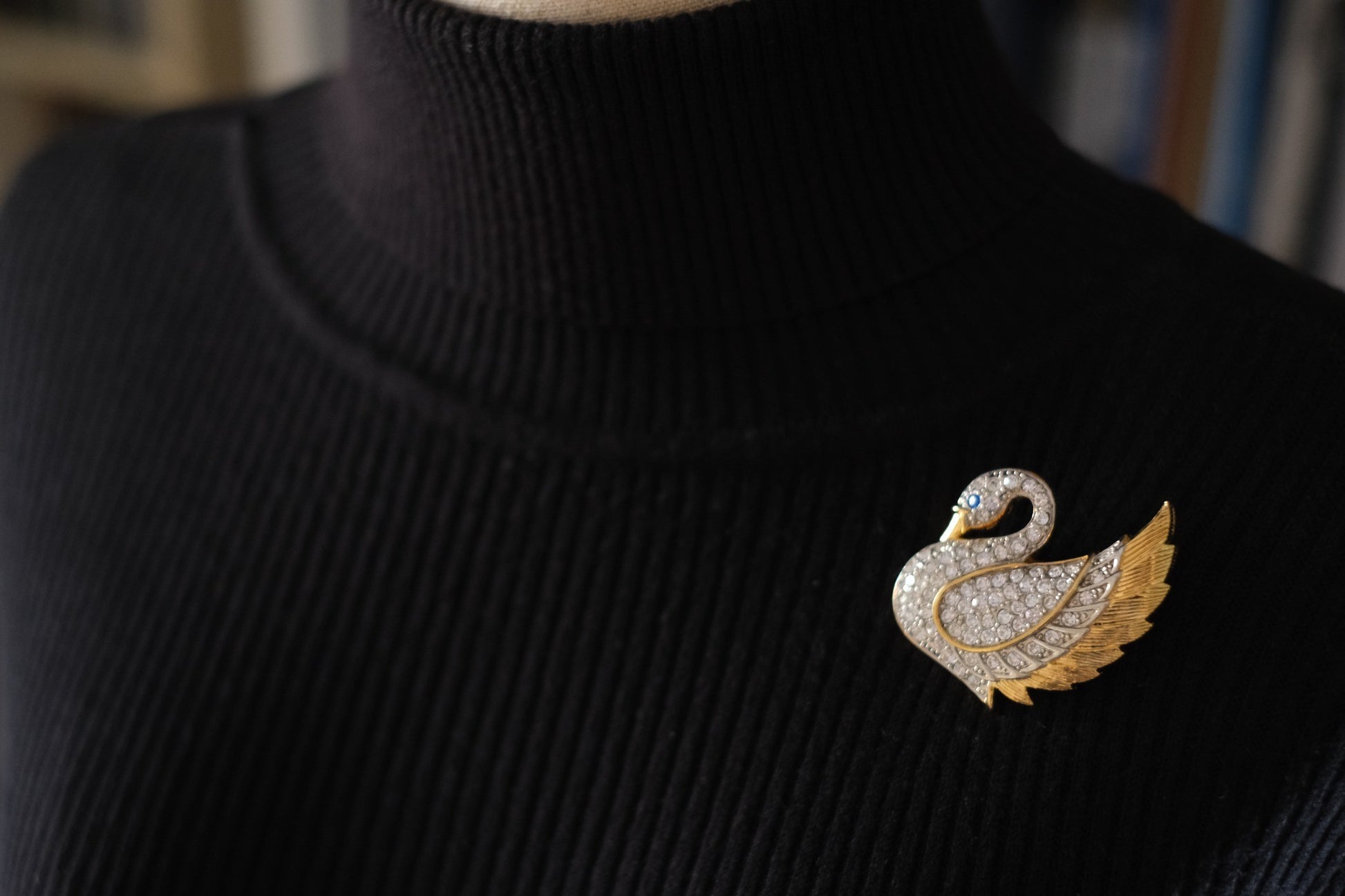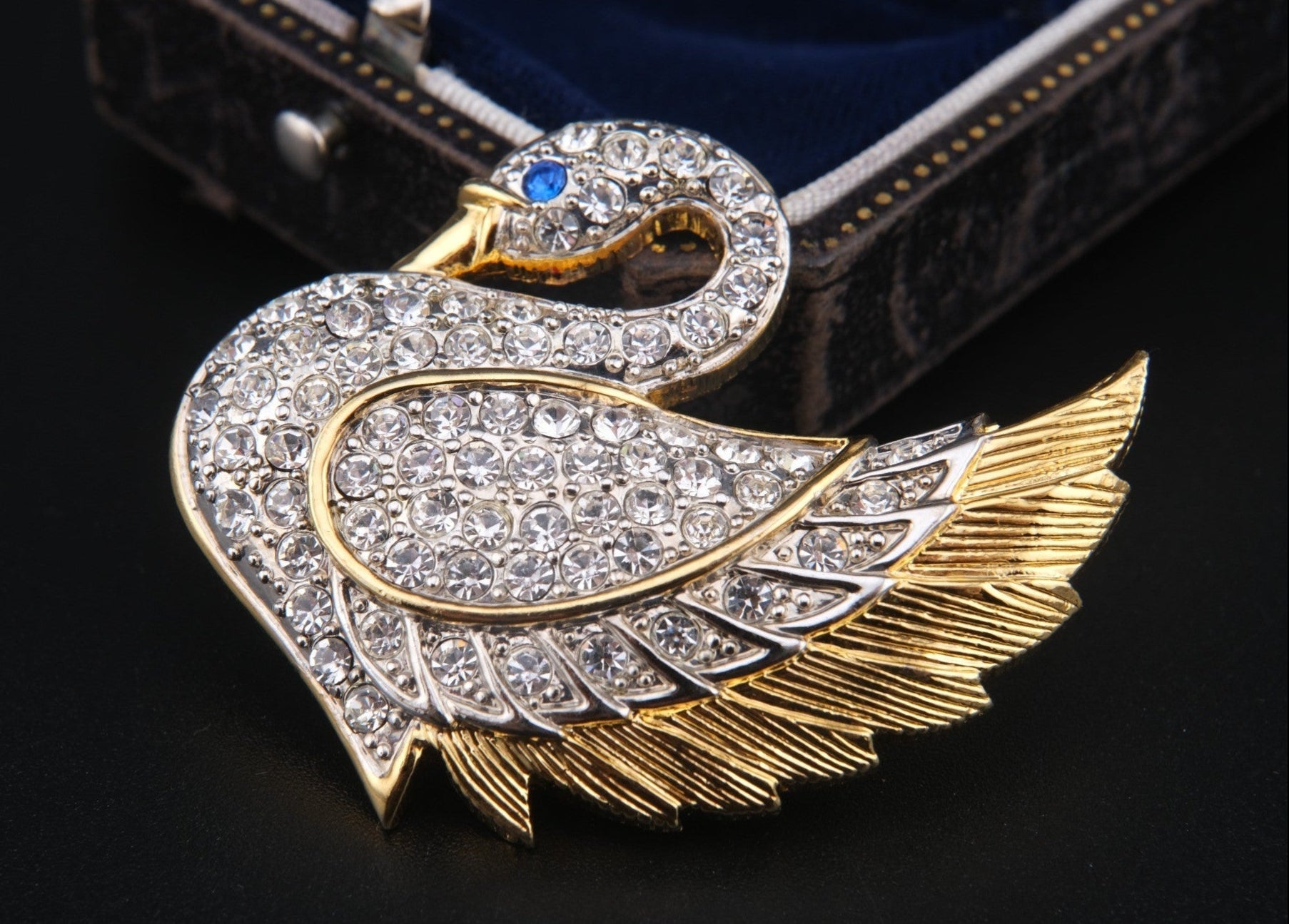 - Design: Stylized swan brooch with full pavé rhinestone body and textured wing