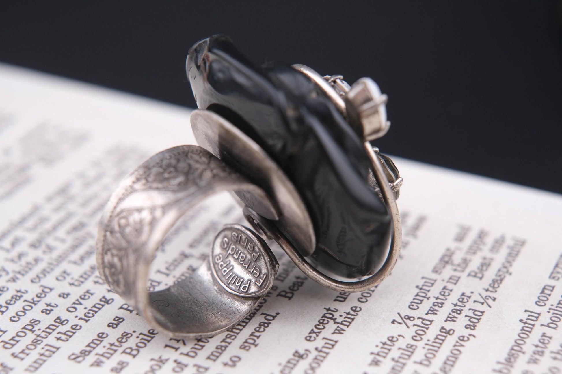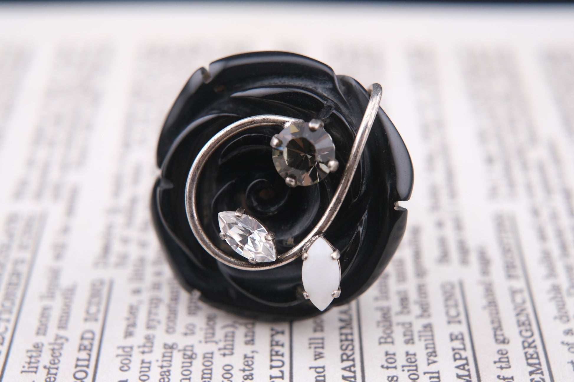 Vintage Philippe Ferrandis Paris Black Resin Rose Statement Ring with Crystals