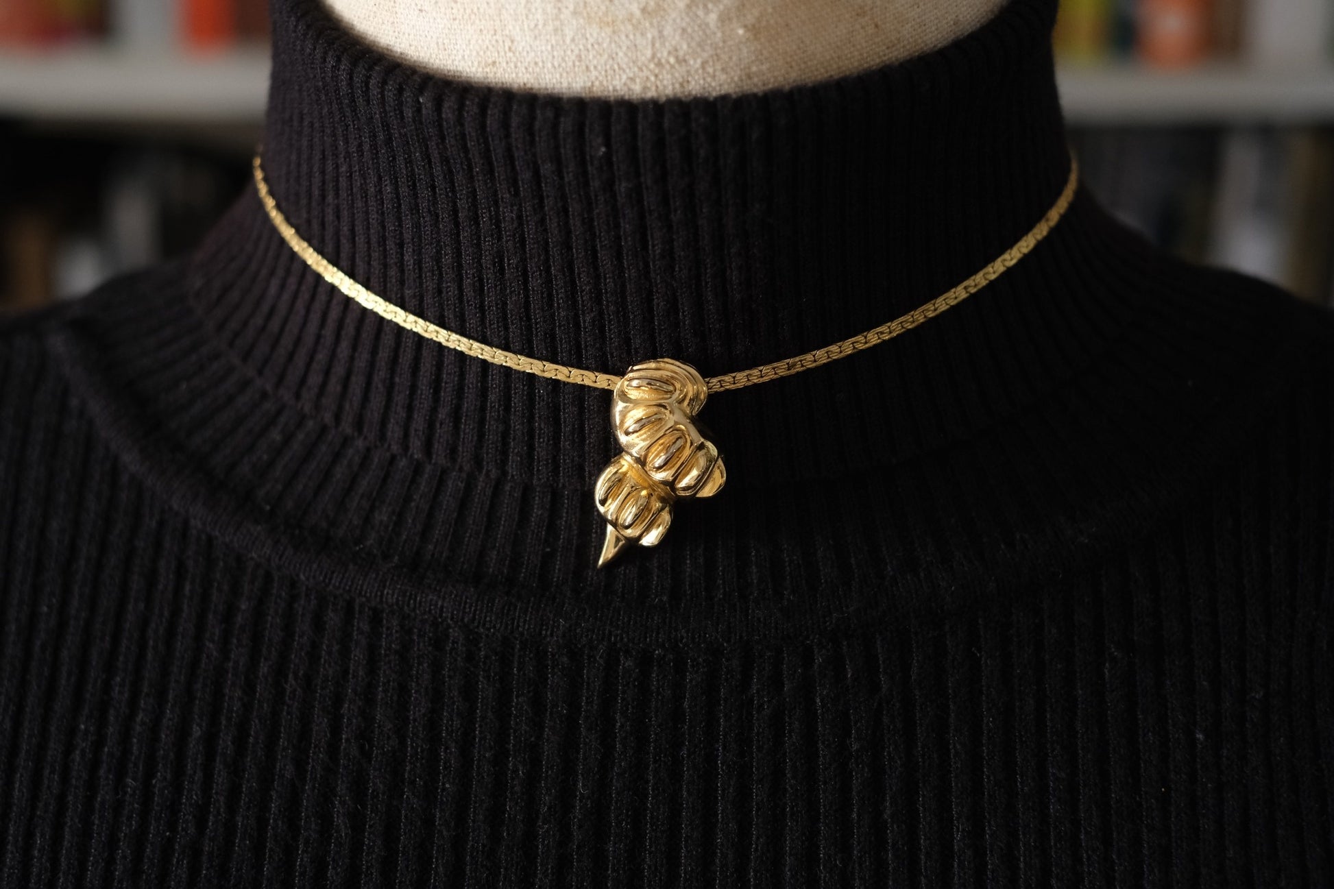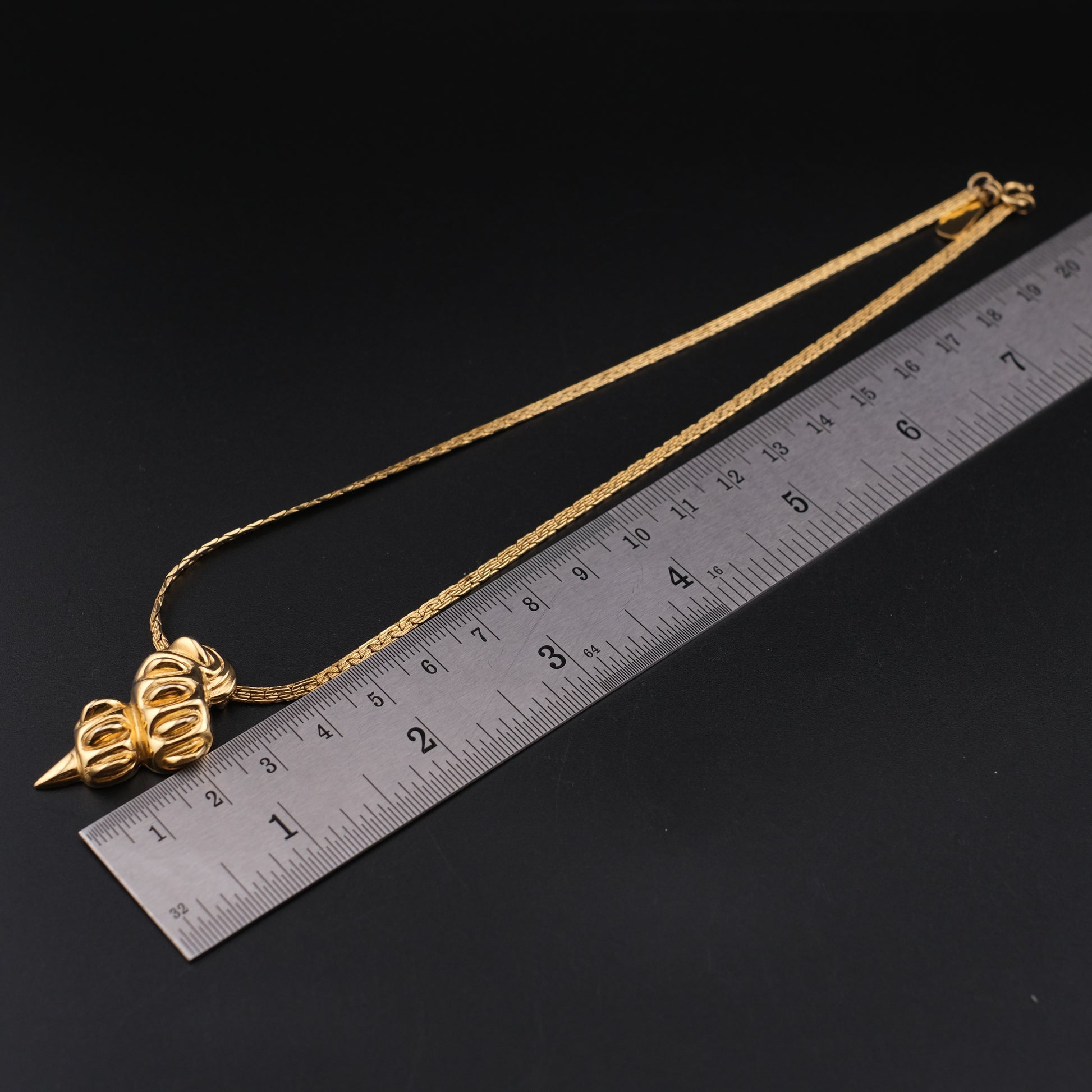Elevate your look with this signed Pierre Balmain vintage pendant necklace, a true example of Parisian elegance. Crafted in rich gold-tone metal, the design features a bold, sculptural medallion pendant with fluid, dimensional detailing. The pendant hangs from a textured chain, striking a perfect balance between minimalist chic and avant-garde design.