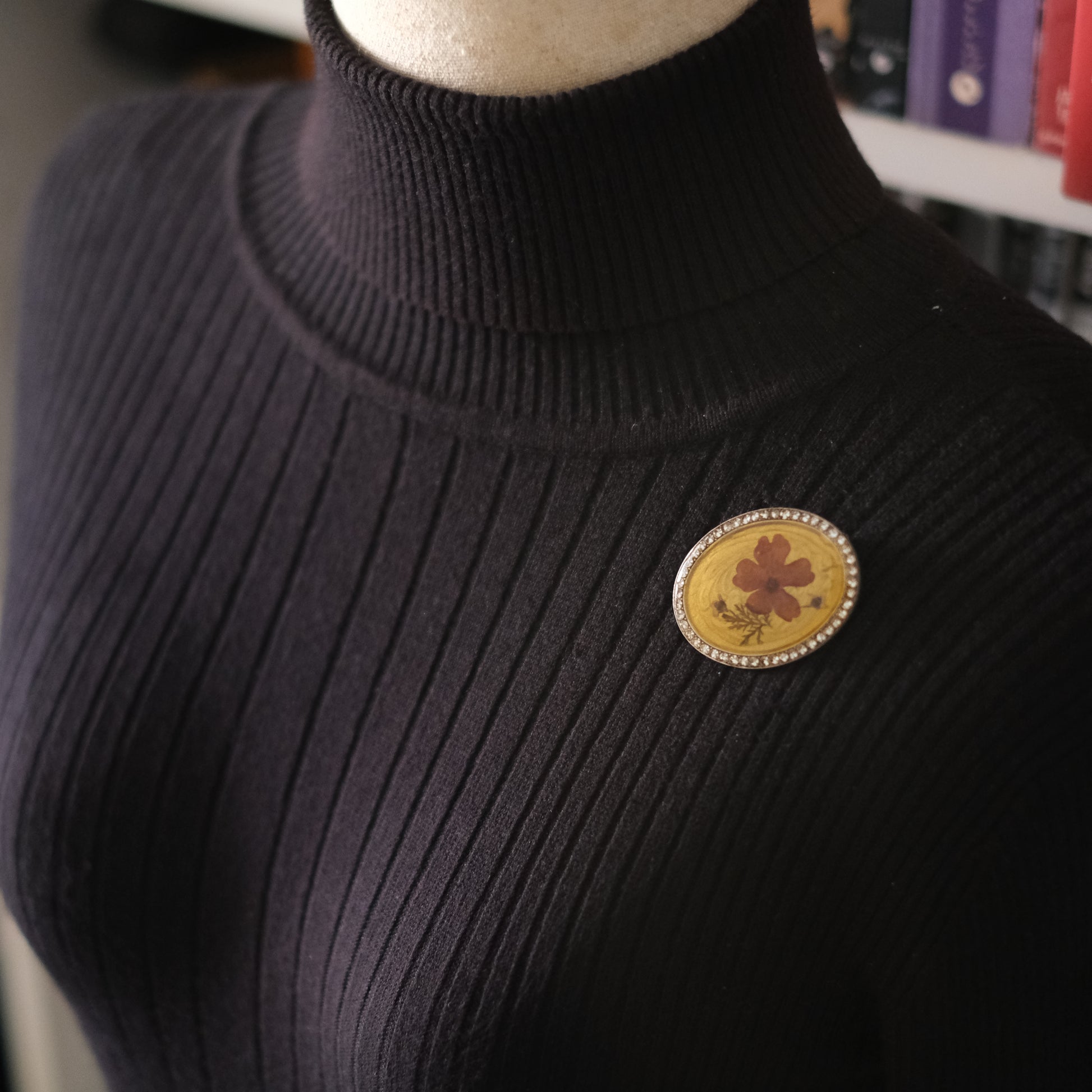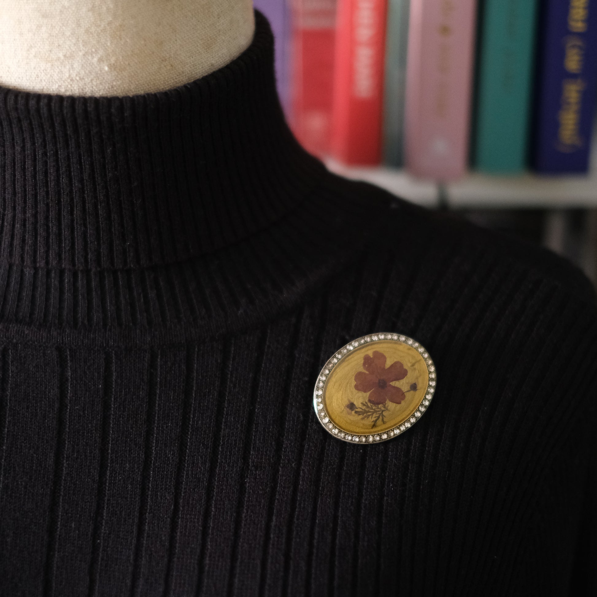 - Design: Flat oval brooch with botanical motif and rhinestone trim