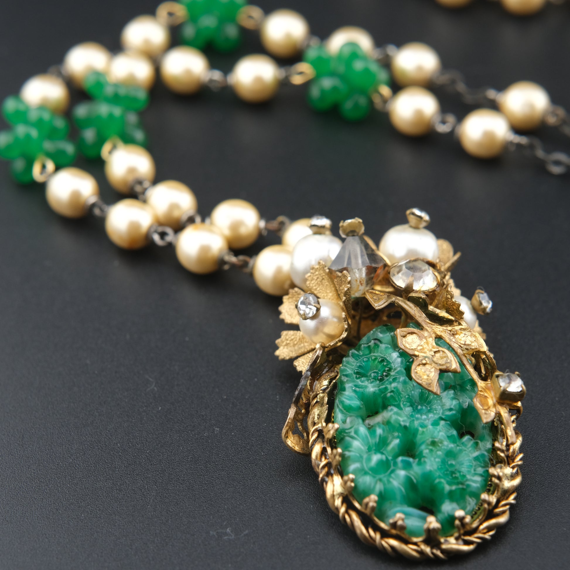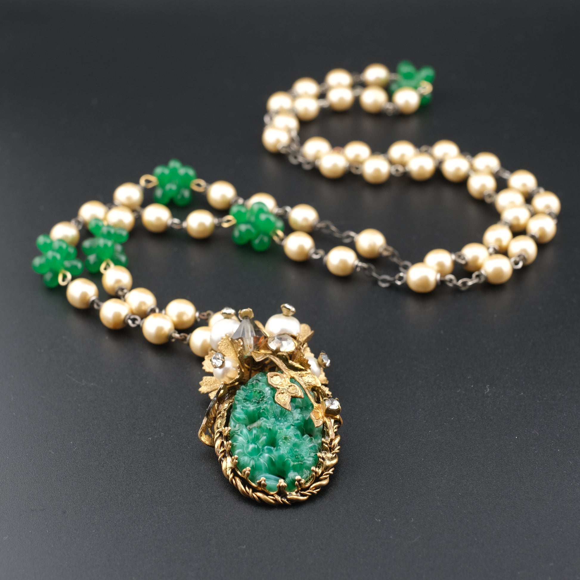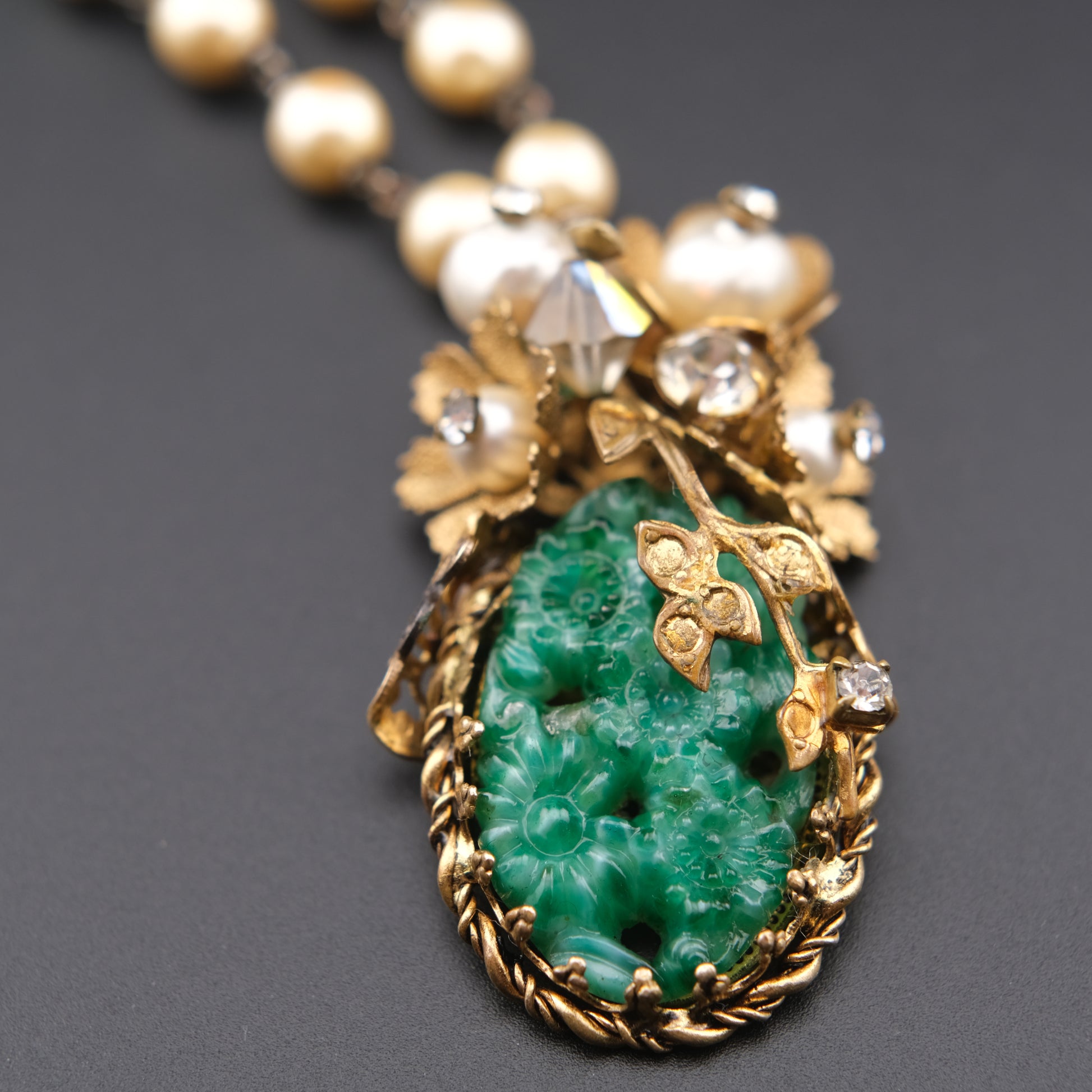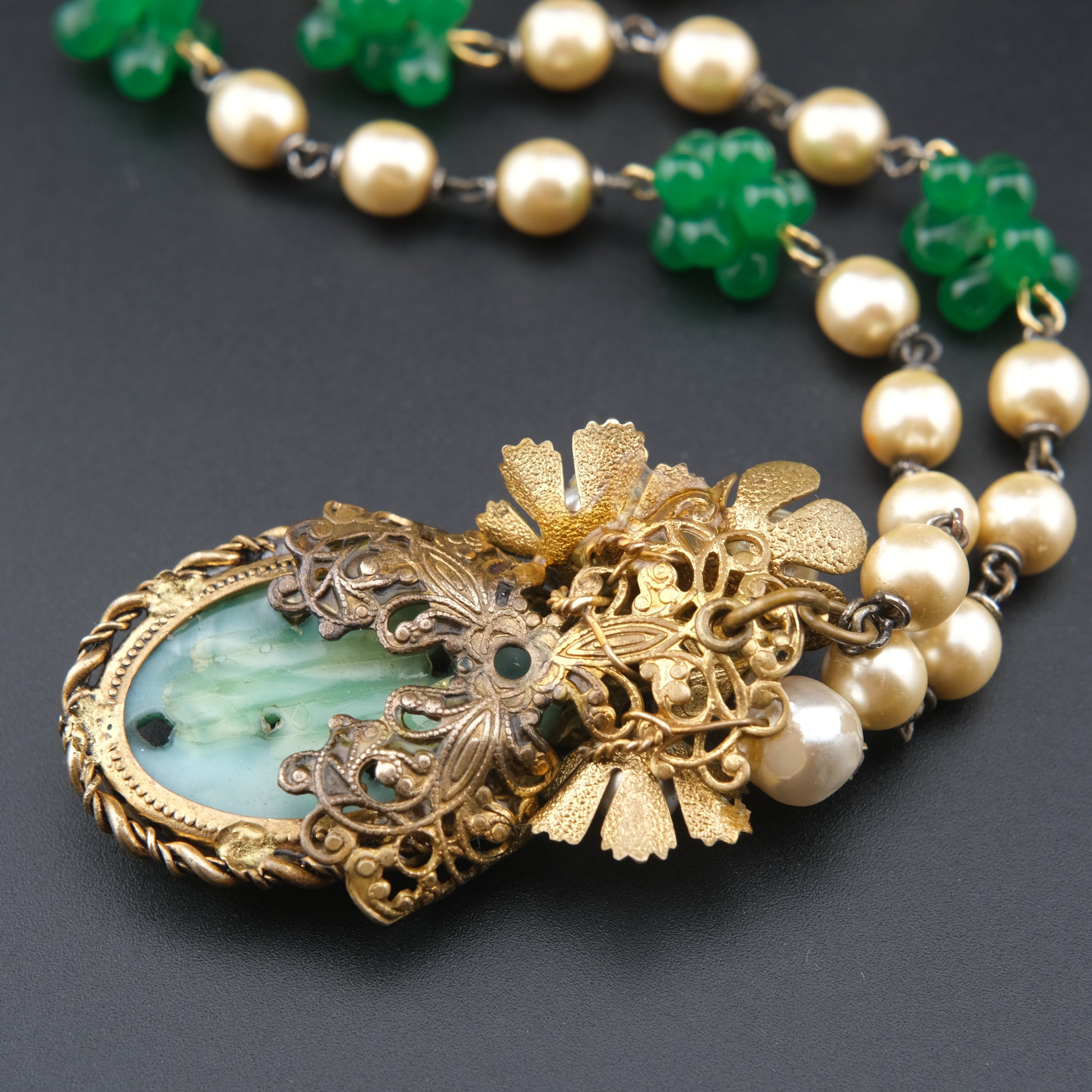 Vintage Possible Miriam Haskell Faux Pearl & Carved Green Glass Pendant Necklace