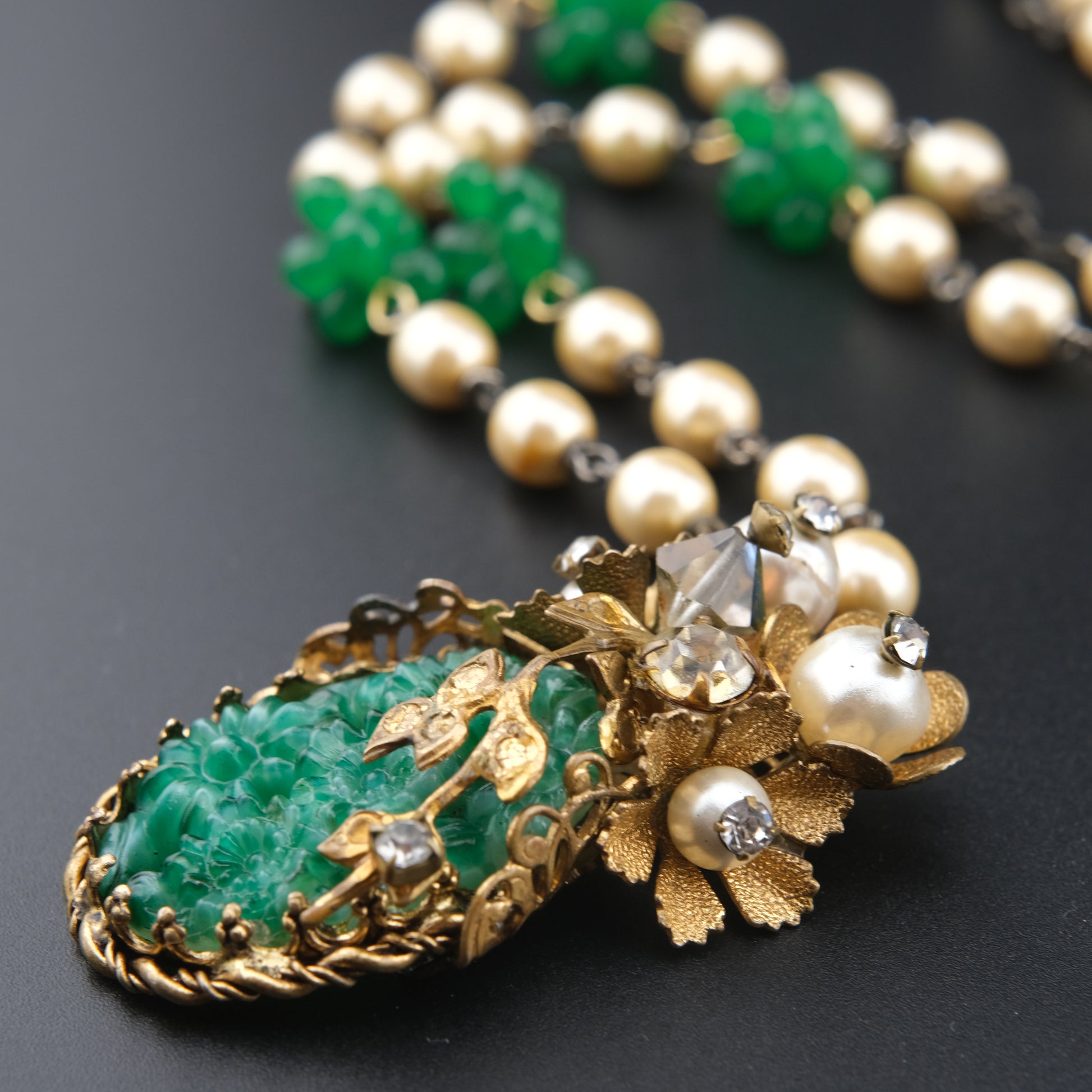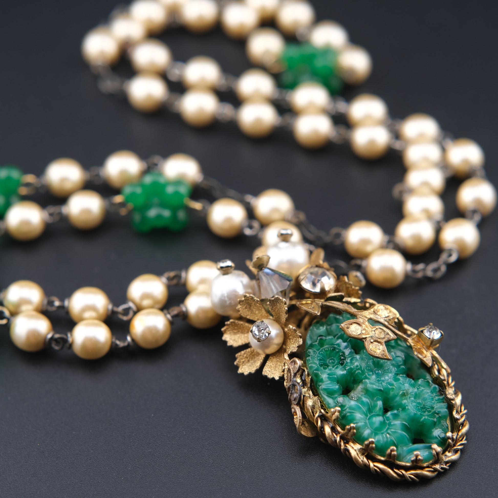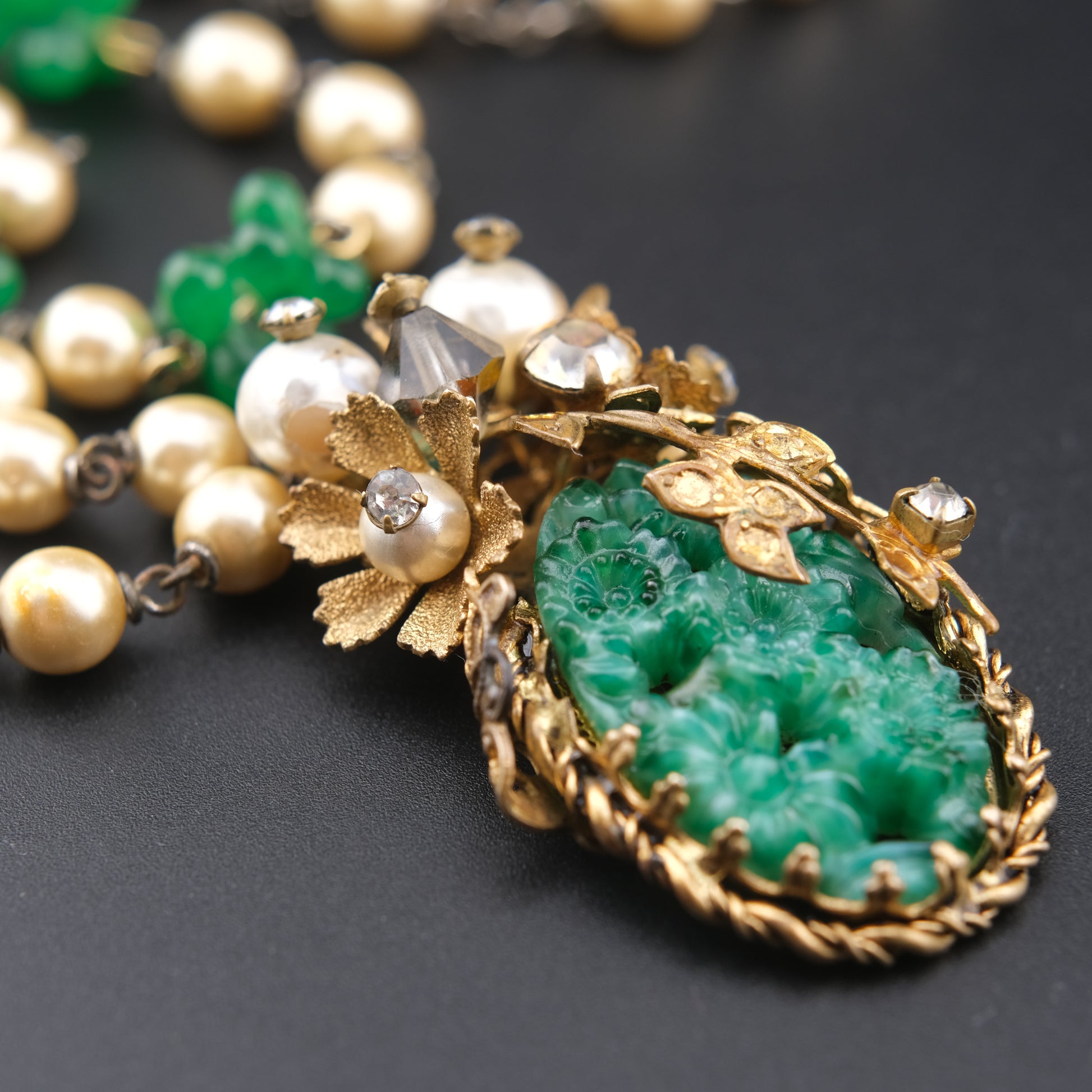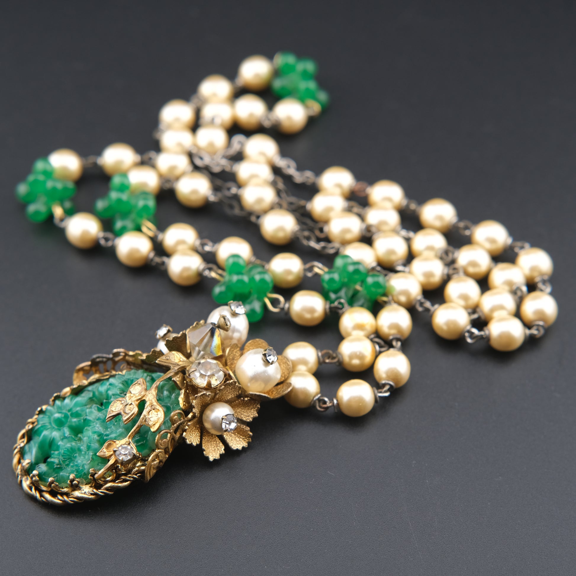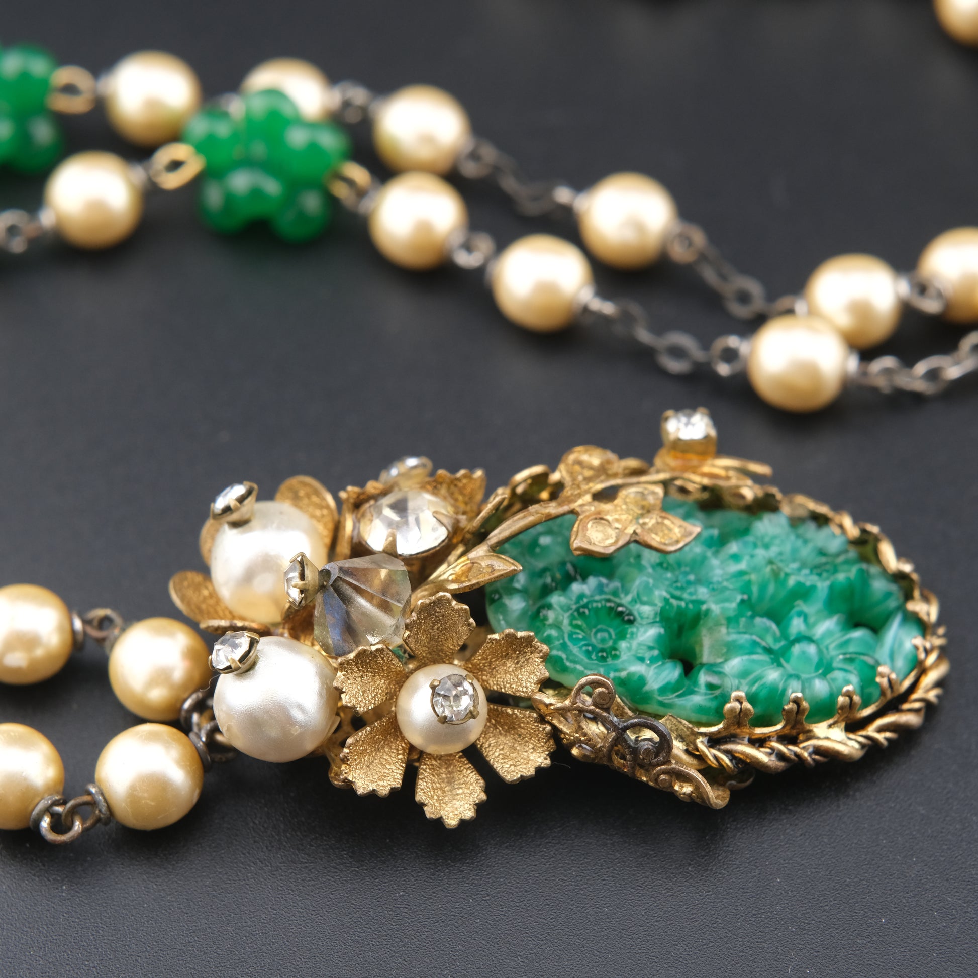 Vintage Possible Miriam Haskell Faux Pearl & Carved Green Glass Pendant Necklace