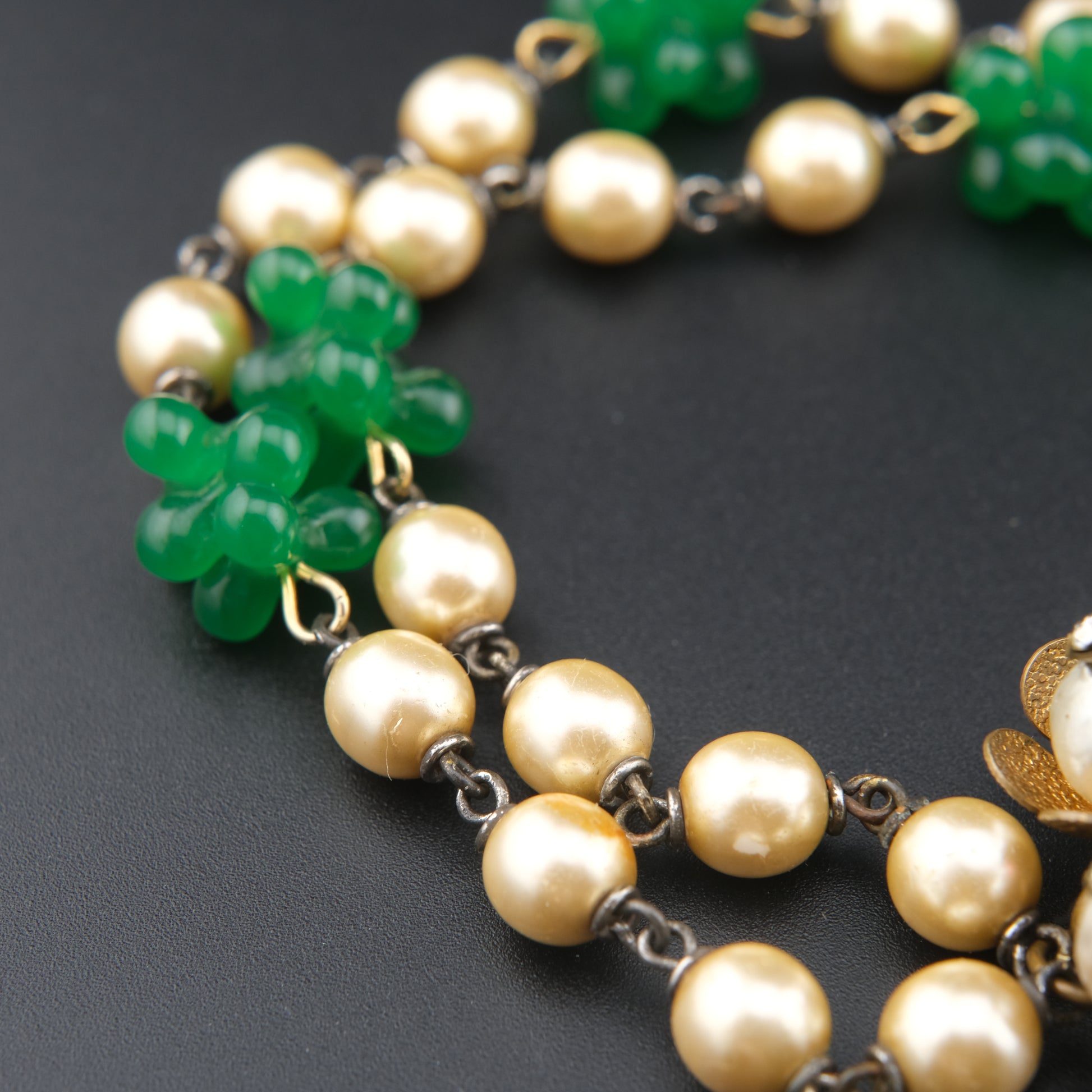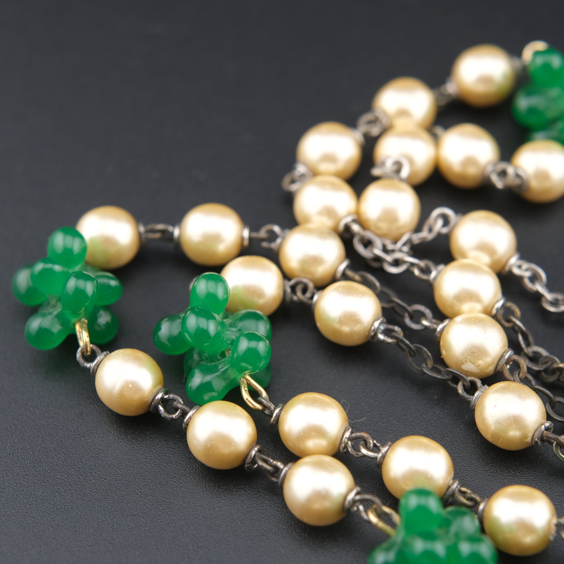This possibly early Miriam Haskell necklace is a striking vintage statement piece, combining timeless elegance with intricate craftsmanship. The long single strand necklace is composed of creamy faux pearl beads, accented with five green glass bead stations for a vibrant pop of color.