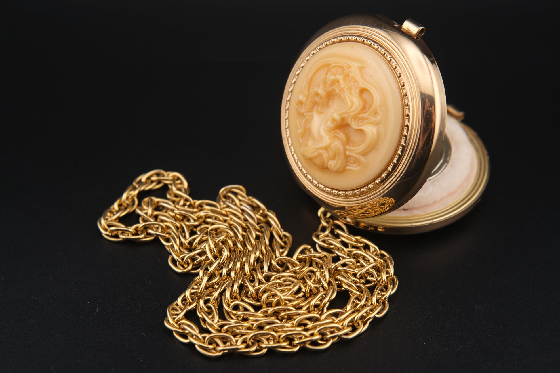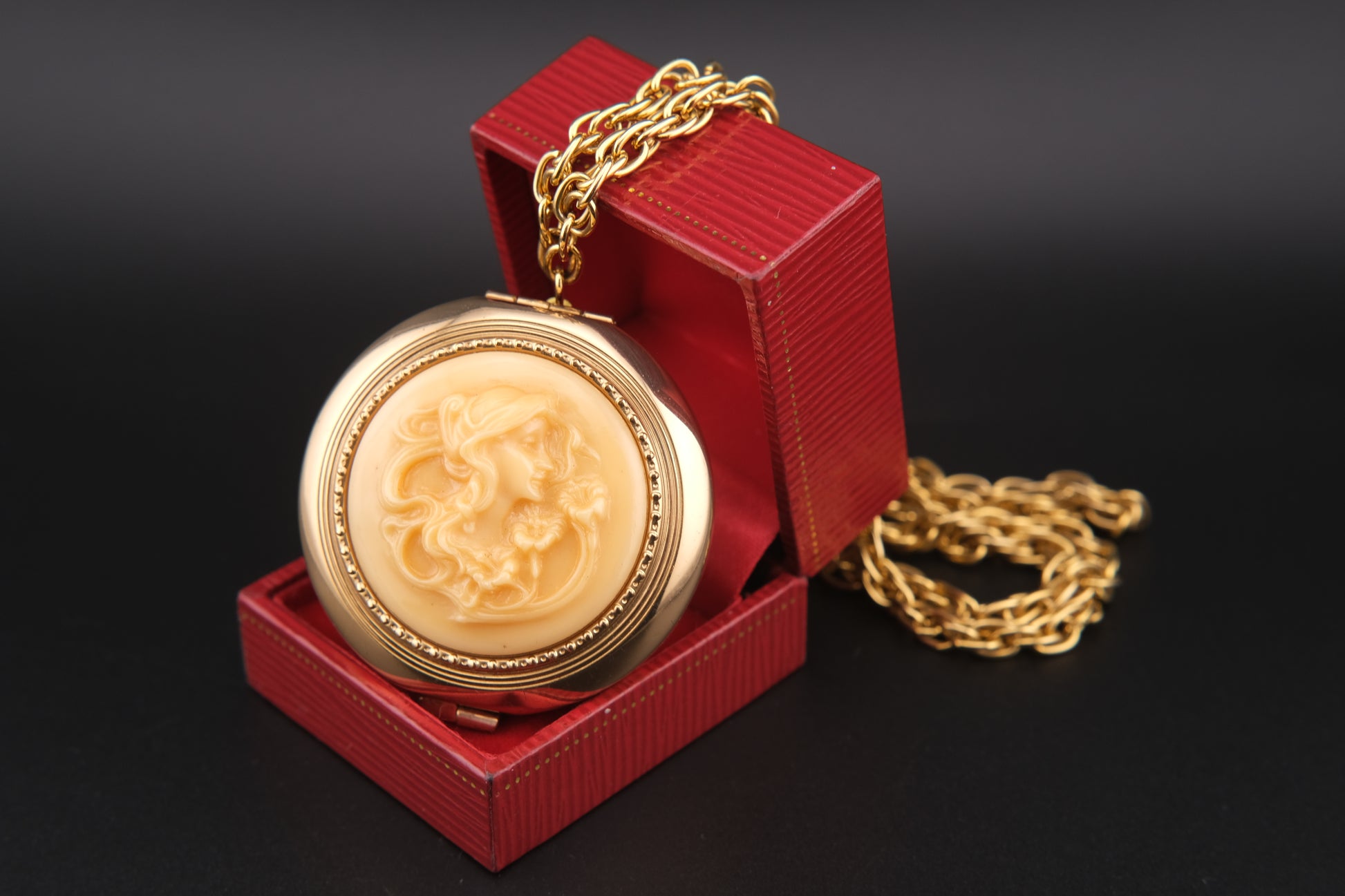 Material: Gold-tone metal, resin cameo, original powder and puff