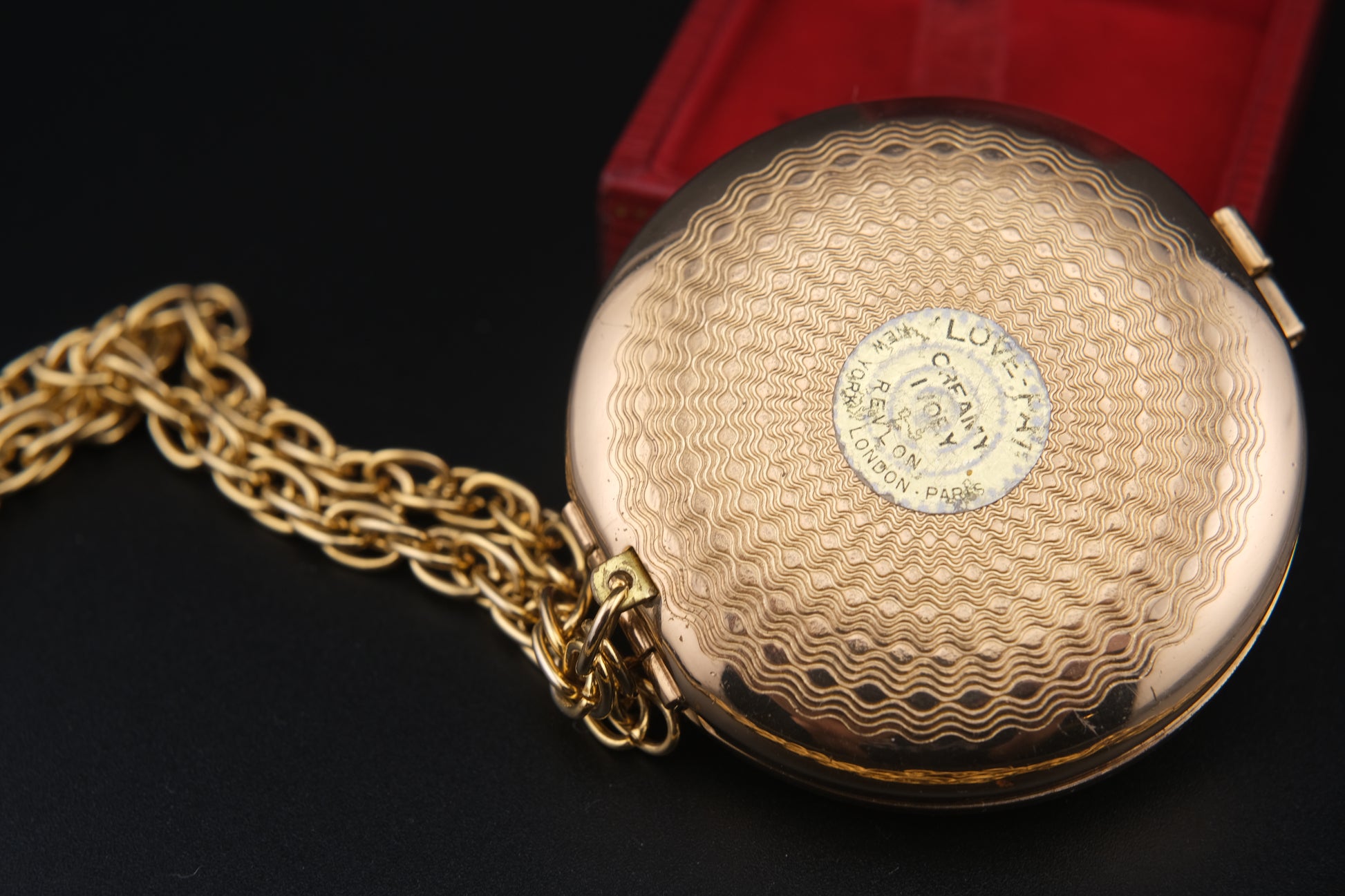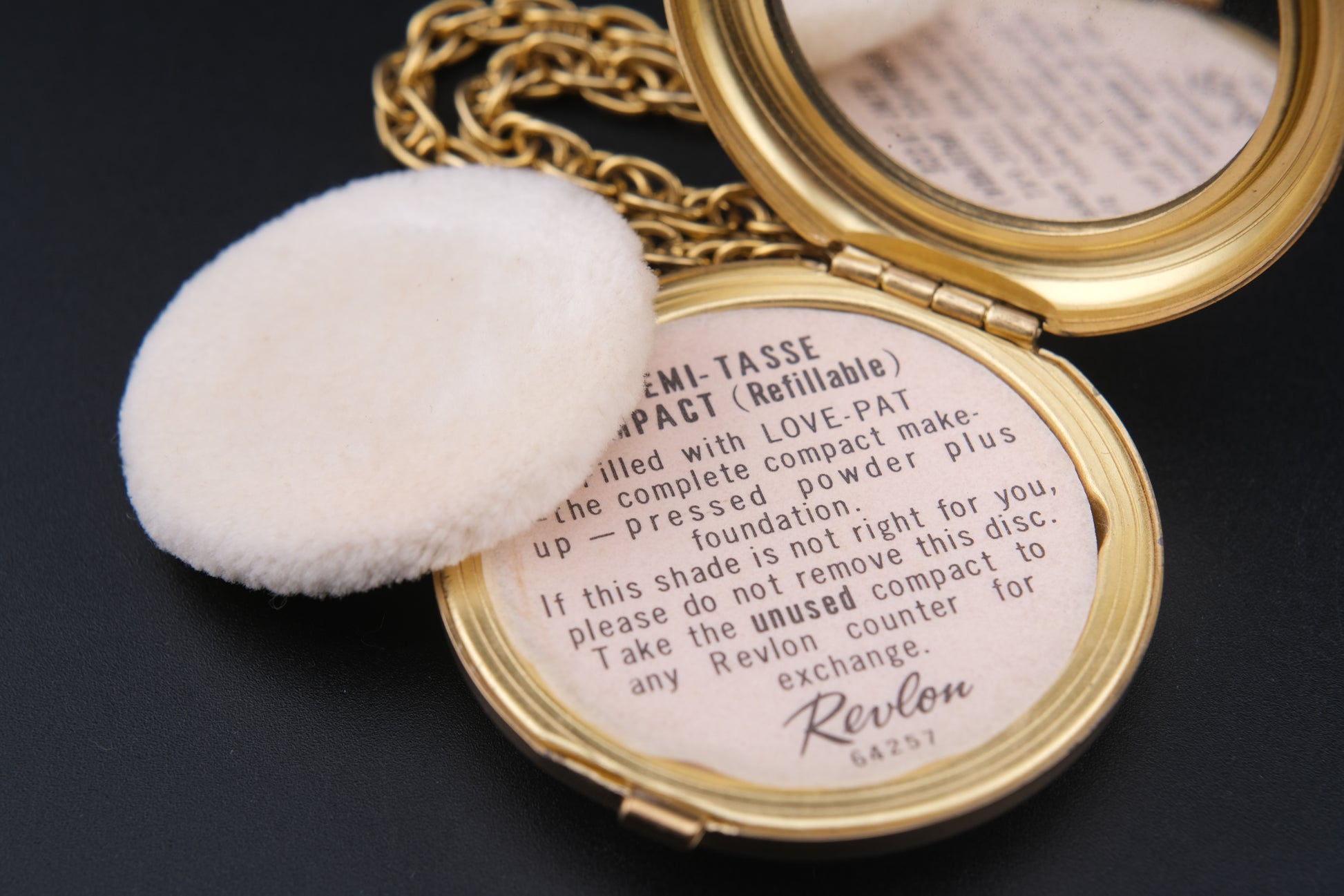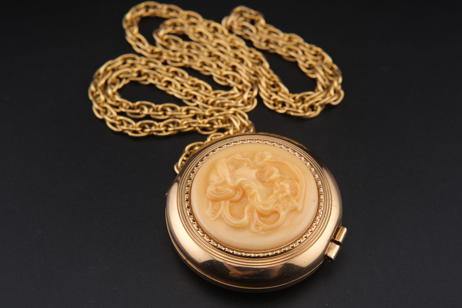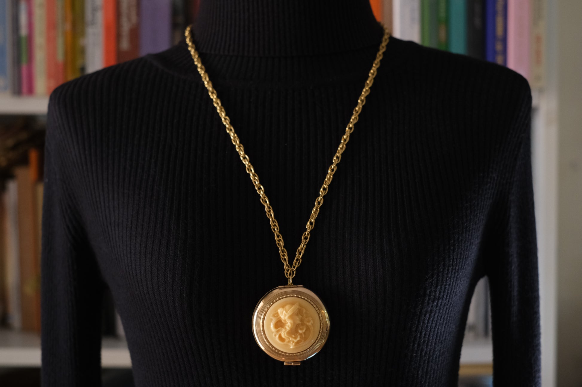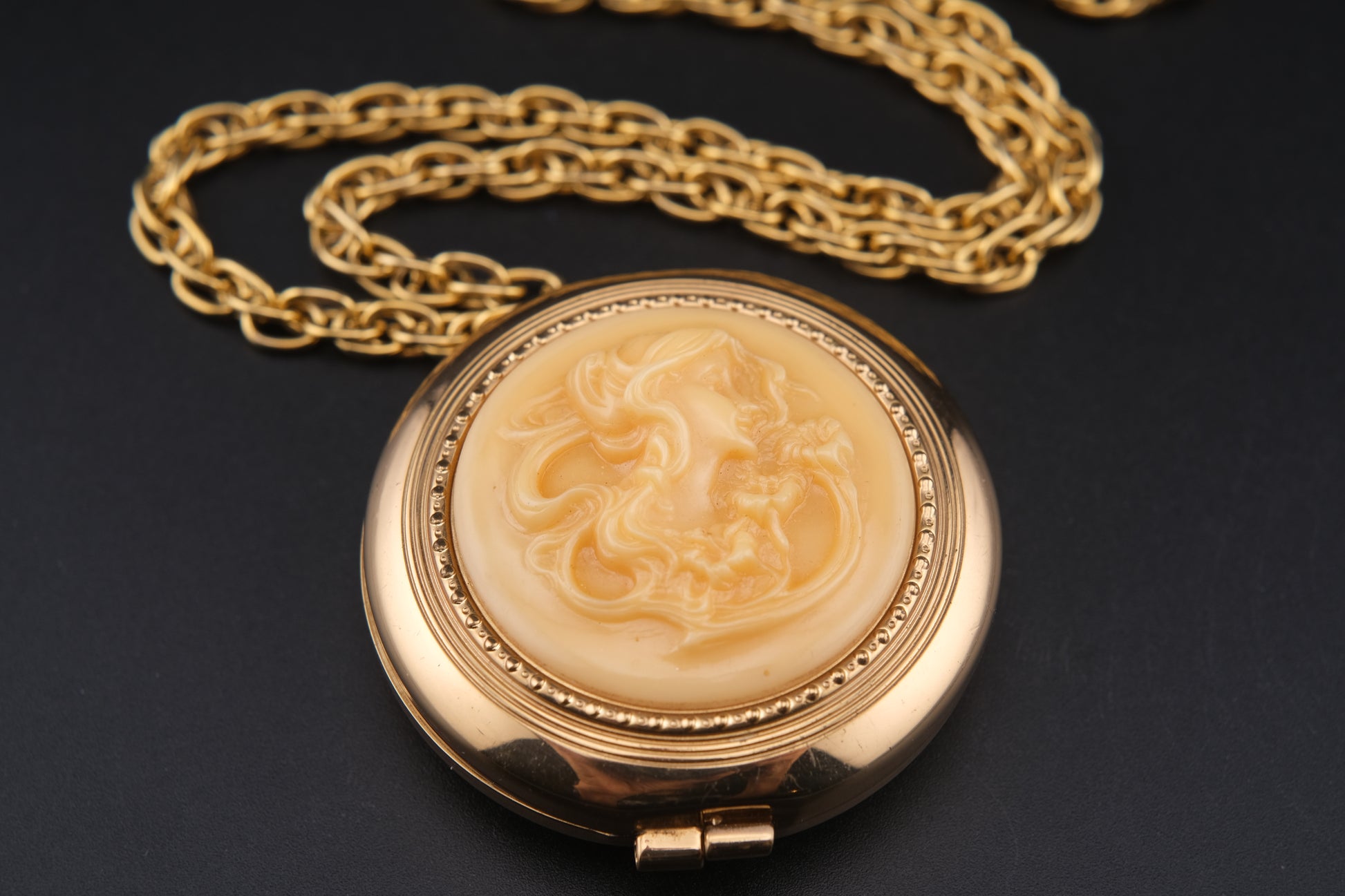 Elevate your vintage jewelry collection with this rare and elegant Revlon compact pendant necklace from the 1960s. This gold-tone statement piece features an Art Nouveau-style cameo of a graceful lady with flowing hair and florals, beautifully framed in relief. It opens to reveal a refillable Demi-Tasse Compact by Revlon, complete with mirror, powder puff, and original instruction disc. The powder surface shows a small scratch, consistent with gentle vintage use.