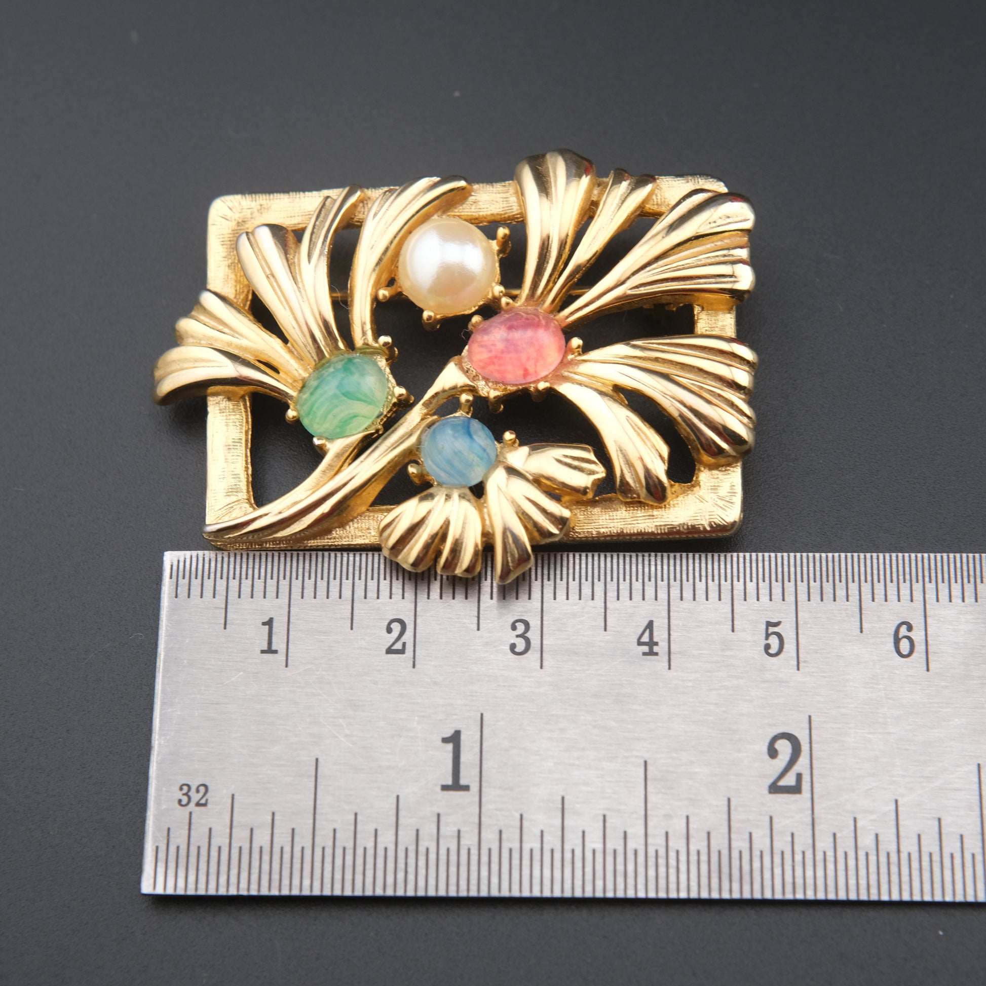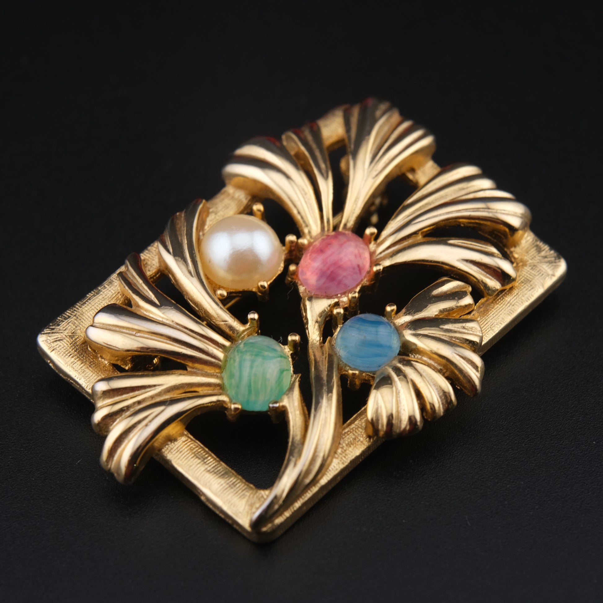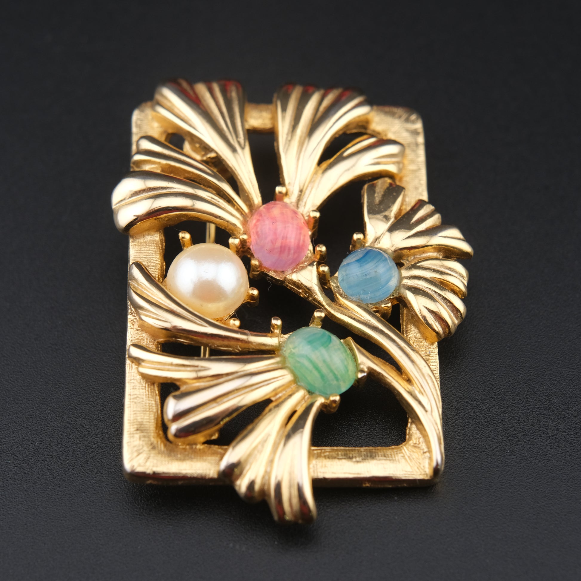 Vintage Richelieu Gold-Tone Floral Brooch with Pastel Cabochons & Faux Pearl