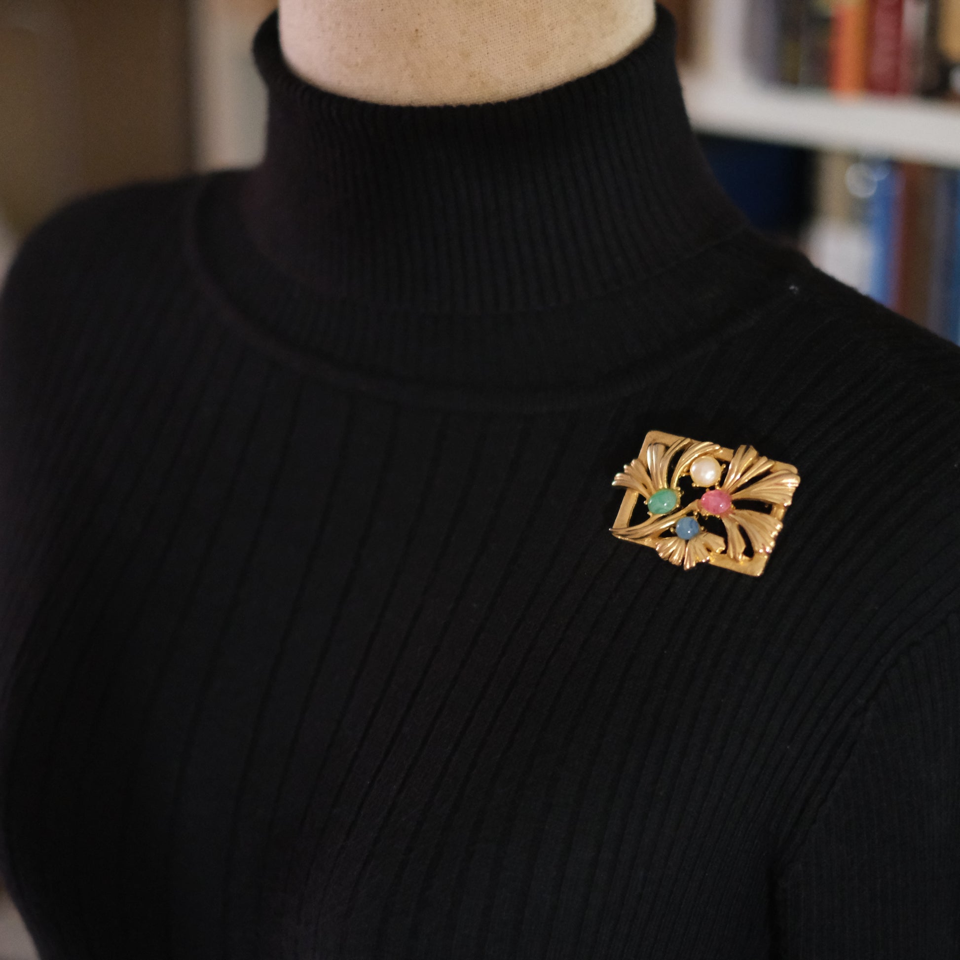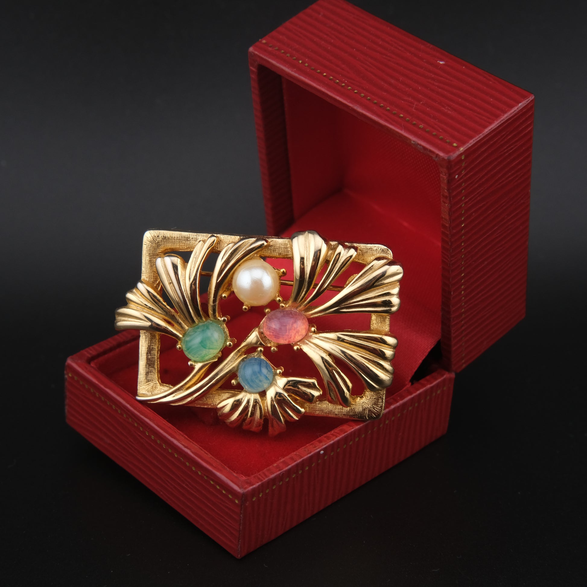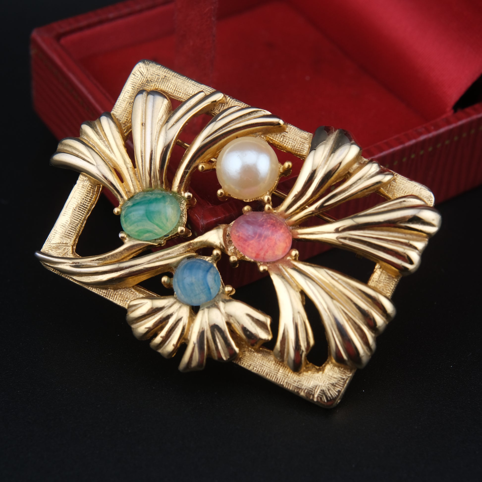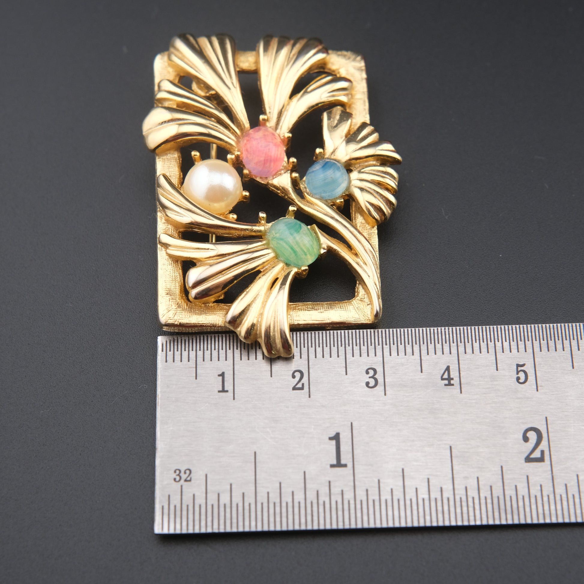 Vintage Richelieu Gold-Tone Floral Brooch with Pastel Cabochons & Faux Pearl