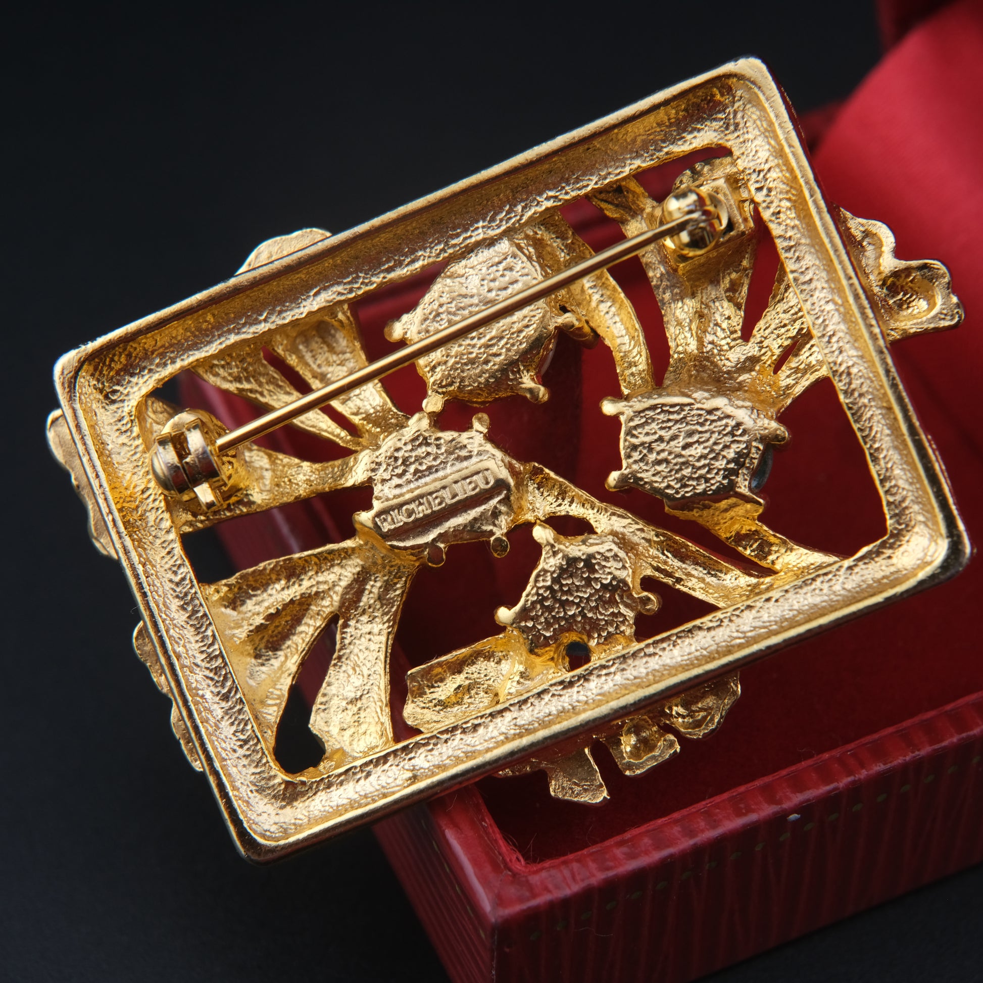 Add a touch of vintage charm to your collection with this striking Richelieu brooch. Crafted in a rich gold-tone finish, the design features beautifully formed flowers and leaves set on a textured square frame. At the center, sweet pastel cabochons in pink, light green, and light blue are accented by a luminous faux pearl, creating a vibrant and elegant contrast. A signature piece that captures Richelieu’s timeless artistry.