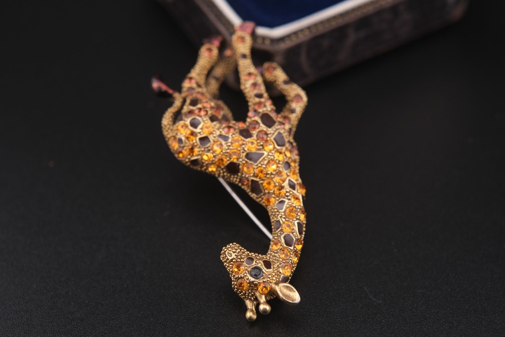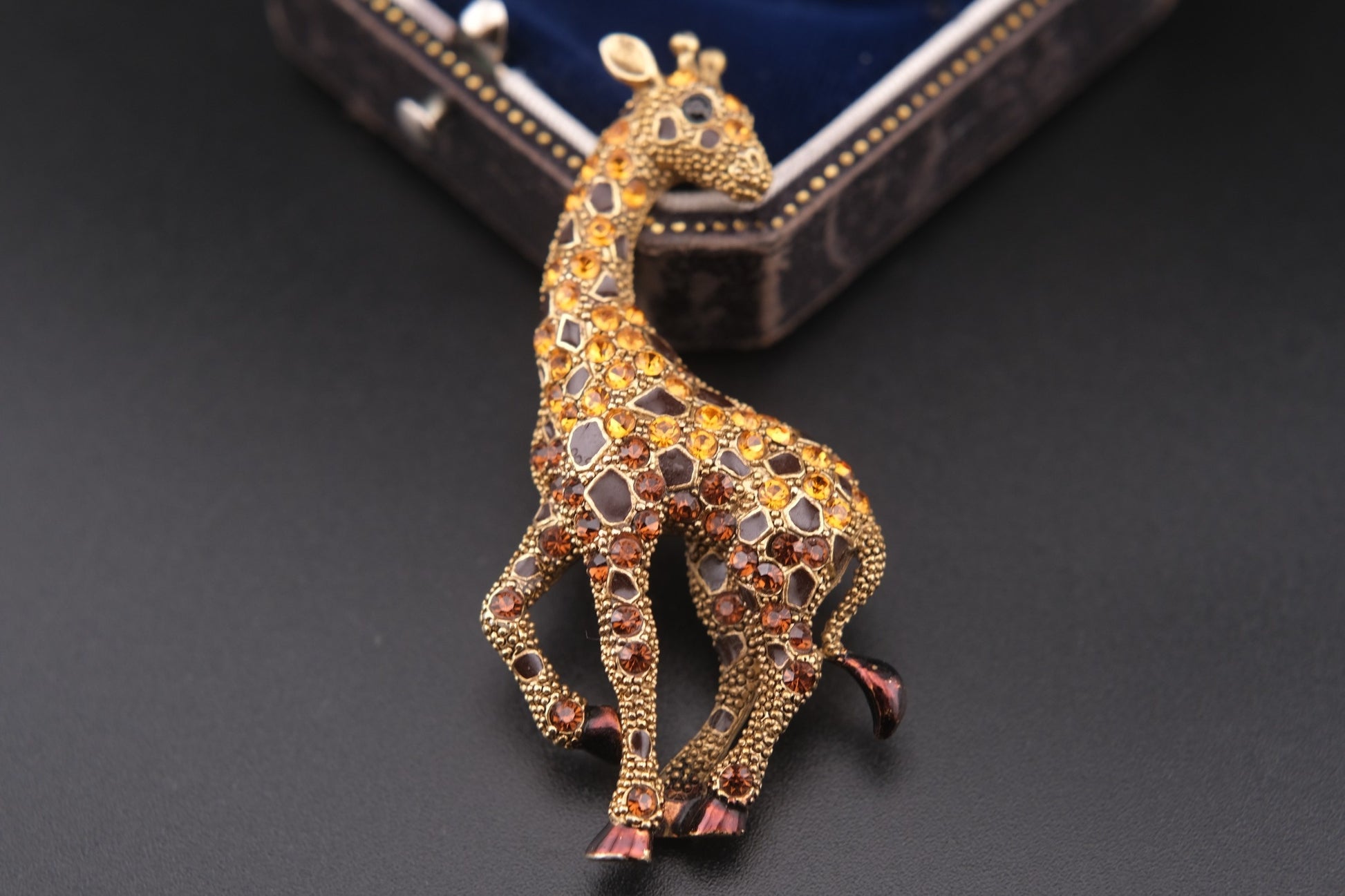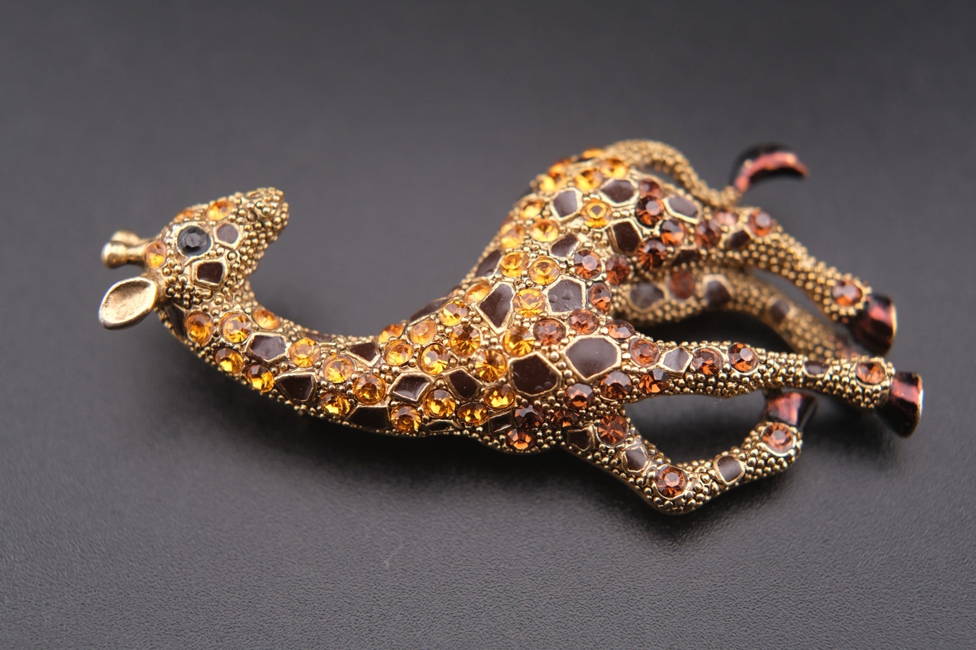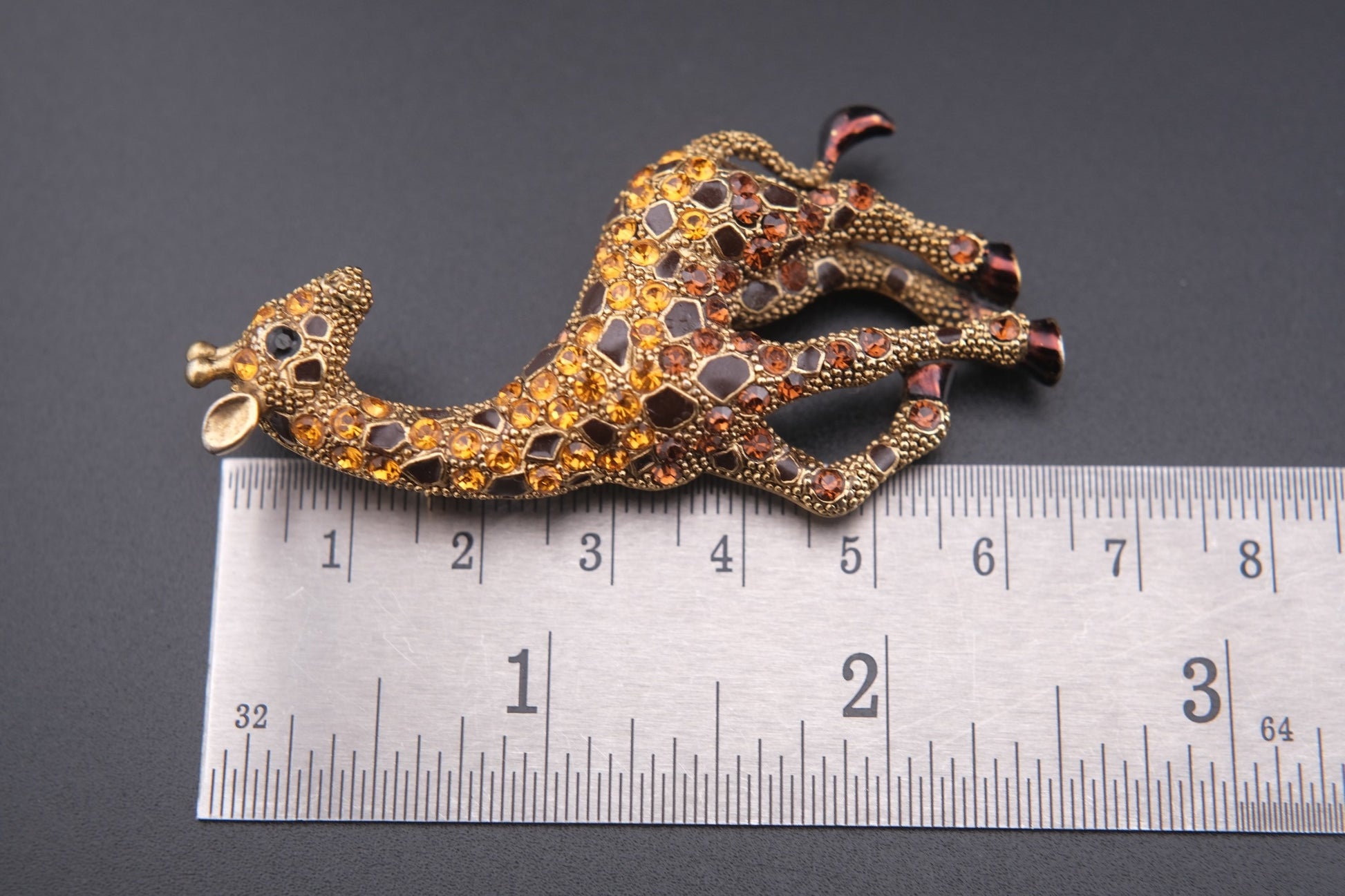 - Design: Giraffe figure with enamel details and pave-style rhinestone accents