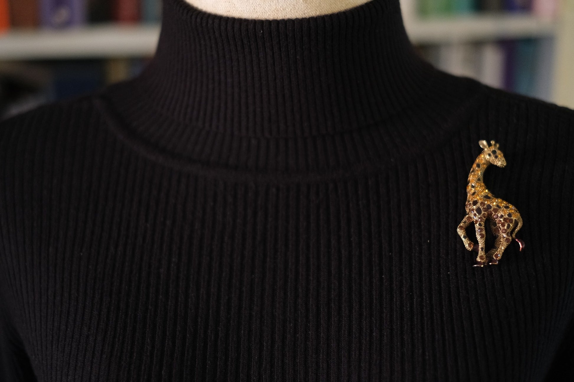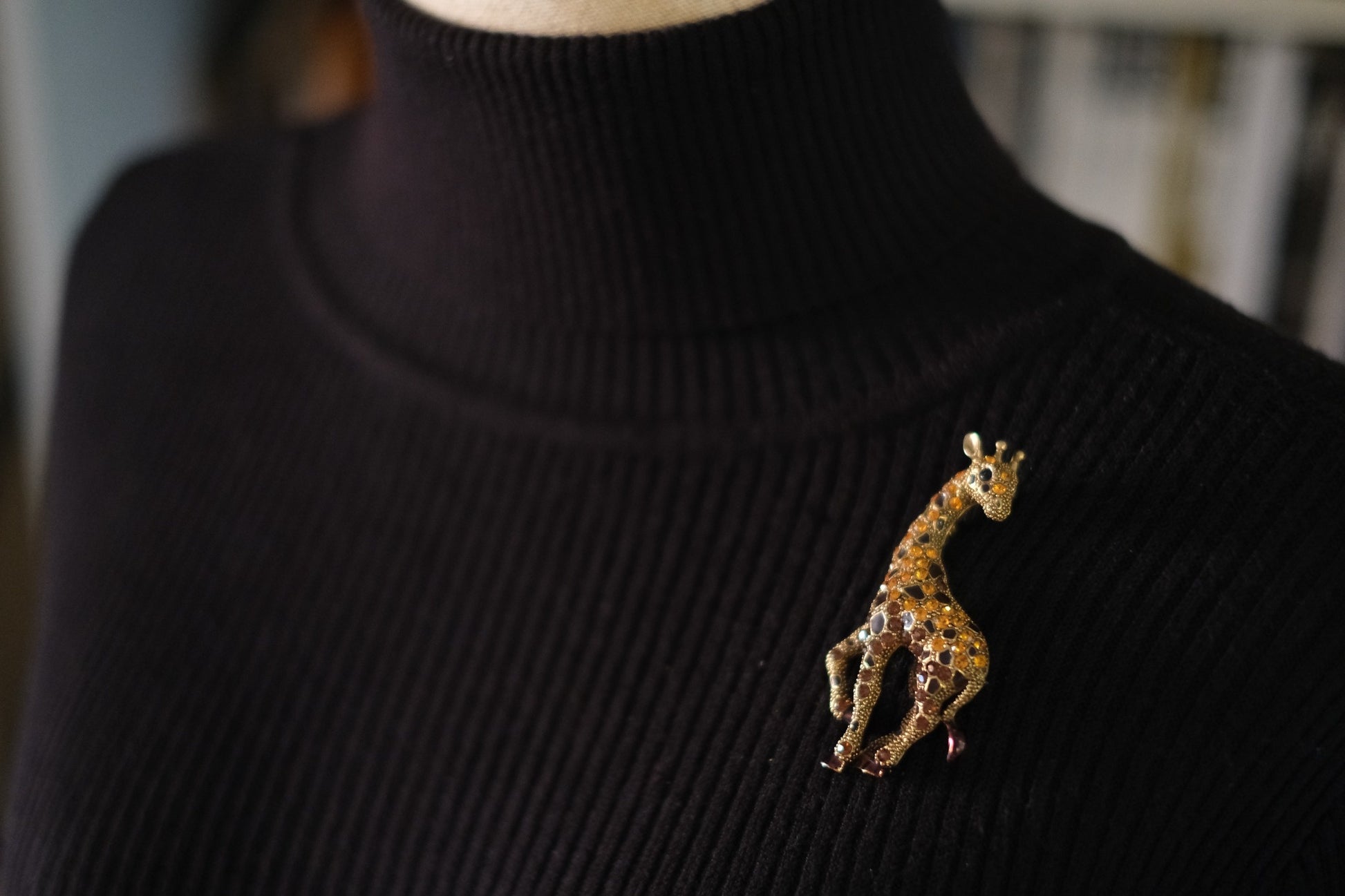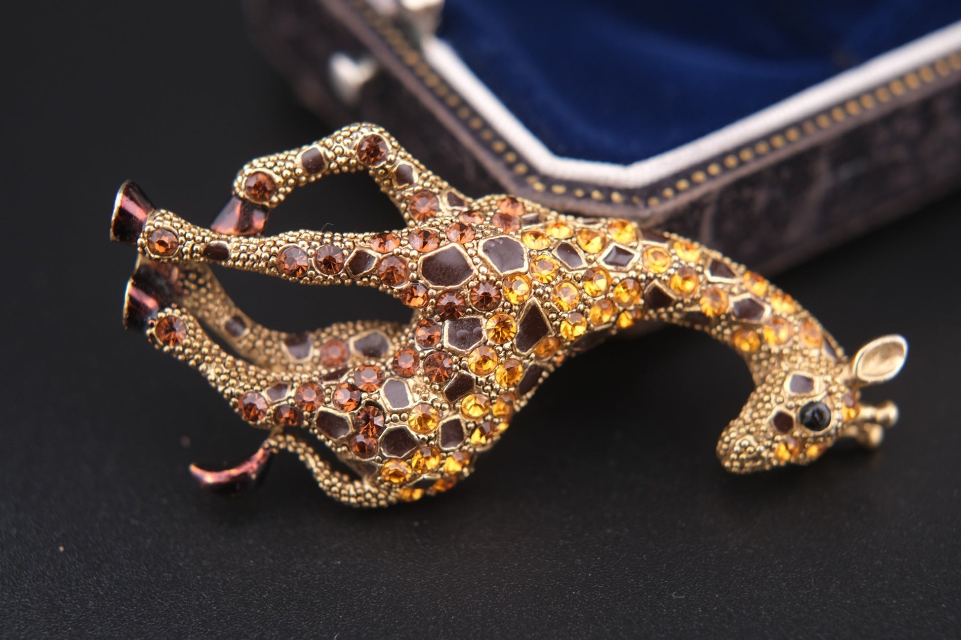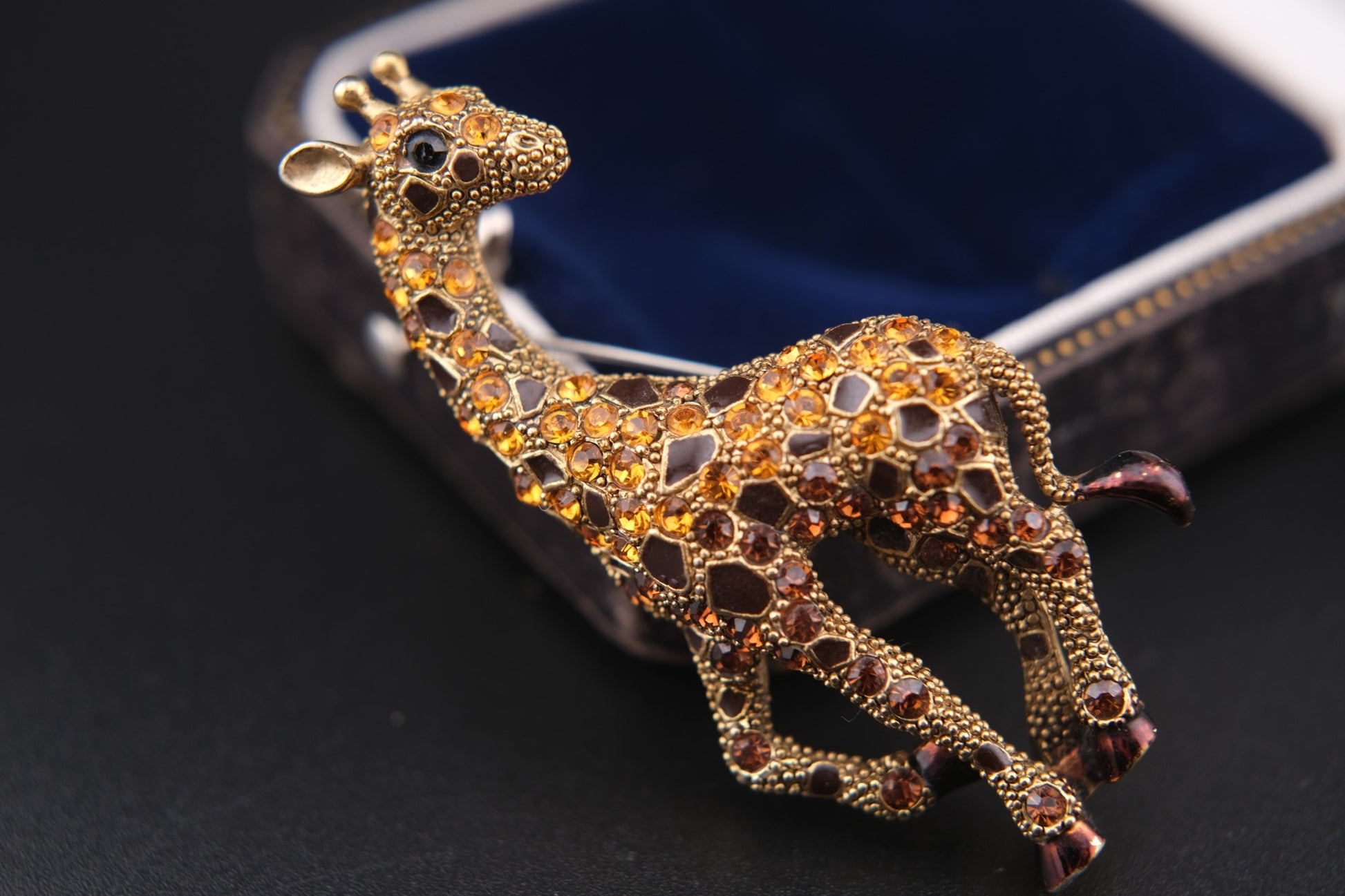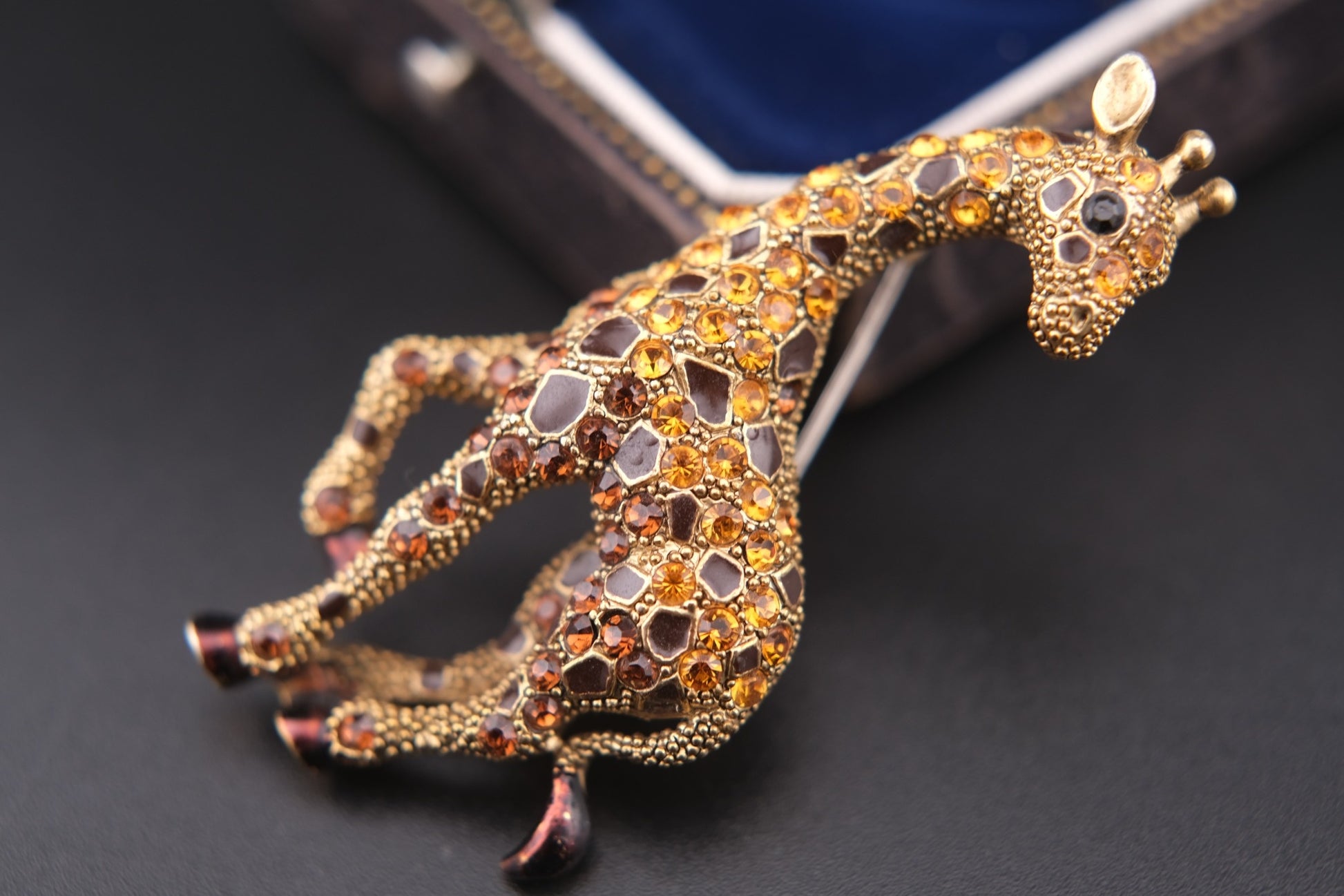 - Design: Giraffe figure with enamel details and pave-style rhinestone accents