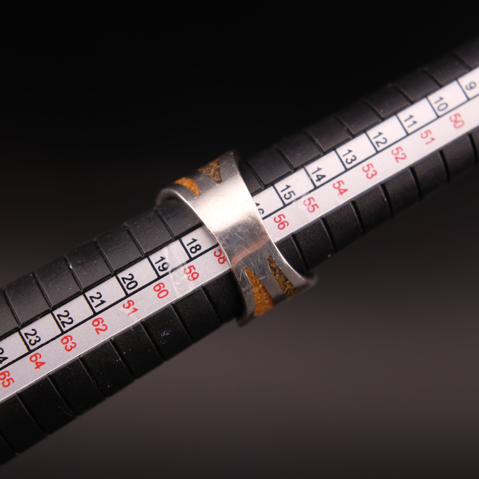 - Design: Wide modernist wavy band with geometric inlay pattern