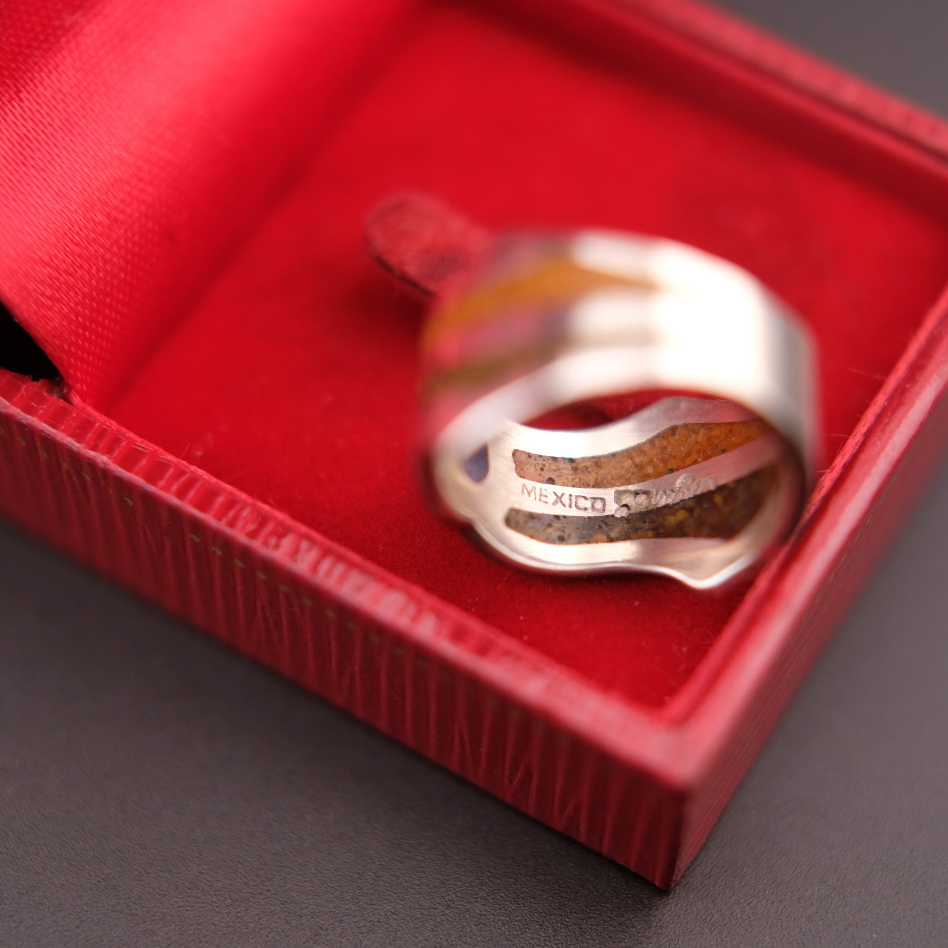 A beautiful example of vintage Mexican silver craftsmanship, this Saritasco ring features a sculptural, wavy band design adorned with amber-yellow and blue crushed stone inlays. Its fluid, geometric lines capture the essence of mid-century modernist jewelry design.