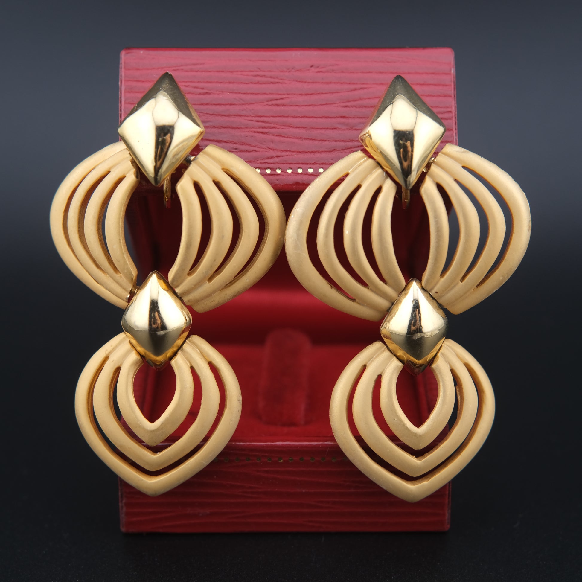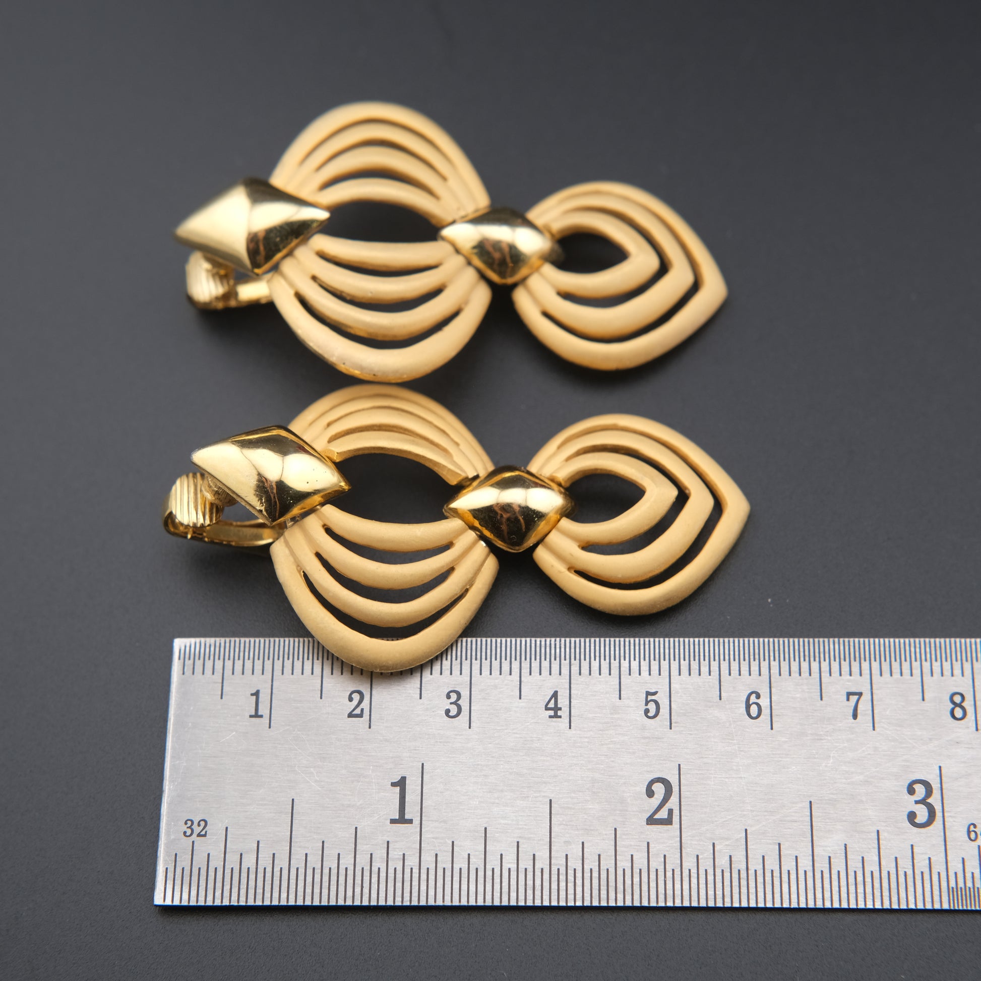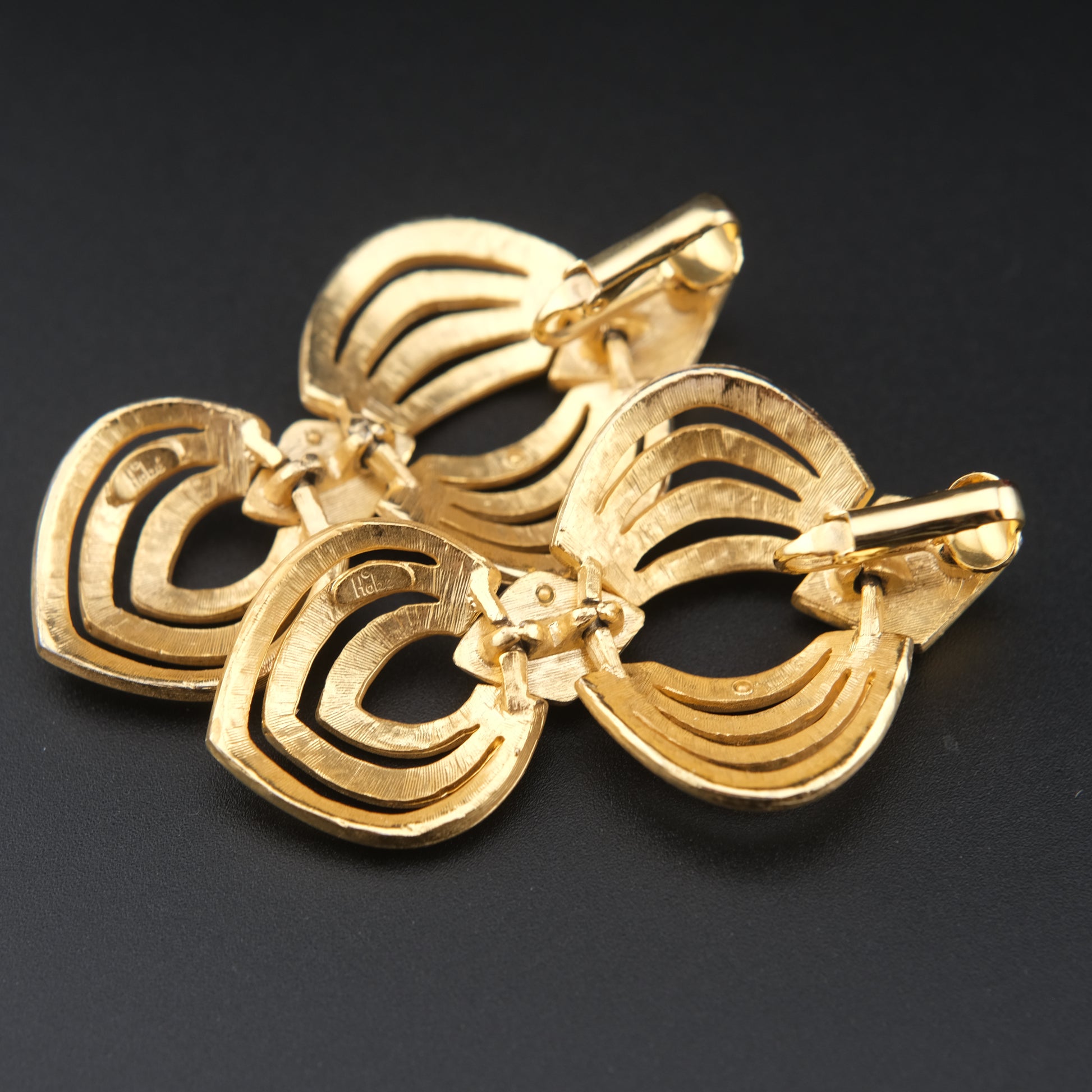 These bold vintage earrings by Hobé feature a striking two-tier design with fan-shaped matte gold dangles suspended from polished diamond-shaped connectors. The sculptural interplay between matte and high-shine finishes adds depth and movement, making them a standout statement accessory. Perfect for collectors or anyone who loves dramatic, fashion-forward vintage jewelry.