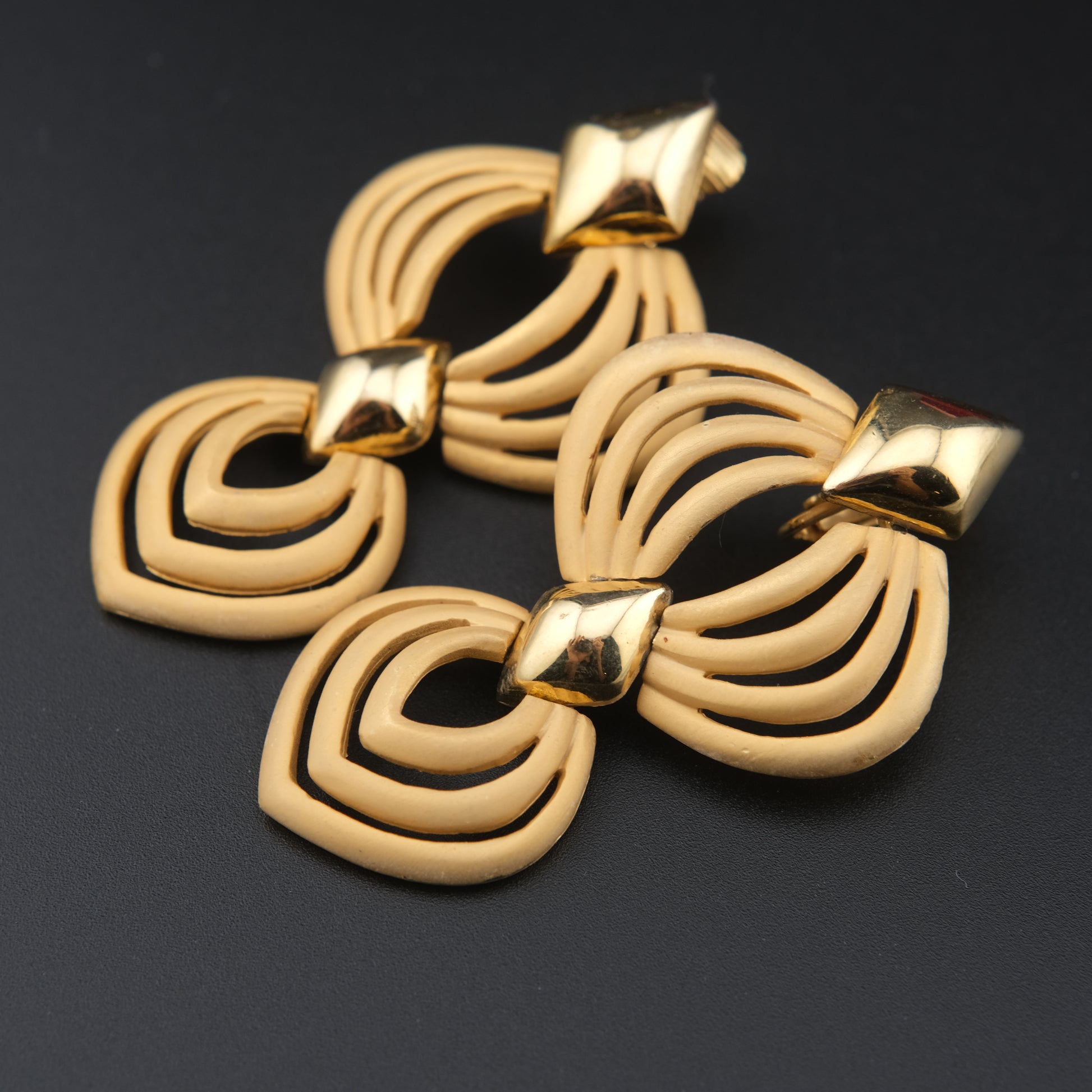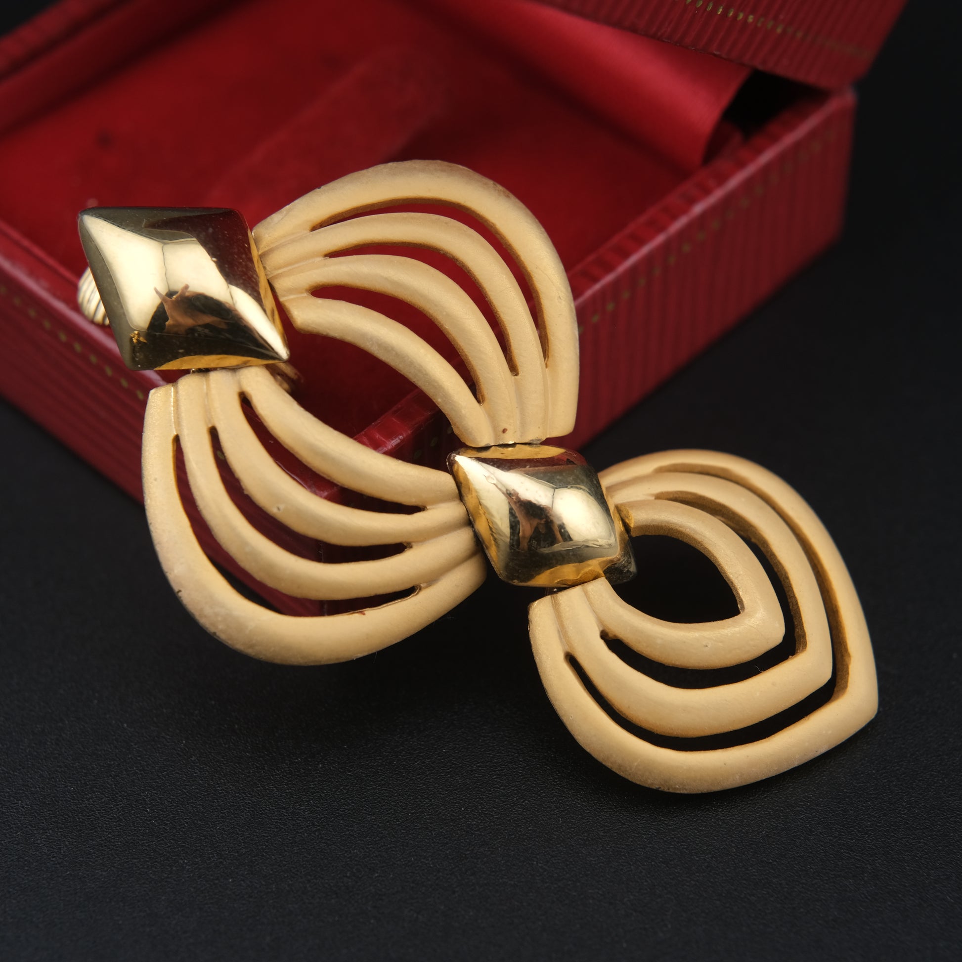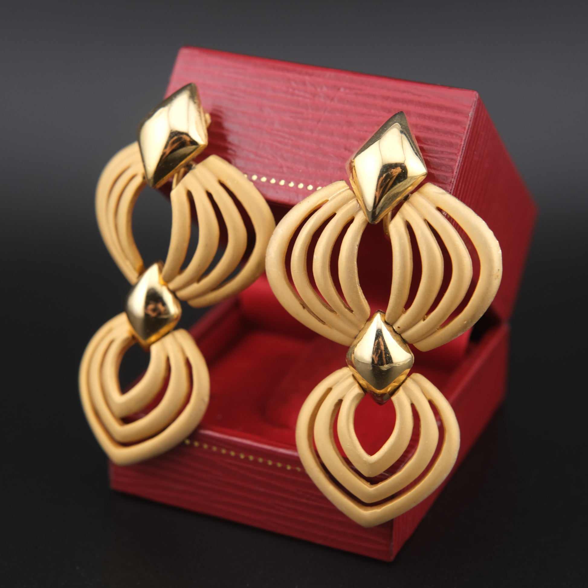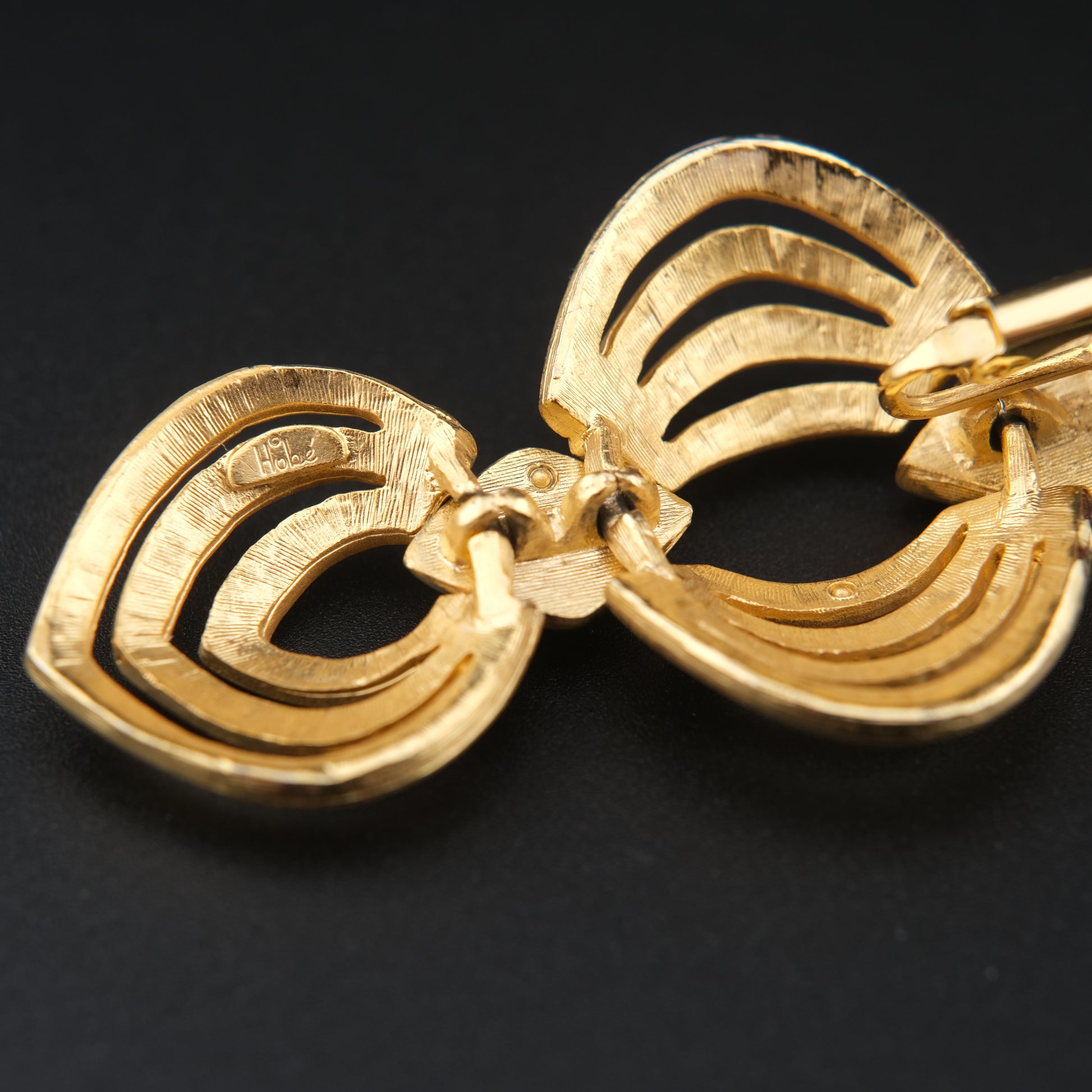 These bold vintage earrings by Hobé feature a striking two-tier design with fan-shaped matte gold dangles suspended from polished diamond-shaped connectors. The sculptural interplay between matte and high-shine finishes adds depth and movement, making them a standout statement accessory. Perfect for collectors or anyone who loves dramatic, fashion-forward vintage jewelry.