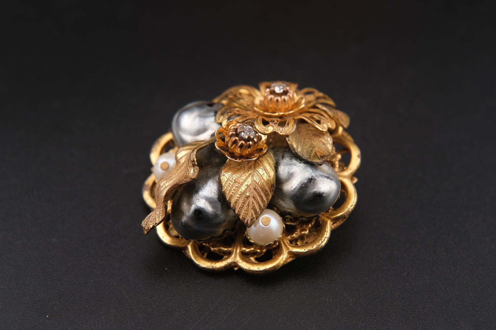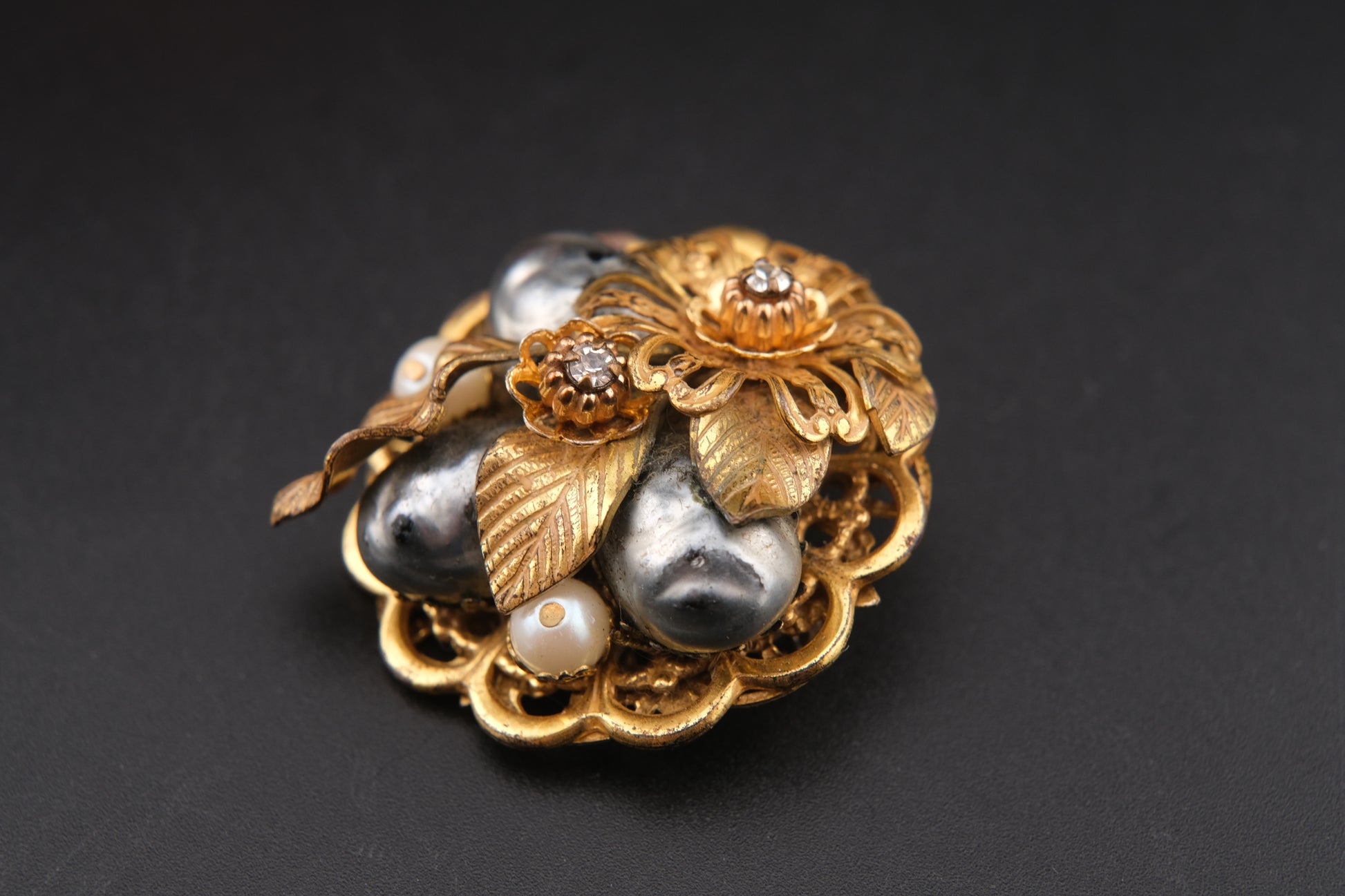 Vintage Stanley Hagler NYC Floral & Pearl Cluster Brooch – Gold-Tone Filigree with Baroque Beads & Rhinestones