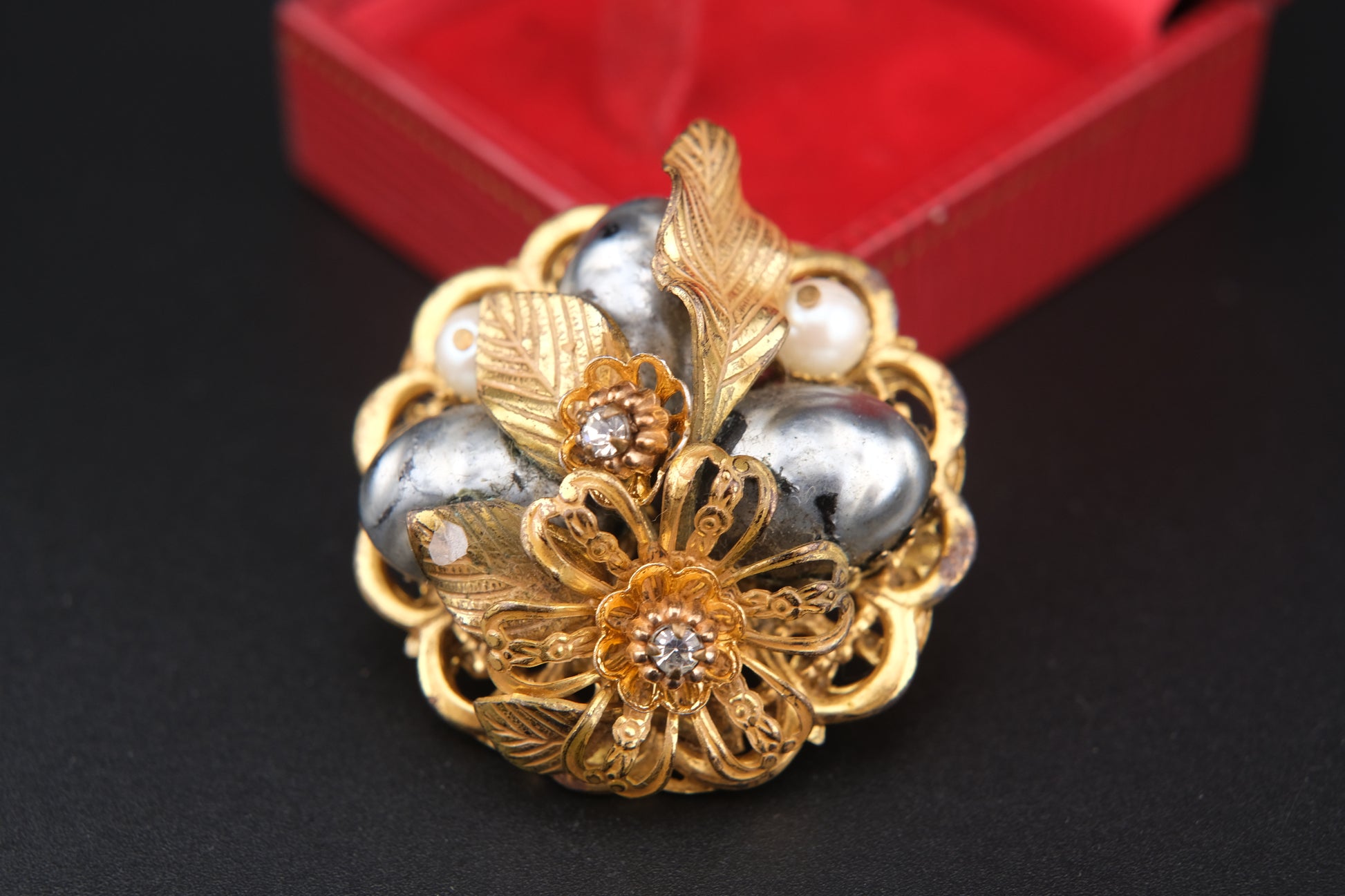 Elevate your collection with this exquisite vintage Stanley Hagler NYC brooch, celebrated for its lavish designs and meticulous craftsmanship. This floral cluster piece showcases a dimensional bouquet of textured gold-tone filigree leaves and flowers, accented with sparkling rhinestones, baroque grey beads, and luminous faux pearls. The combination of bold textures and elegant detailing reflects Hagler’s signature style from mid-20th century costume jewelry.