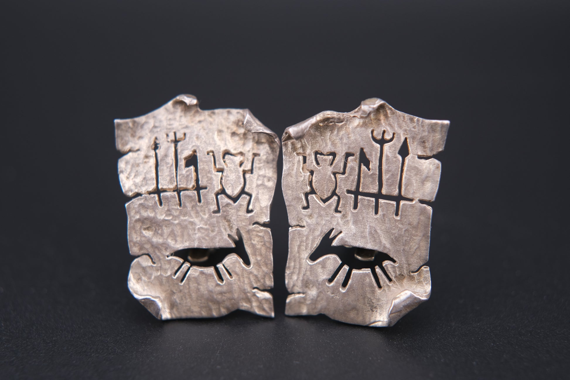 Step into a world of symbolic storytelling with this bold pair of vintage sterling silver earrings by Woods, signed and stamped 925. These striking clip-on earrings feature cut-out petroglyph-style figures—including stylized animal motifs, spears, and anthropomorphic forms—reminiscent of ancient tribal carvings.