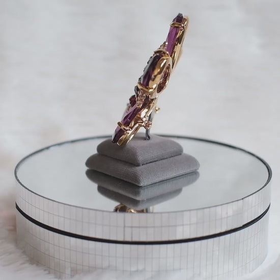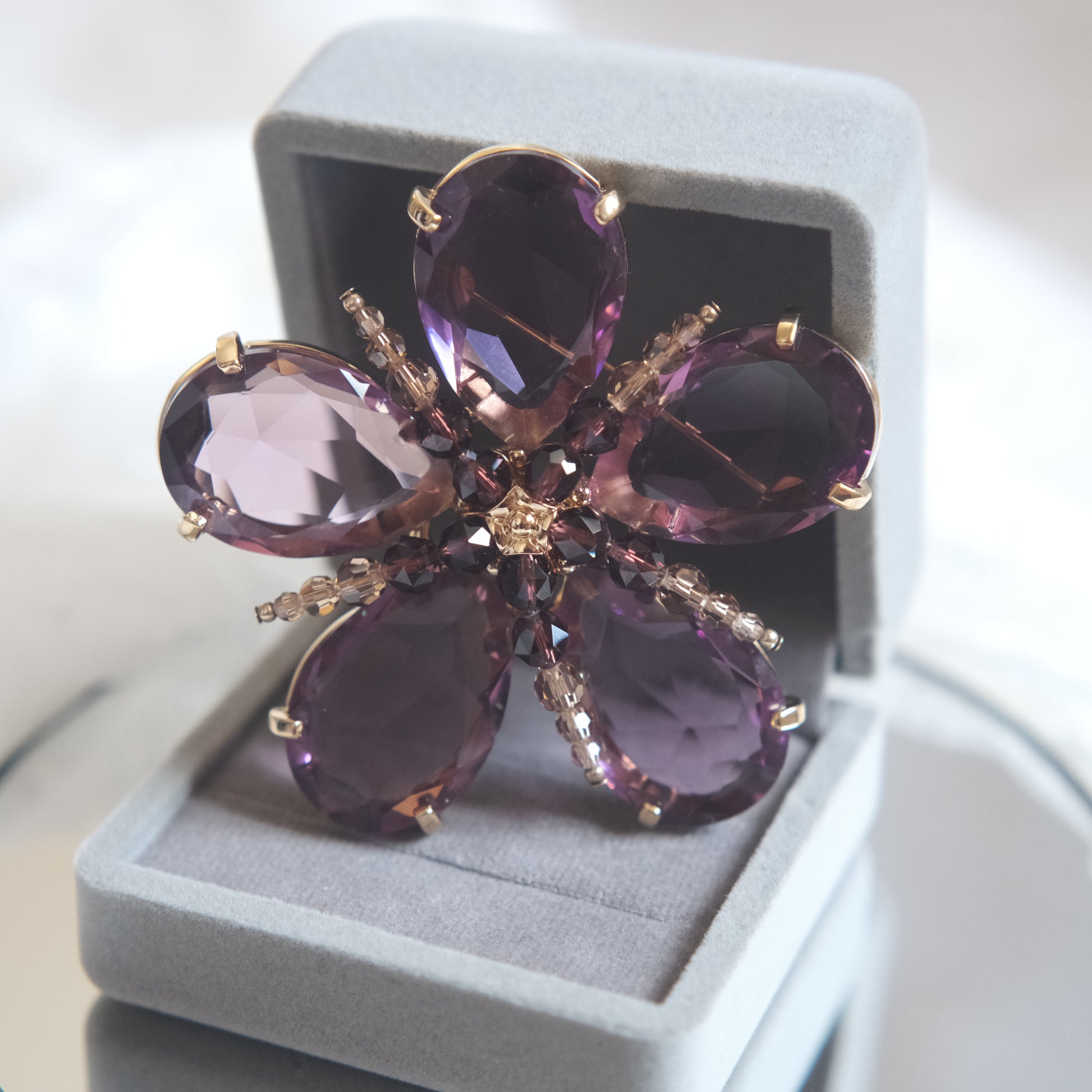 This striking Swarovski flower brooch features five large pear-cut crystals in soft amethyst hues, accented with faceted crystal beads in deeper plum and champagne tones. The gold-tone setting enhances the warmth of the stones, creating a dimensional floral silhouette that captures light beautifully from every angle.