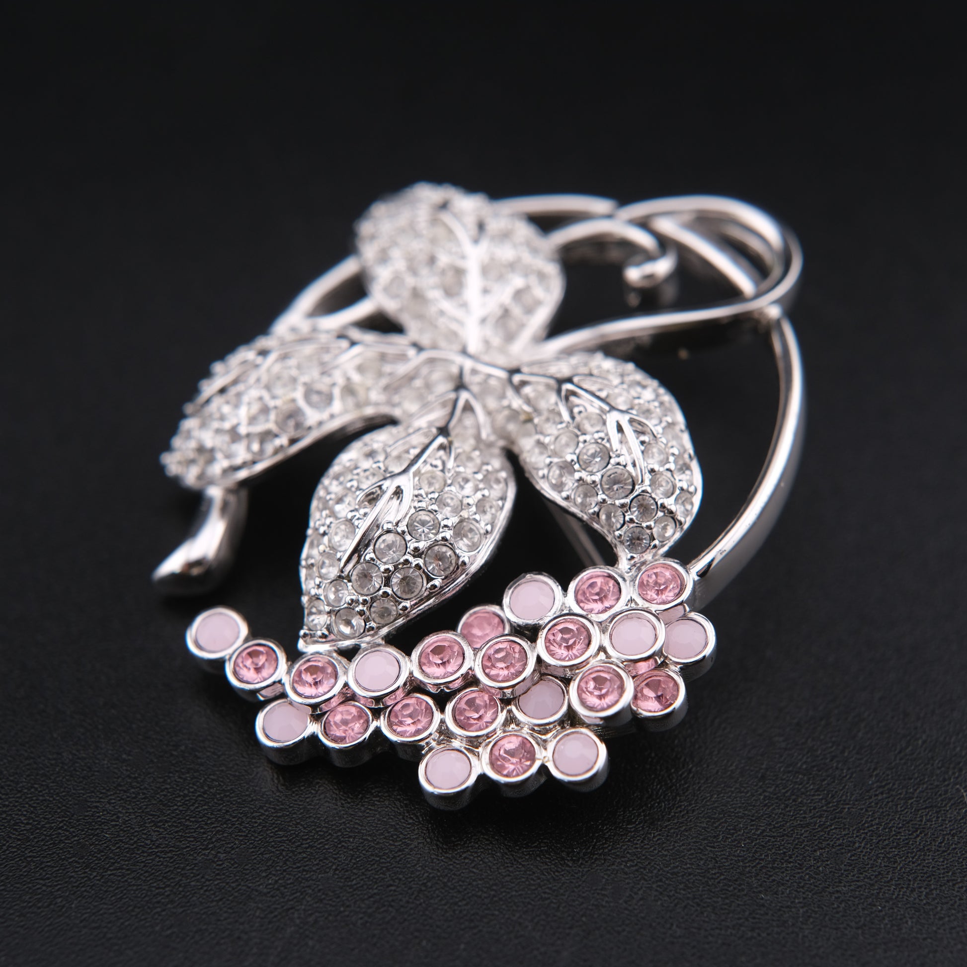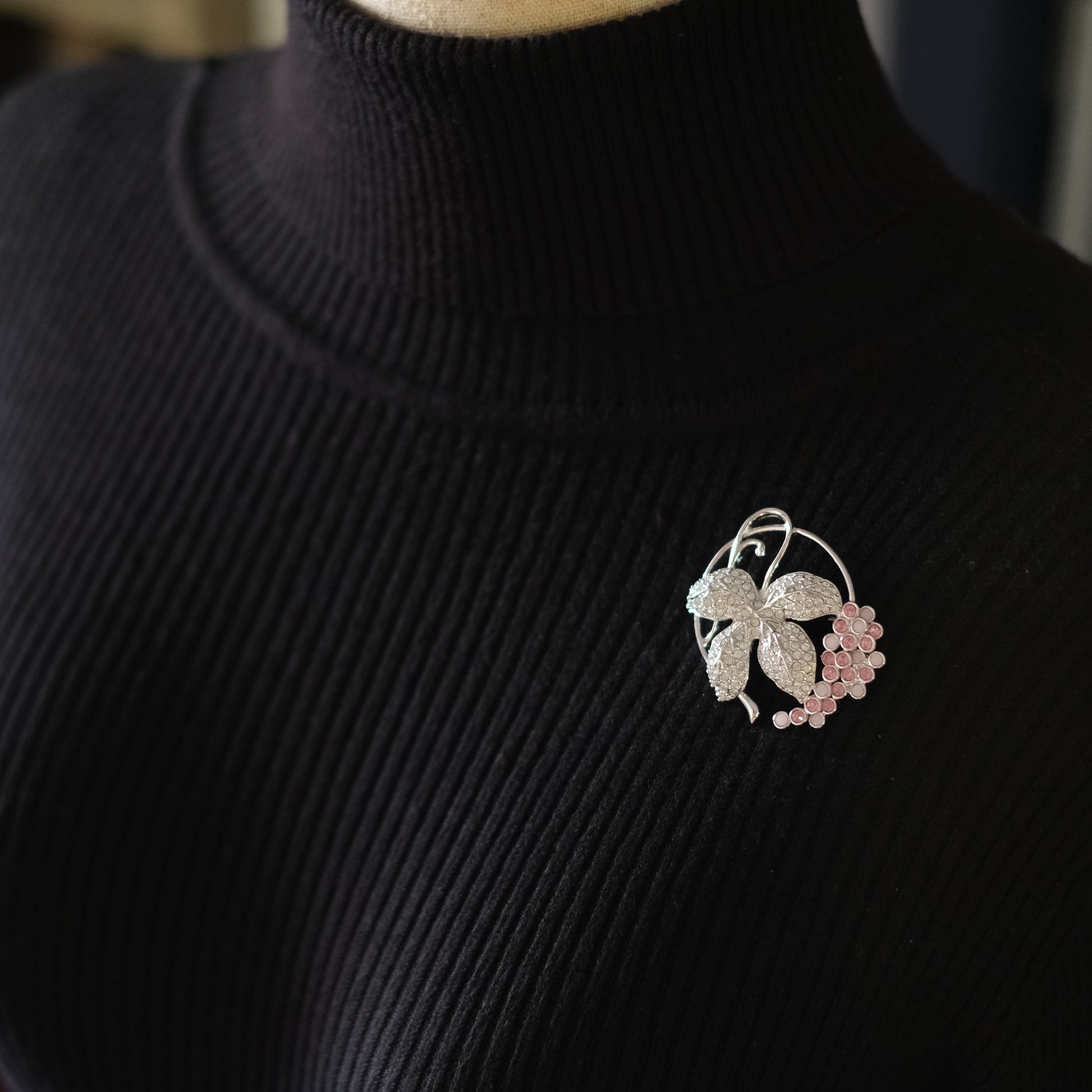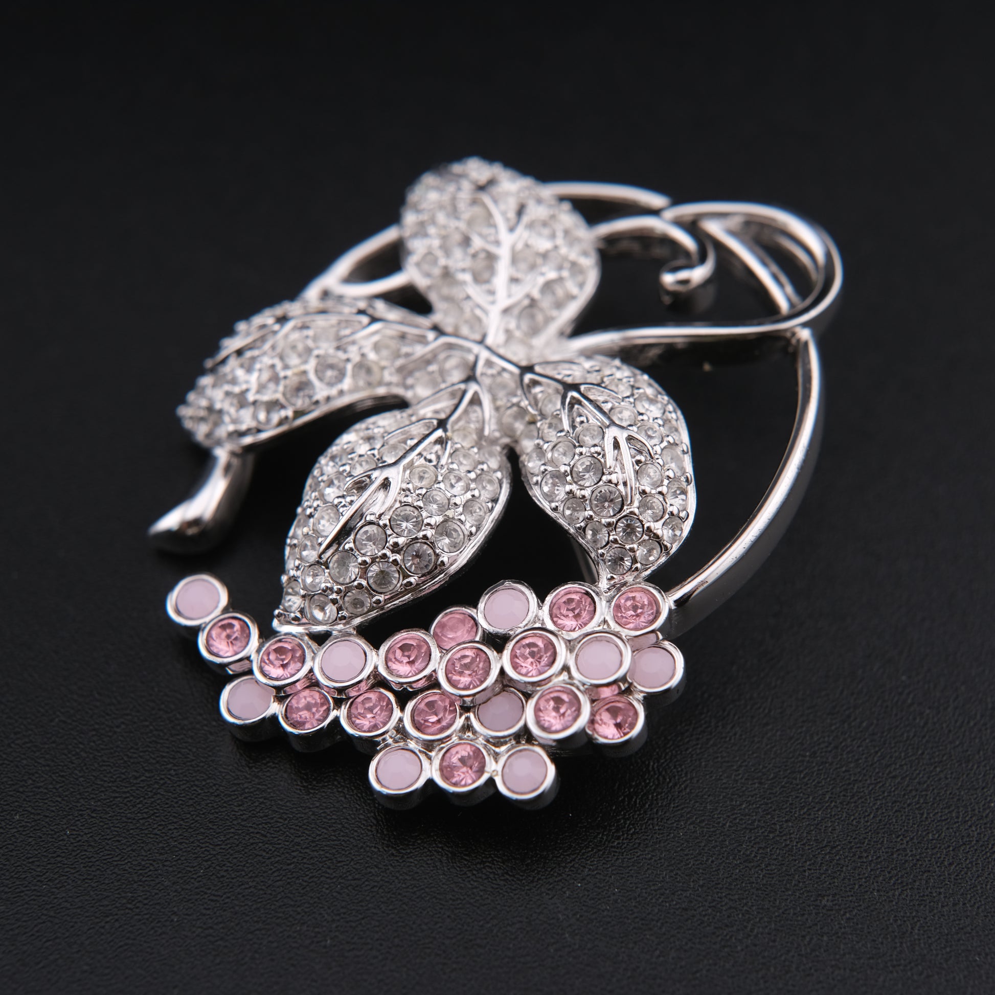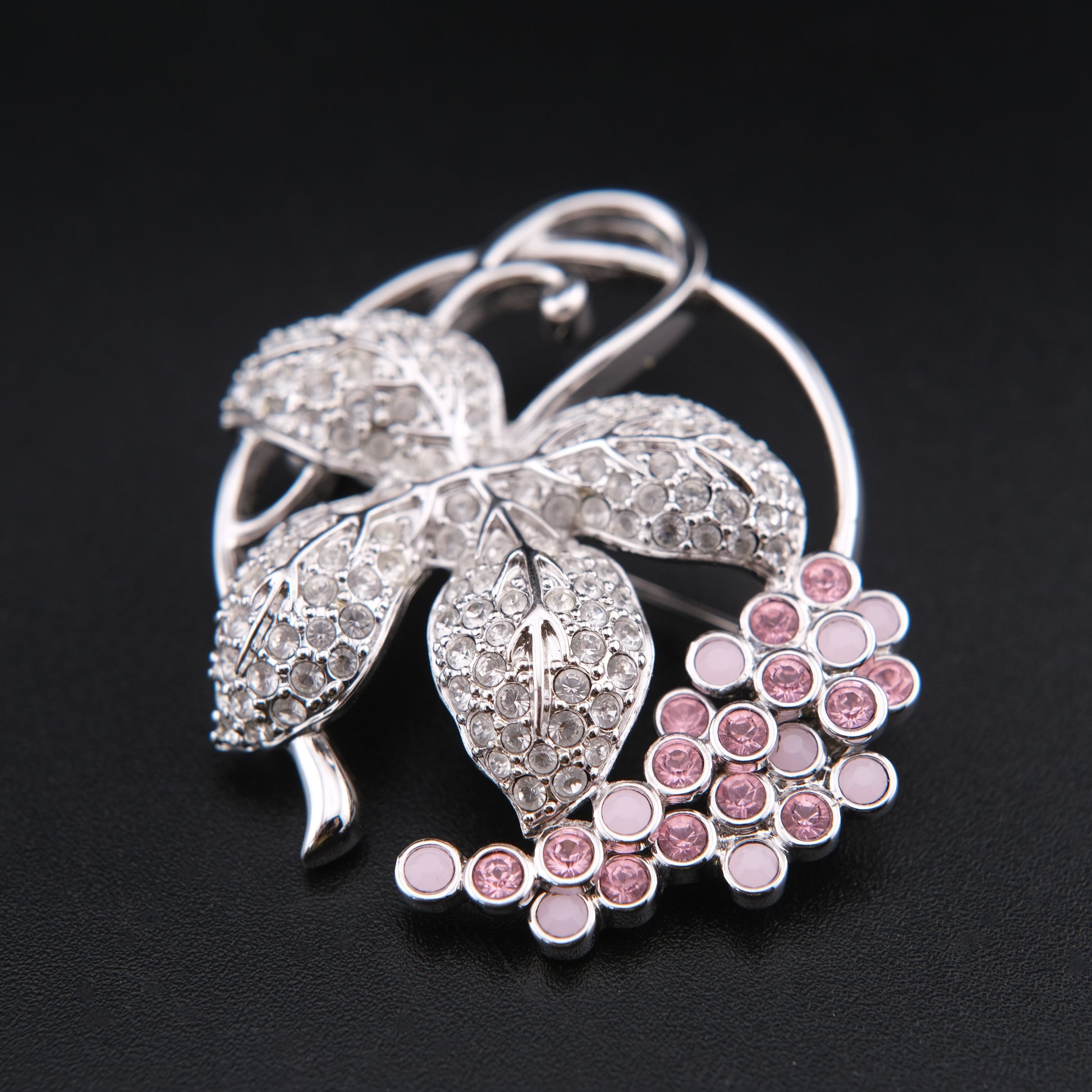 This elegant vintage Swarovski brooch features a refined grape cluster and vine motif, combining crystal-pavé leaves with a cascading cluster of soft pink grape berries. Crafted in a polished silver-tone setting, the leaves are encrusted with clear Swarovski crystals that shimmer beautifully, while the pink crystal and enamel grape cluster adds a gentle pop of color and depth.