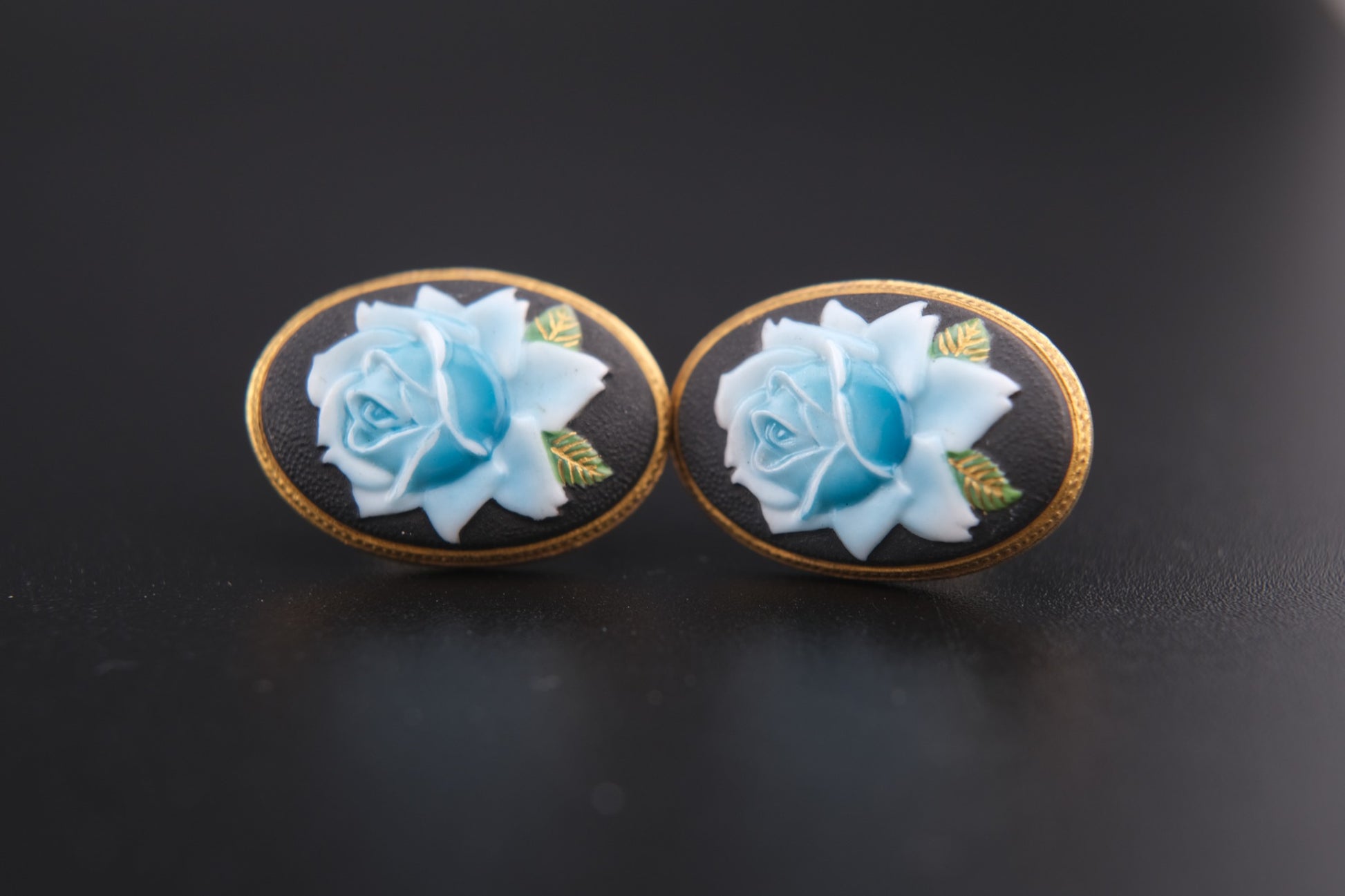 Delicately hand-crafted and undeniably romantic, these vintage Toshikane earrings showcase exquisite Japanese artistry. Each earring features a beautifully raised relief of a soft blue rose against a black background, rendered in fine porcelain with impeccable attention to detail. Encased in a gold-tone oval frame, the vivid blue petals and leafy accents pop with lifelike dimension.