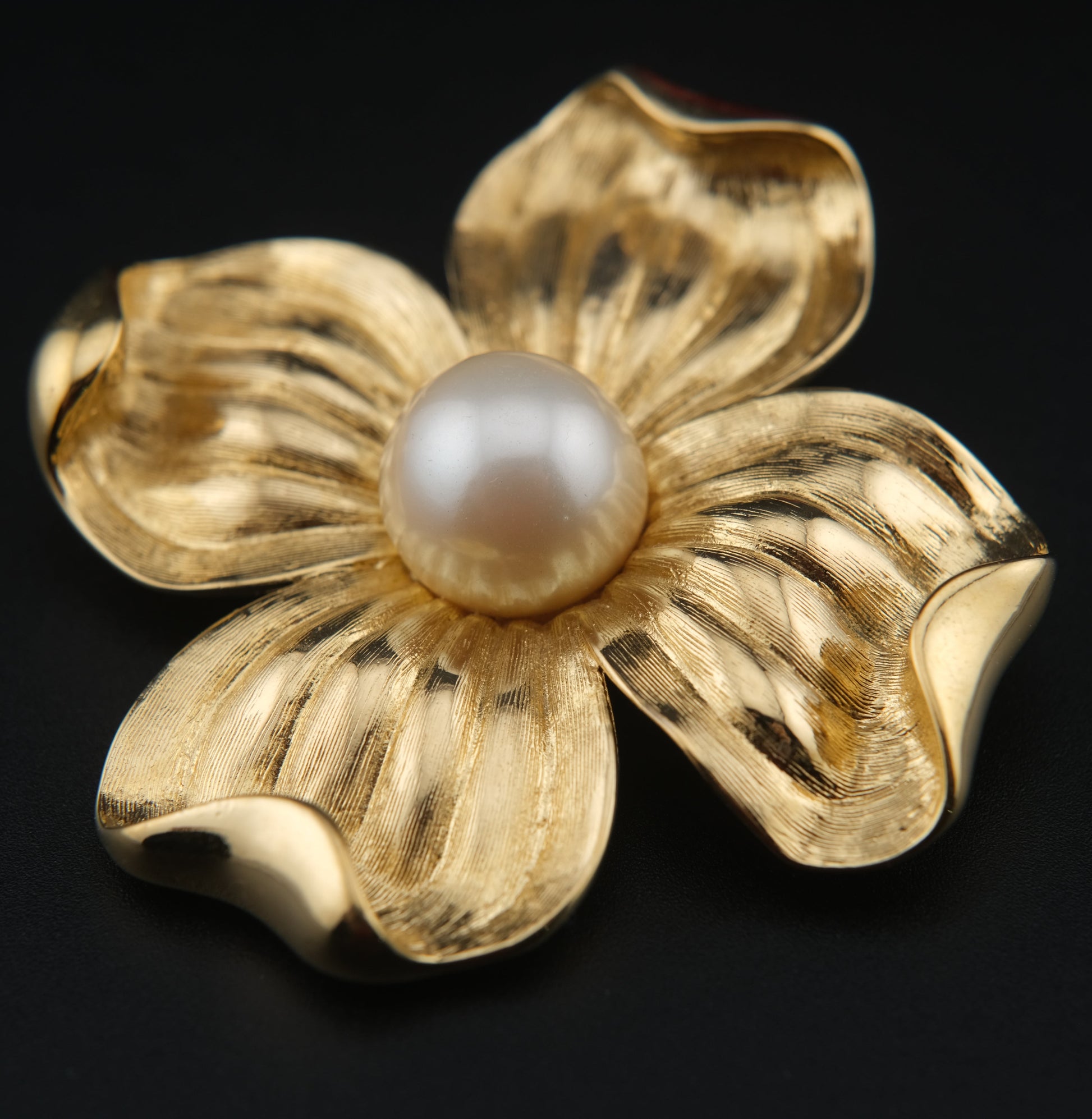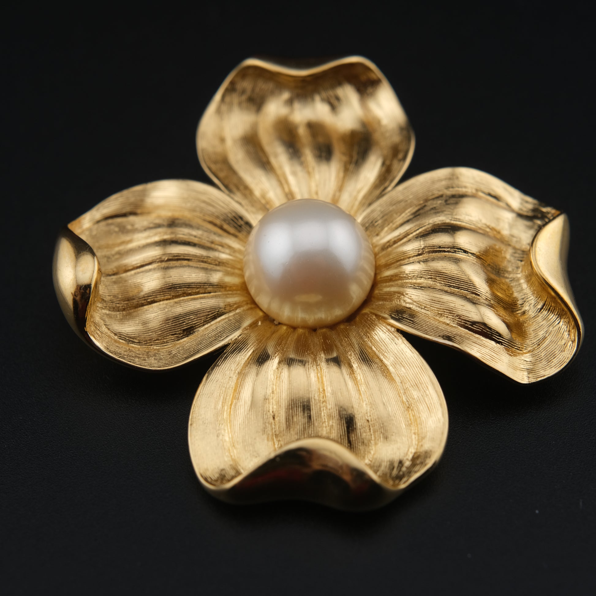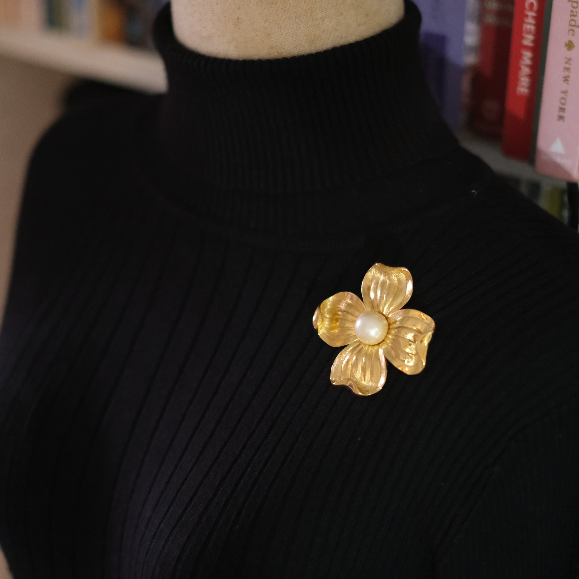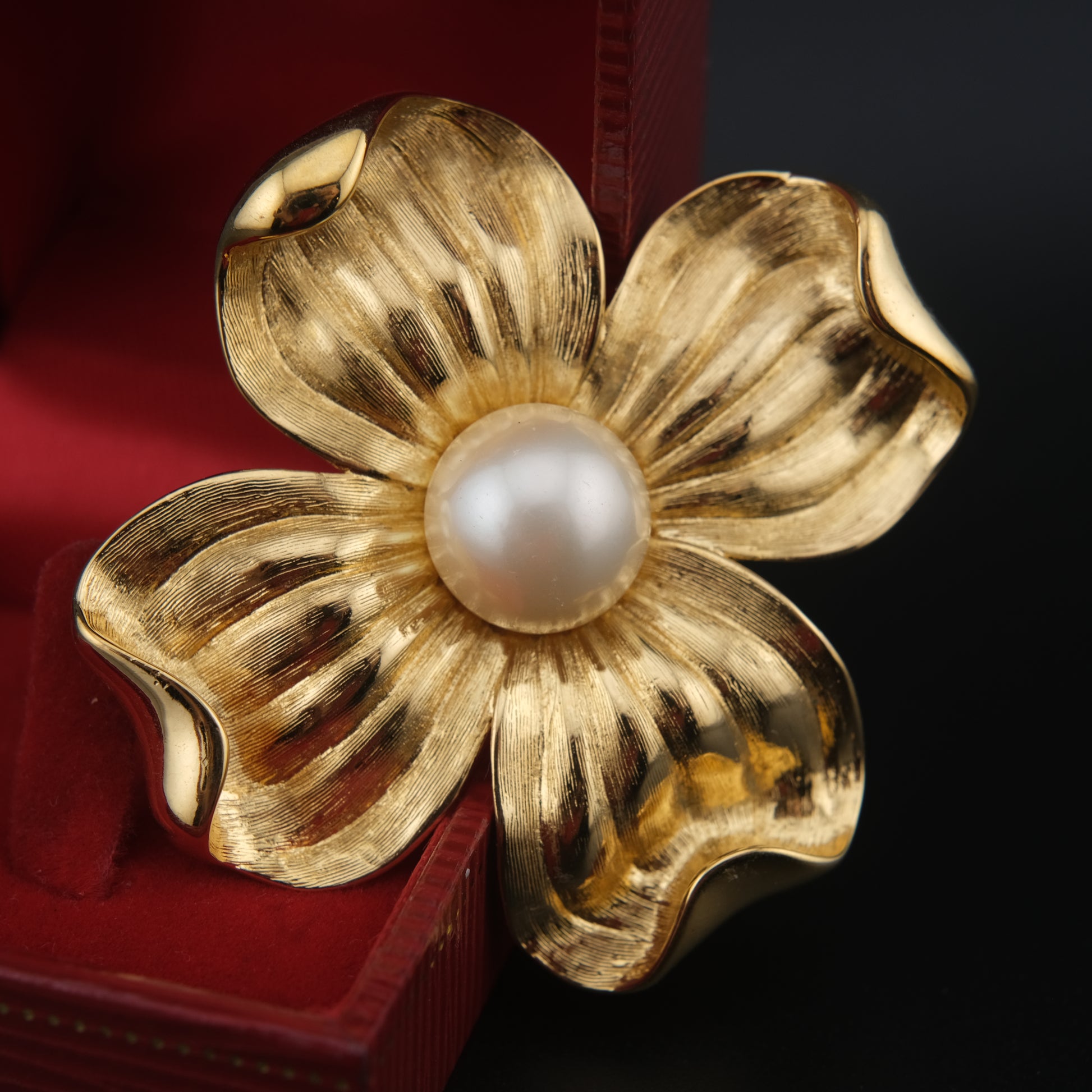 Vintage Trifari Dogwood Flower Brooch – Gold-Tone with Faux Pearl Center
