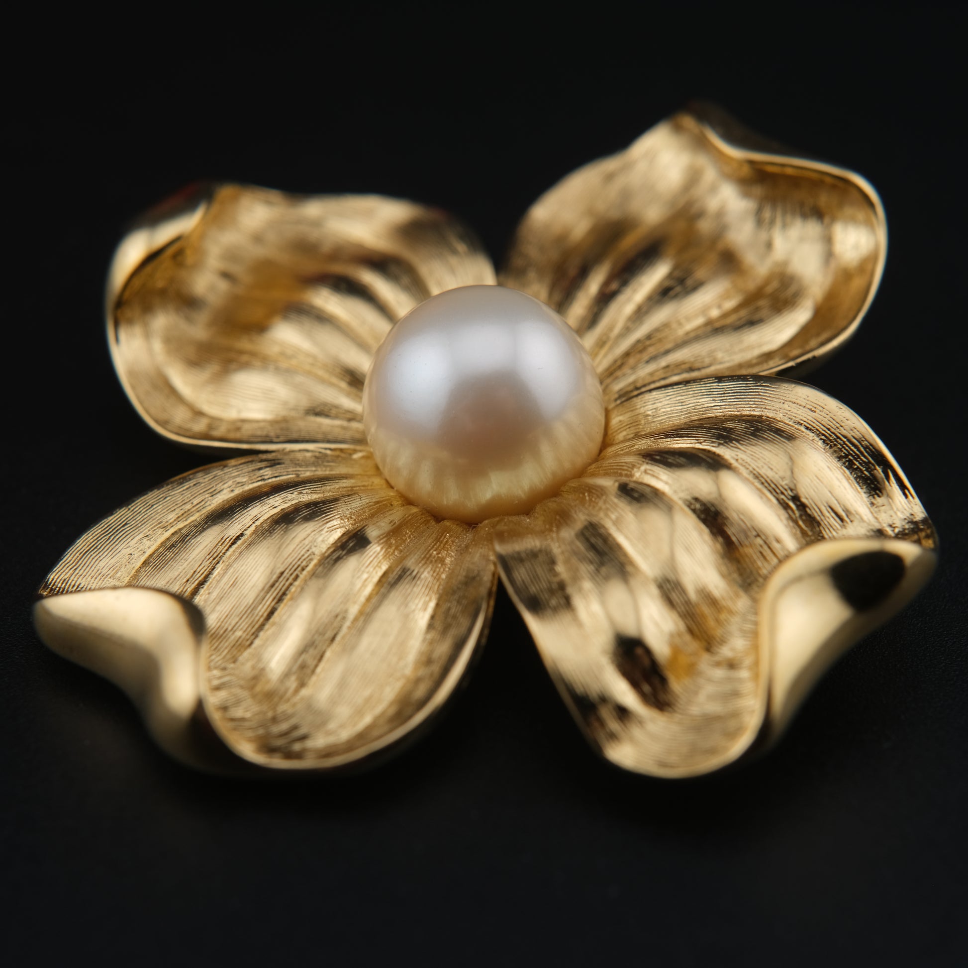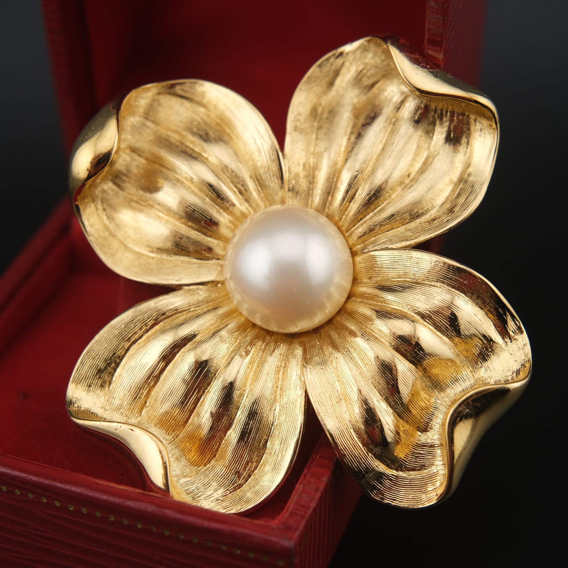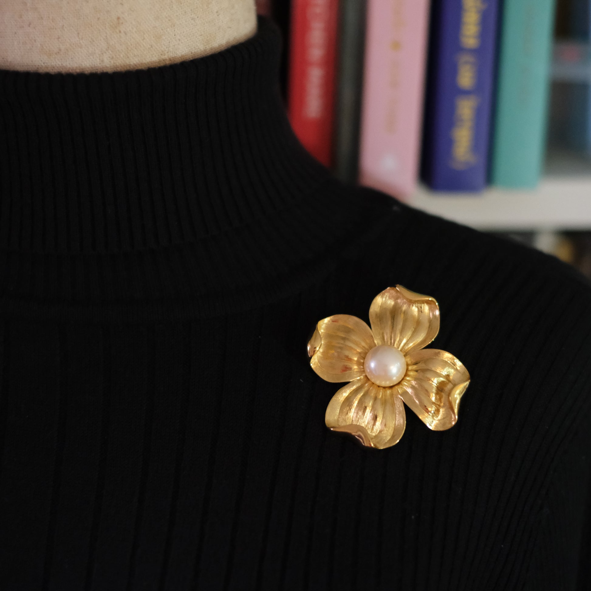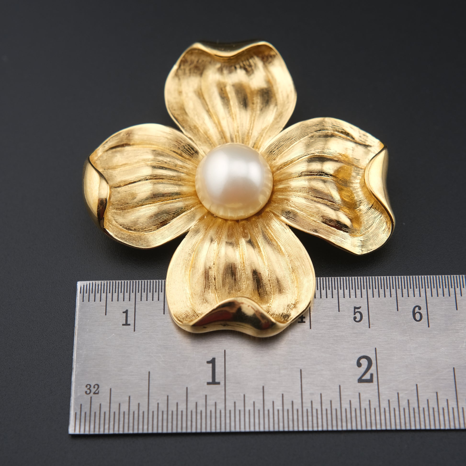 Vintage Trifari Dogwood Flower Brooch – Gold-Tone with Faux Pearl Center