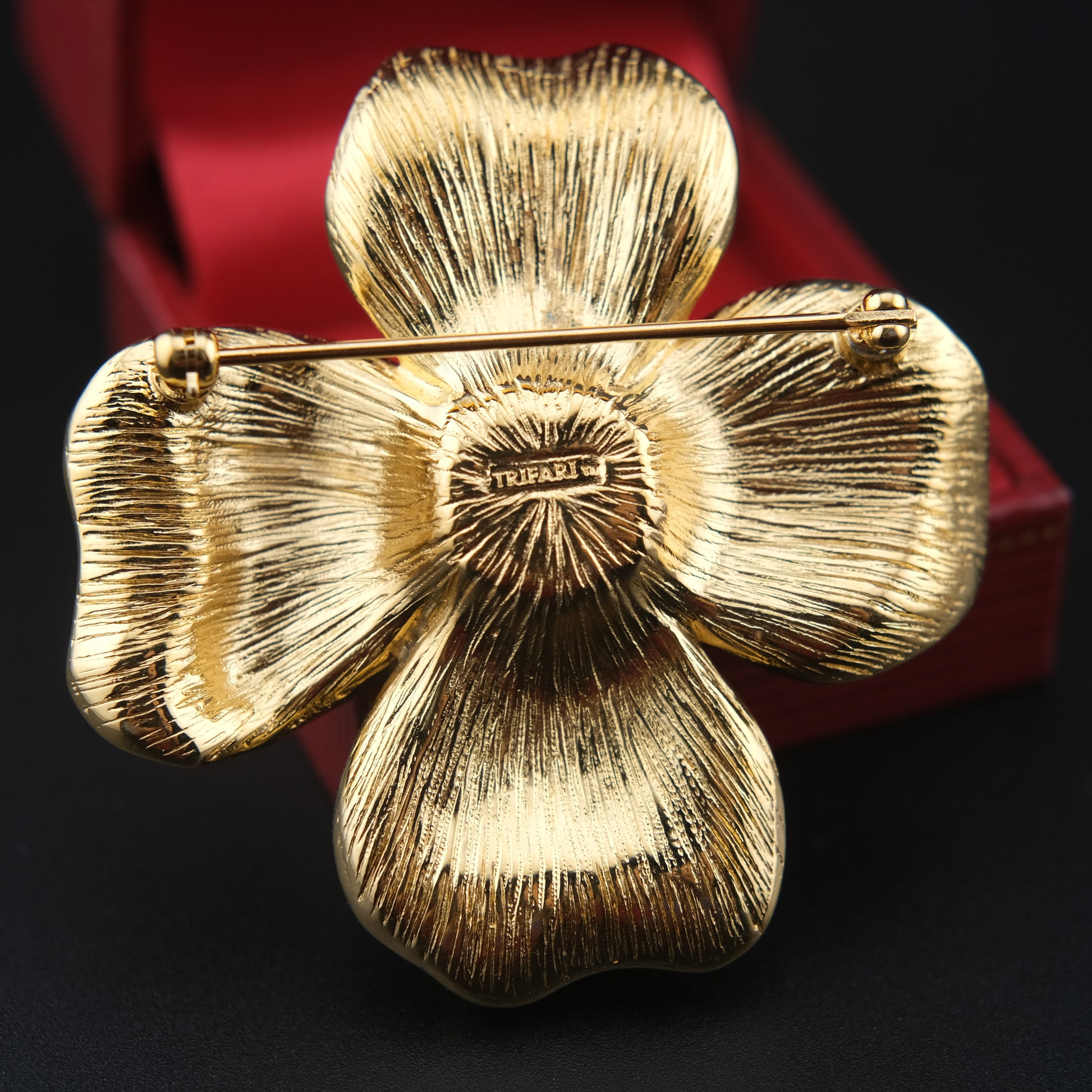 Celebrate timeless elegance with this stunning vintage brooch from Trifari, showcasing a dogwood flower in rich, textured gold-tone metal. The petals feature brushed detailing with polished curled edges for dimensional flair, while a luminous faux pearl center adds a soft, romantic touch. Signed on the reverse, this classic piece embodies the sophistication of mid-century costume jewelry and is perfect for collectors or as a striking accessory to elevate any outfit.