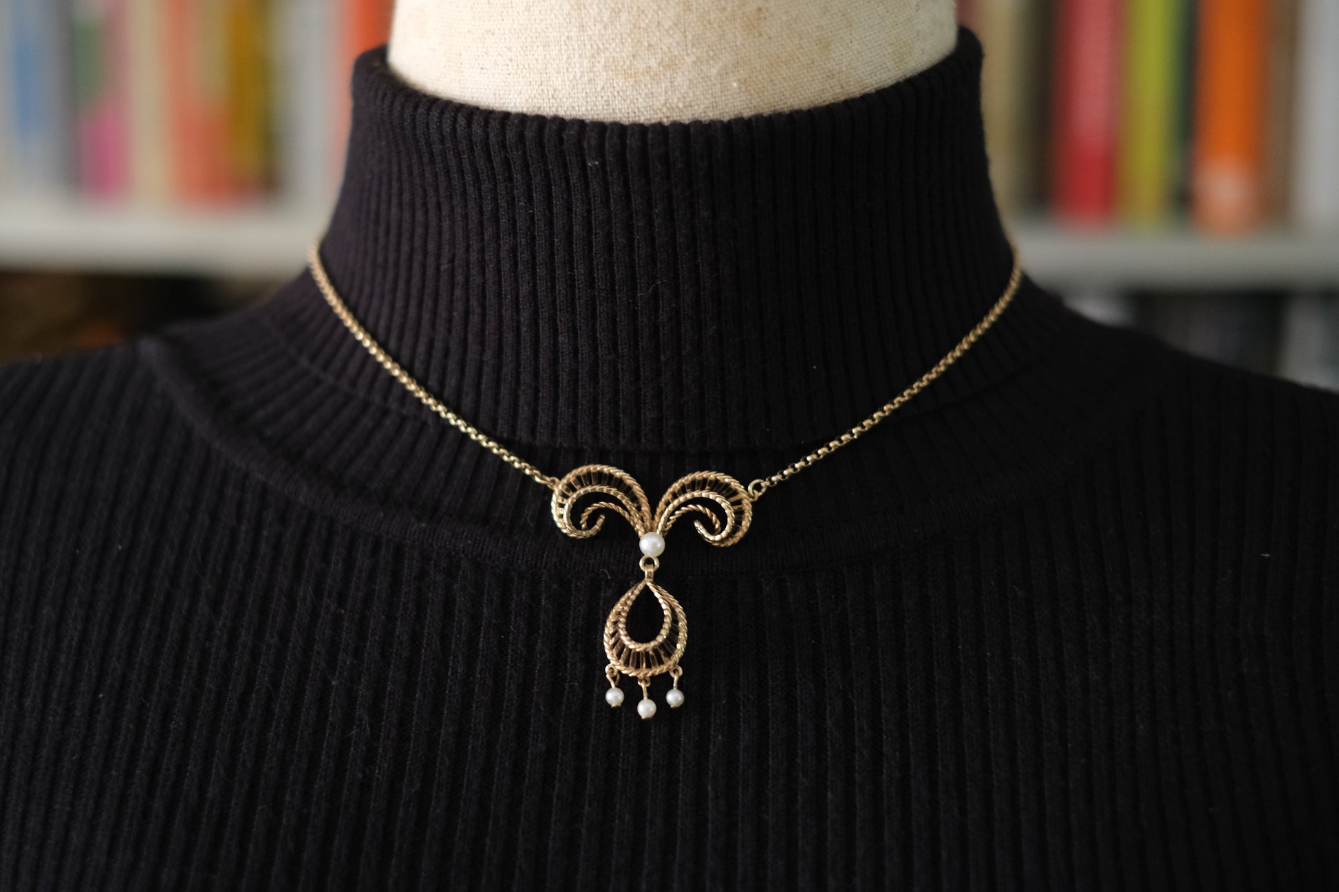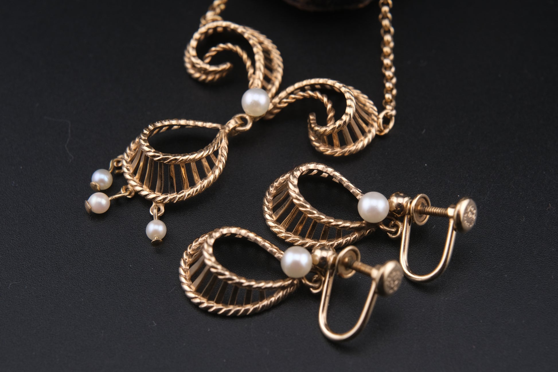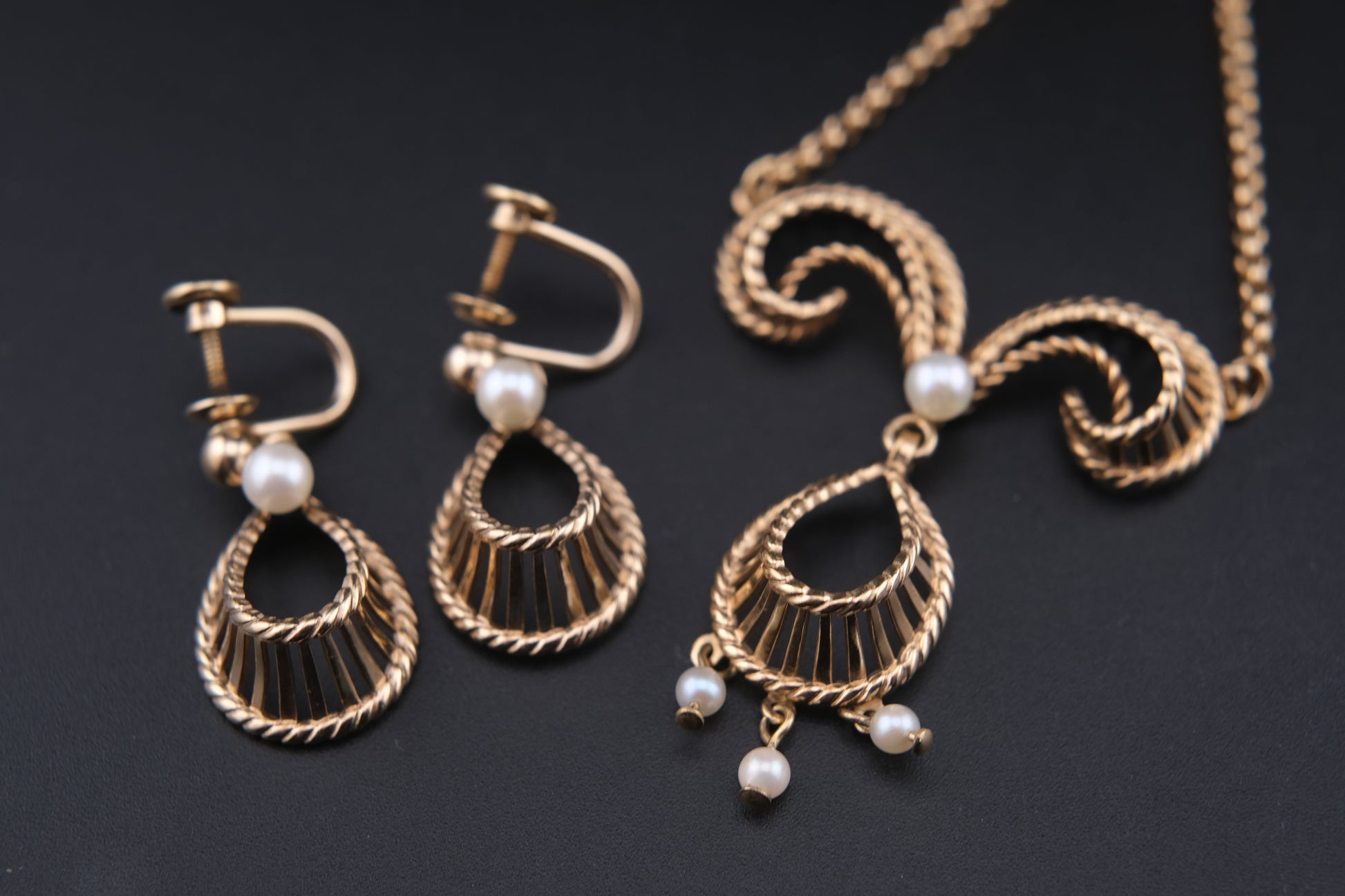 Celebrate timeless elegance with this exquisite vintage jewelry set by Vandell. Featuring a beautifully sculpted pendant necklace and matching screw-back earrings, this set captures mid-century sophistication with its delicate teardrop forms, twisted gold-filled wirework, and luminous faux pearl accents. The airy, openwork design brings a graceful lightness, while the warm gold tone exudes classic charm.
