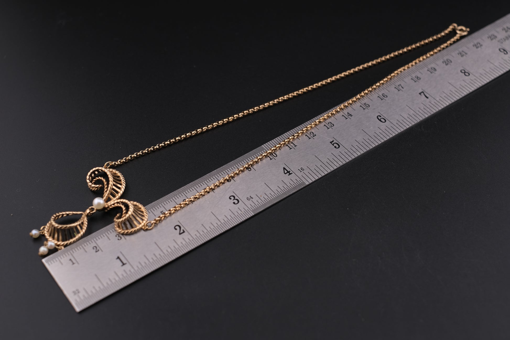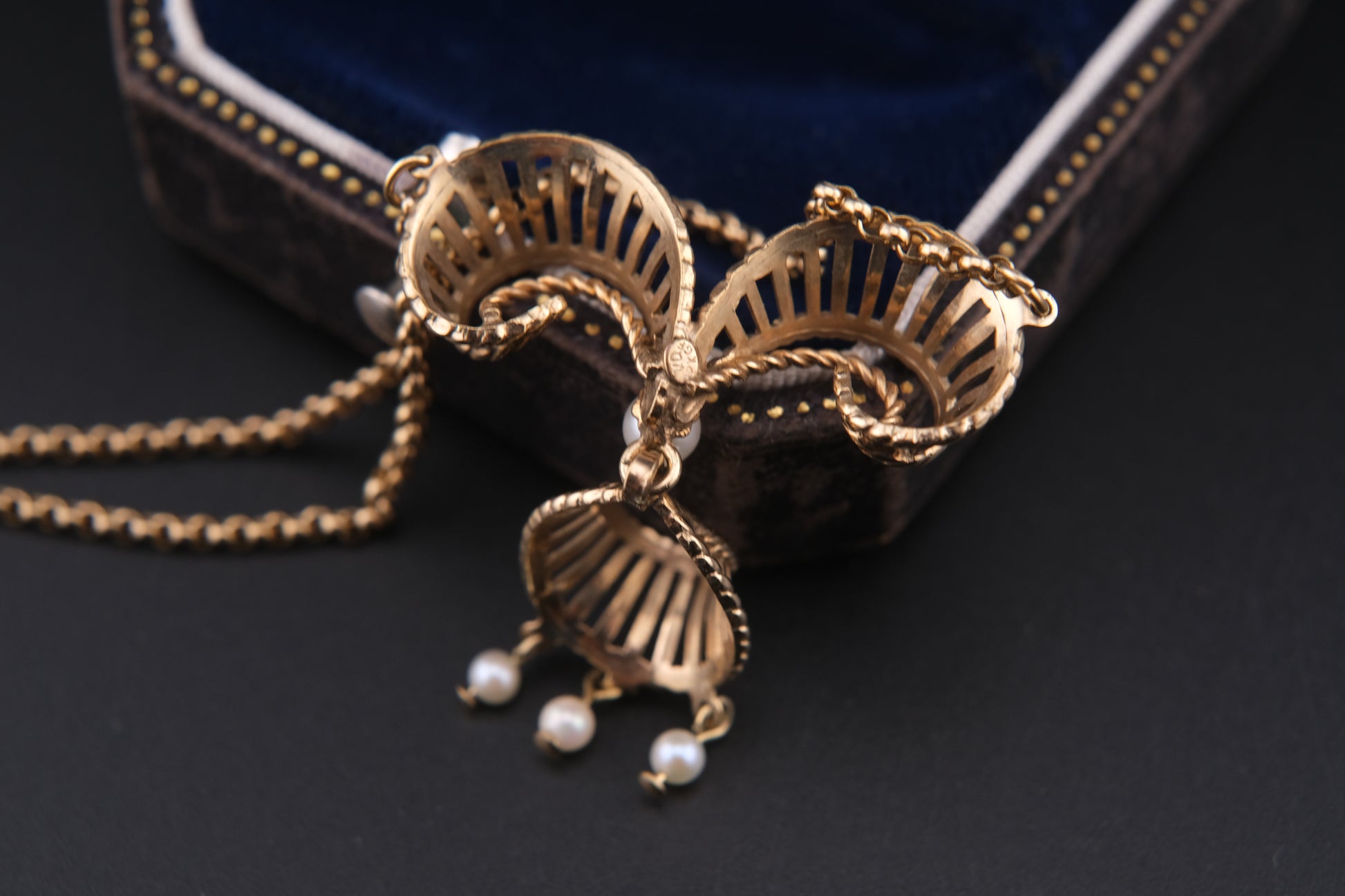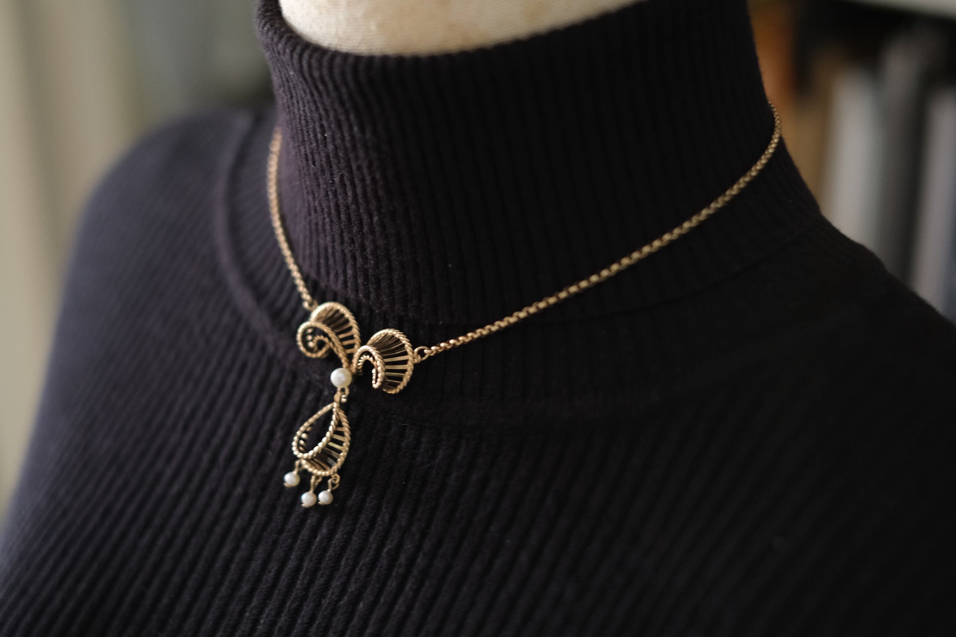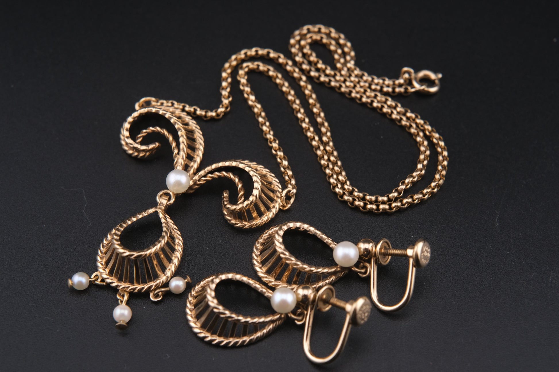 Celebrate timeless elegance with this exquisite vintage jewelry set by Vandell. Featuring a beautifully sculpted pendant necklace and matching screw-back earrings, this set captures mid-century sophistication with its delicate teardrop forms, twisted gold-filled wirework, and luminous faux pearl accents. The airy, openwork design brings a graceful lightness, while the warm gold tone exudes classic charm.