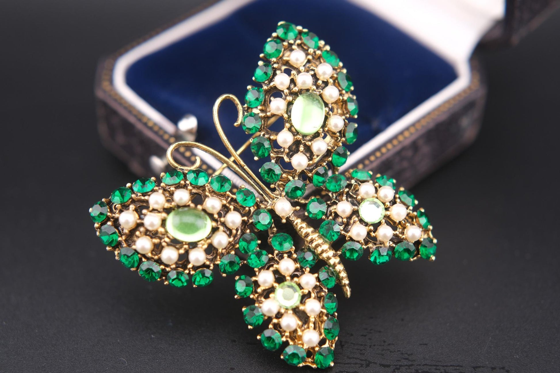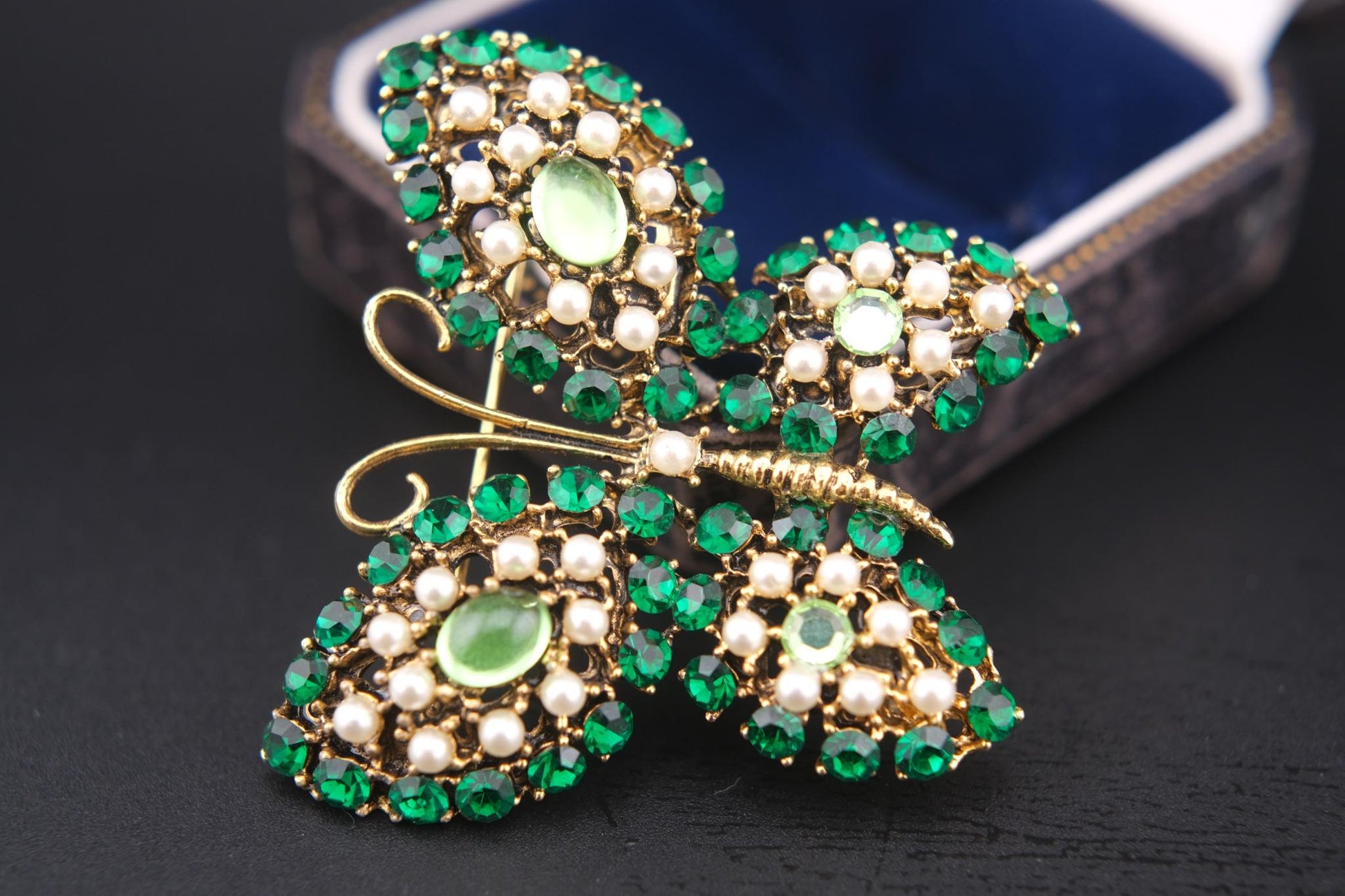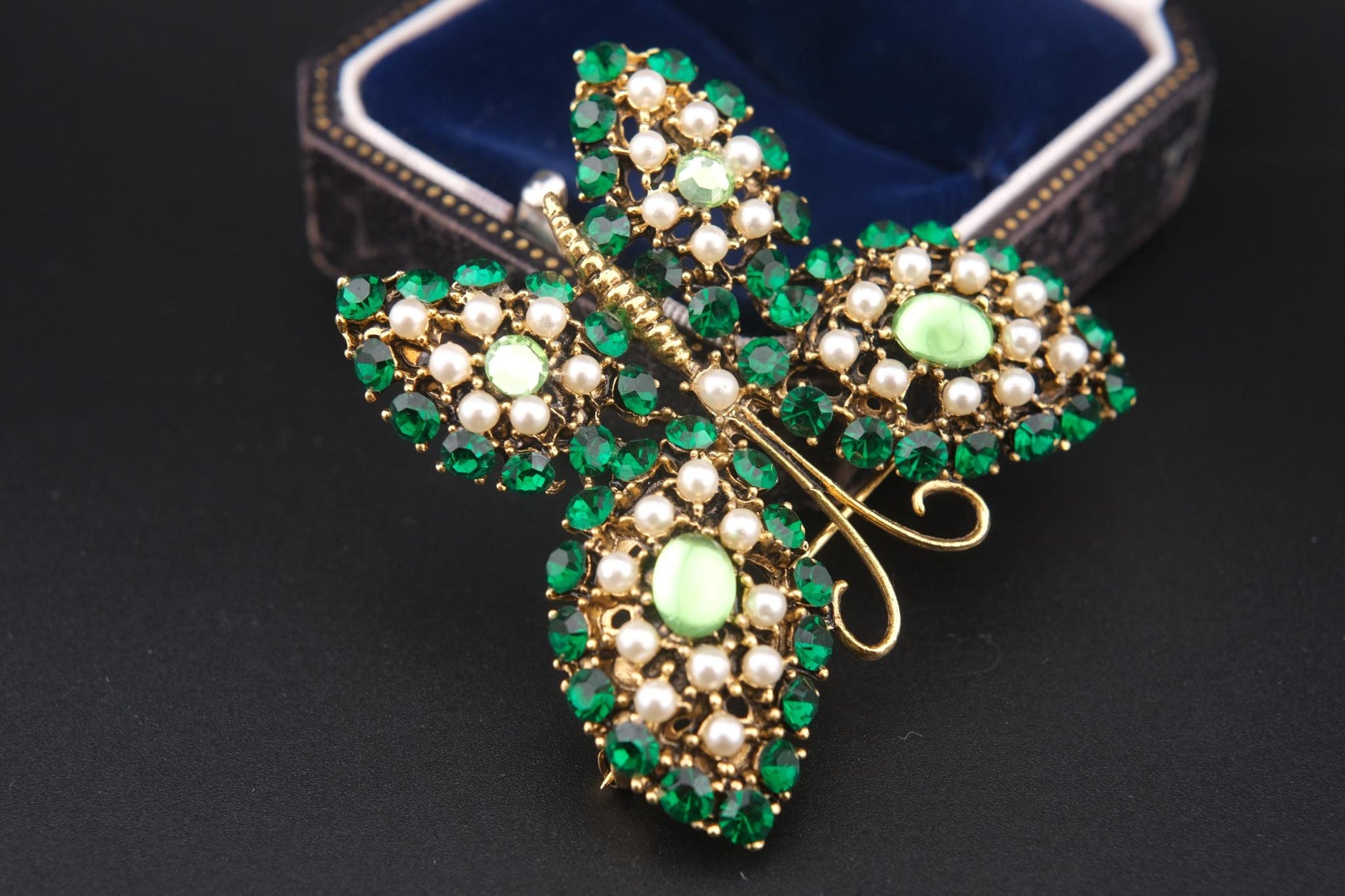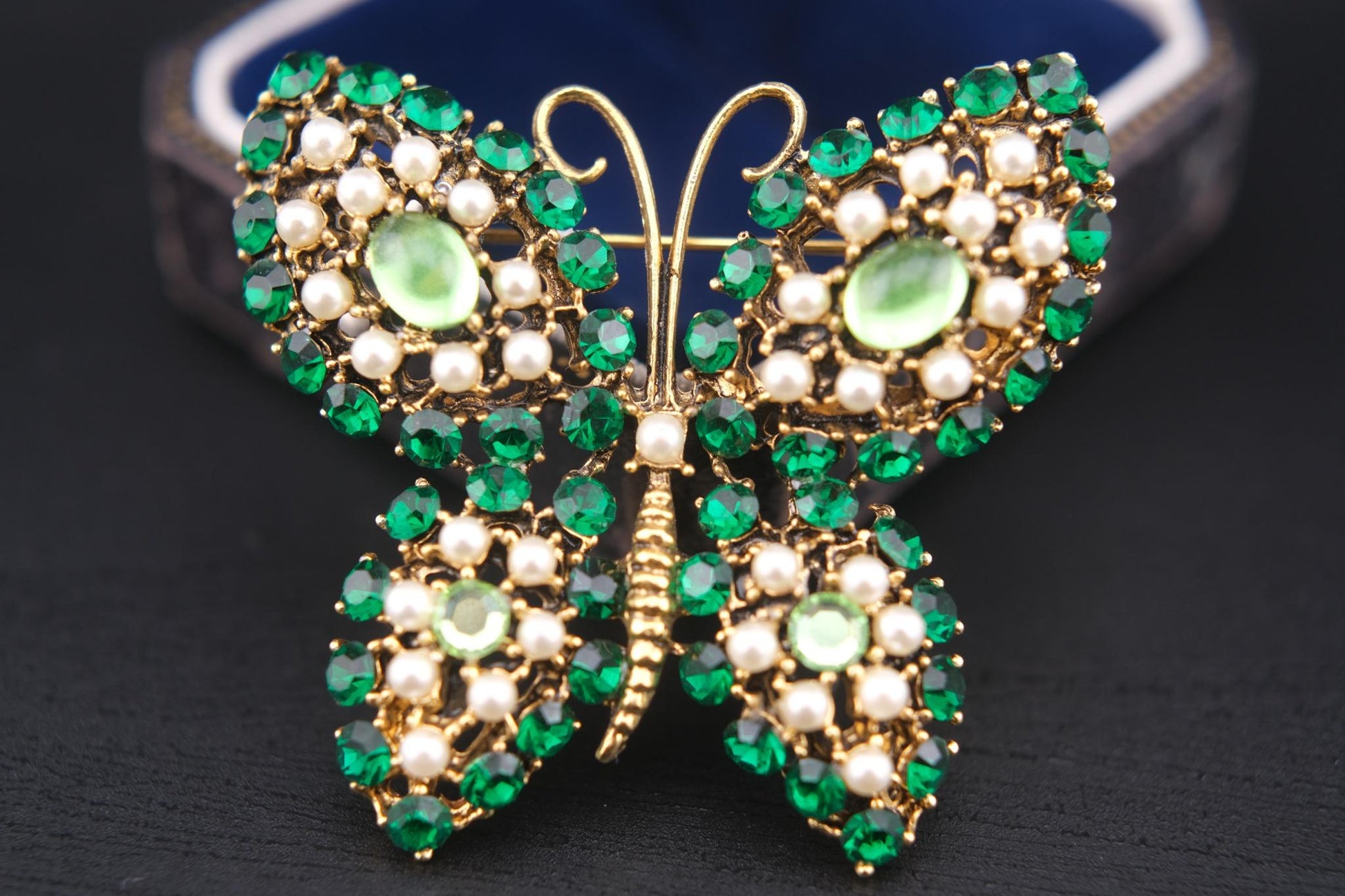 This exquisite vintage butterfly brooch by Weiss showcases the brand’s renowned craftsmanship and timeless appeal. Designed with shimmering green rhinestones, lustrous faux pearls, and a detailed gold-tone metal setting, it captures both elegance and whimsy. A true mid-century collectible, perfect for both jewelry lovers and dedicated collectors.