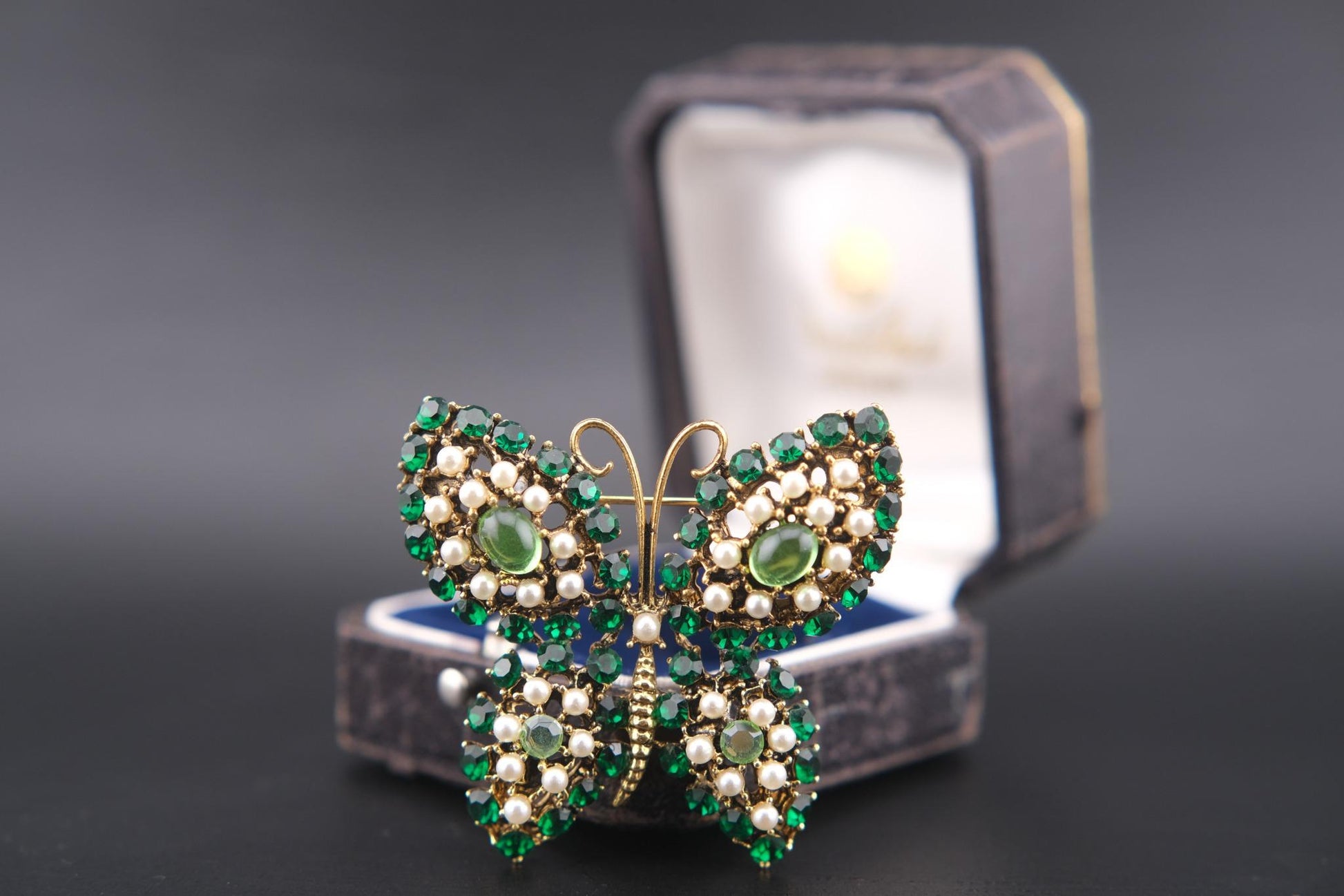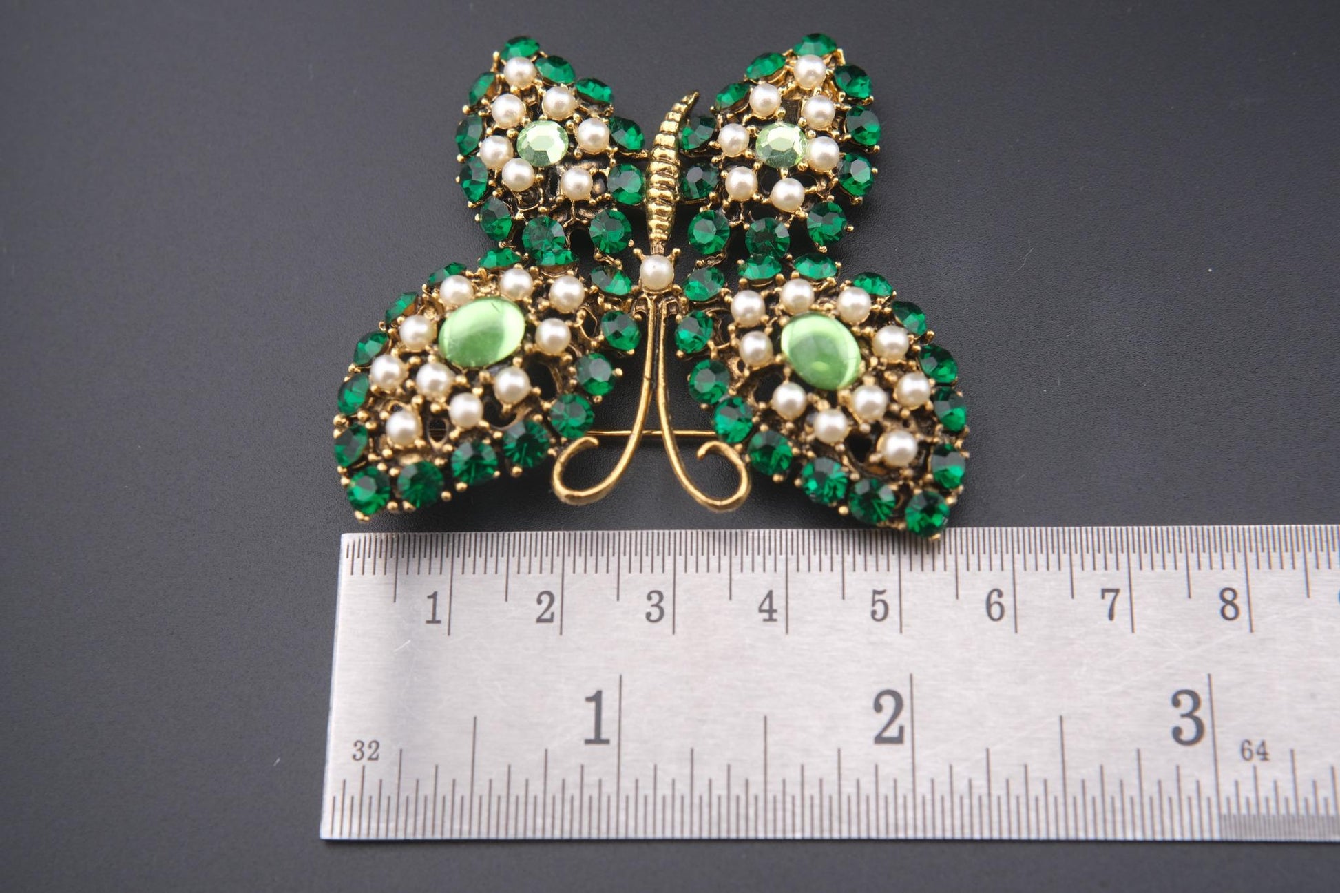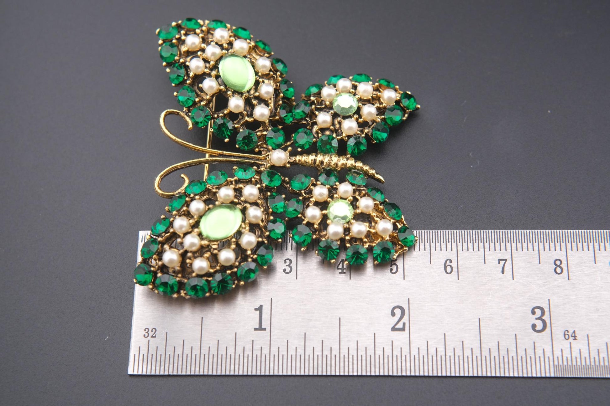 This exquisite vintage butterfly brooch by Weiss showcases the brand’s renowned craftsmanship and timeless appeal. Designed with shimmering green rhinestones, lustrous faux pearls, and a detailed gold-tone metal setting, it captures both elegance and whimsy. A true mid-century collectible, perfect for both jewelry lovers and dedicated collectors.