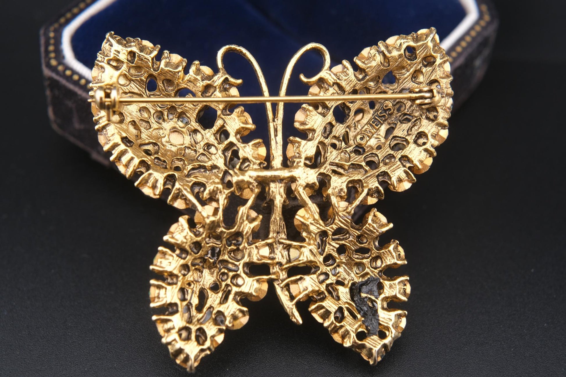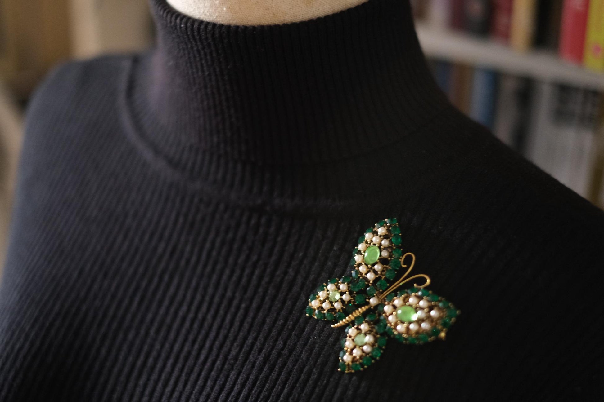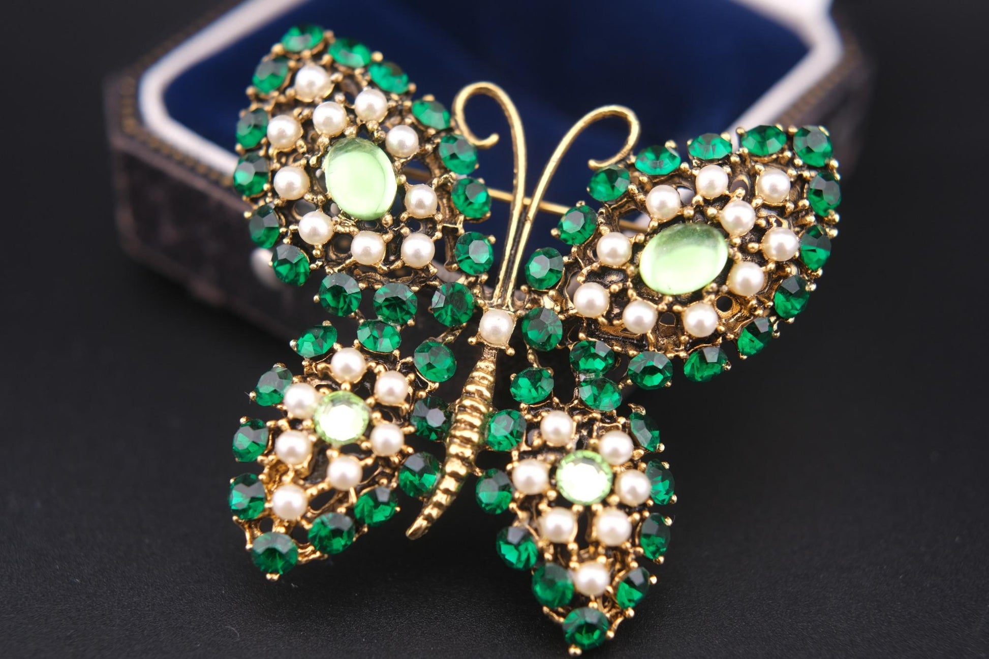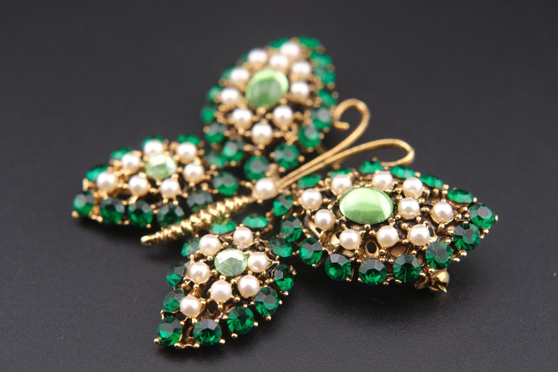 This exquisite vintage butterfly brooch by Weiss showcases the brand’s renowned craftsmanship and timeless appeal. Designed with shimmering green rhinestones, lustrous faux pearls, and a detailed gold-tone metal setting, it captures both elegance and whimsy. A true mid-century collectible, perfect for both jewelry lovers and dedicated collectors.