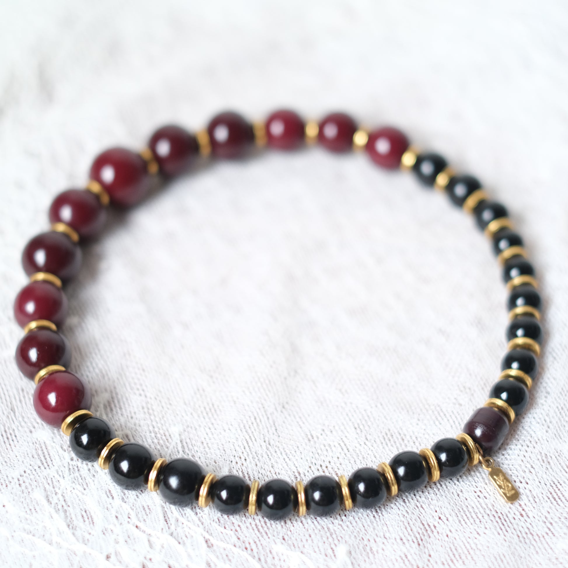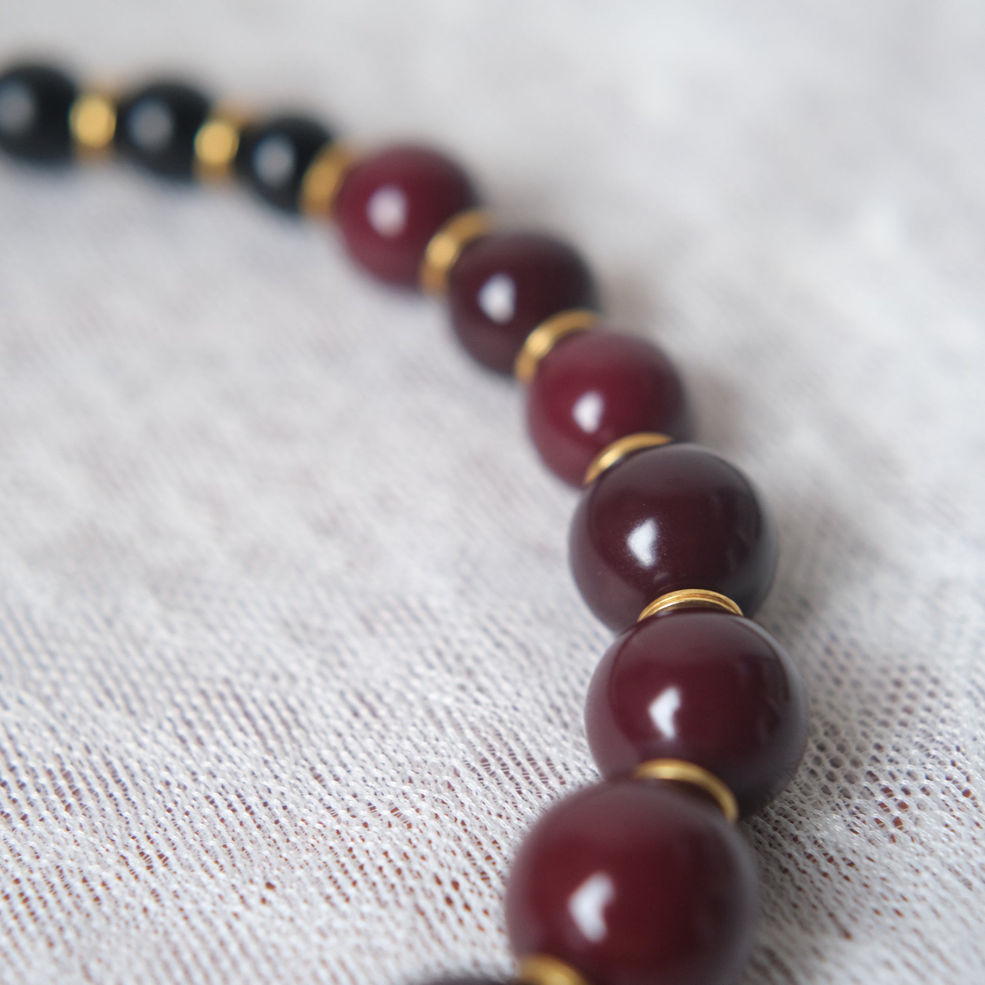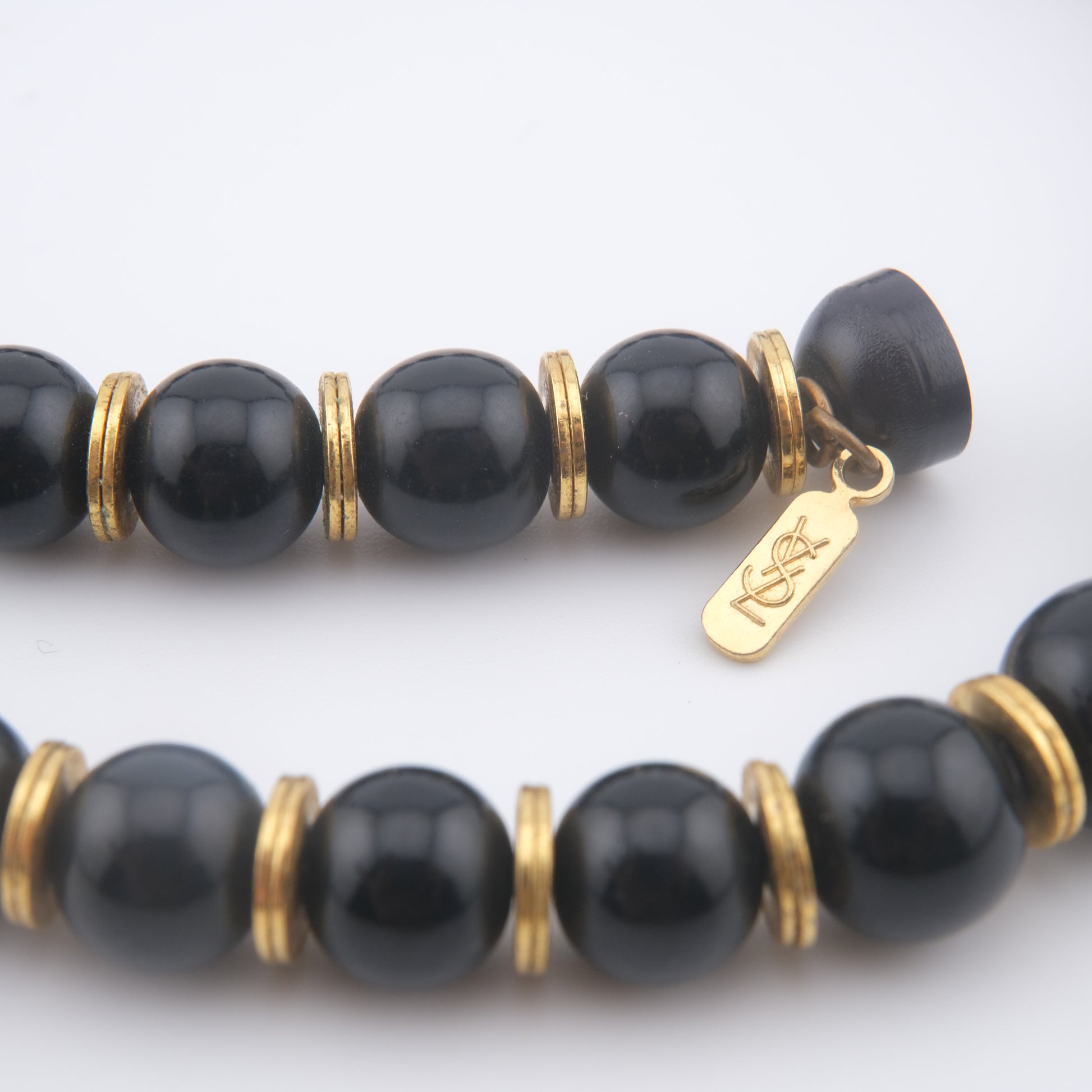 Vintage Yves Saint Laurent Bead Necklace – Black & Deep Red Resin Beads with Gold Accents, 14"
