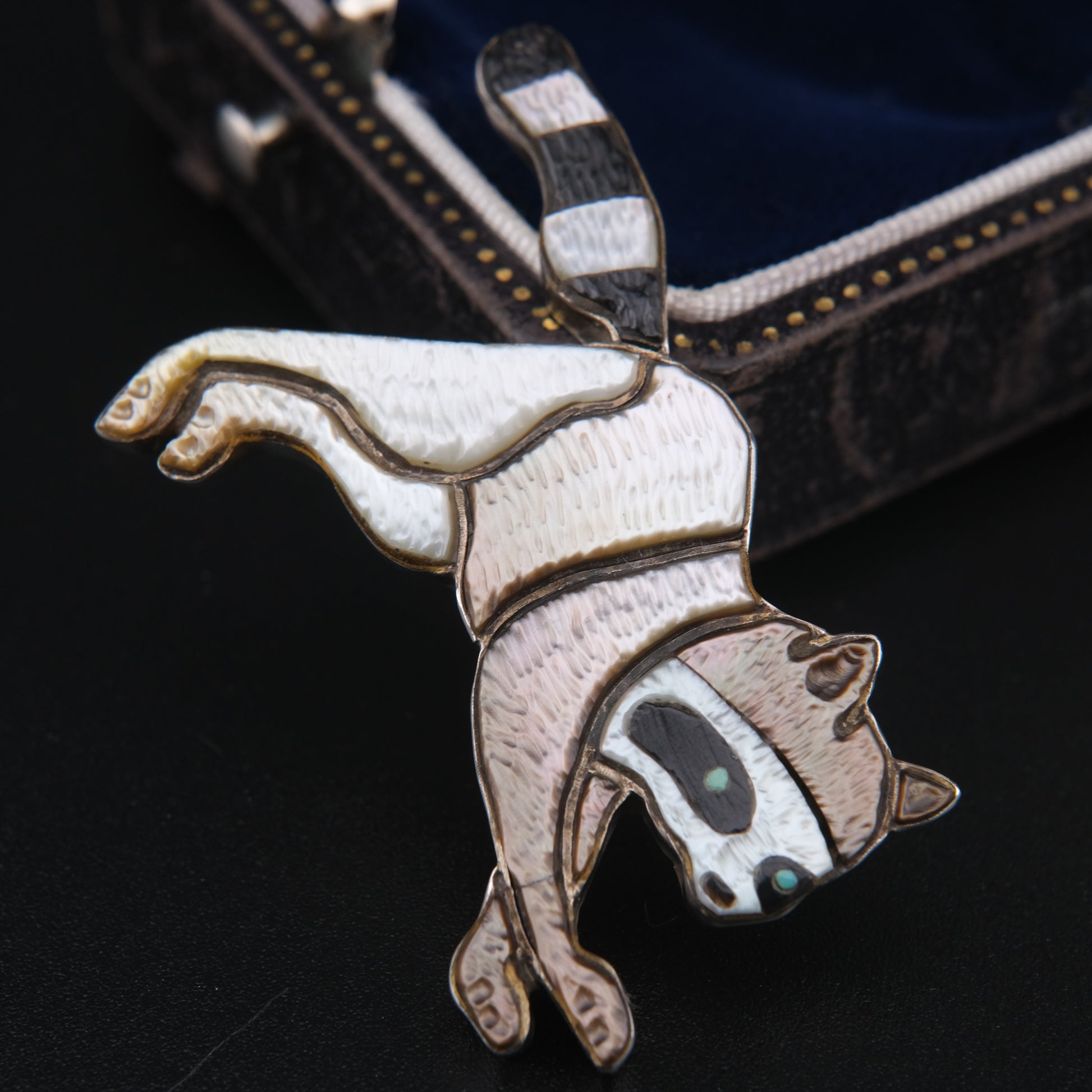 This delightful vintage raccoon piece by Zuni artisan Andrea Lonjose is both a brooch and a pendant—making it as versatile as it is charming.
